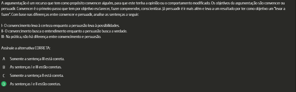 A argumentação é um recurso que tem como propósito convencer para que este tenha a opinião ou comportamento modificado. Os objetivos da argumentação são convencer ou persuadir. Convencer é primeiro passo que tem por objetivo esclarecer, fazer compreender, conscientizar. lá é in mais além e leva a um resultado por ter como objetivo um "levar a. Com base nas diferenças entre convencer e persuadir, analise as sentenças a seguir: 0 convencimento leva à certeza enquanto a persuasão leva à 0 convencimento busca entendimento a persuasão busca a verdade. Na prática, não há diferença entre convencimento e persuasão. Assinale a alternativa CORRE TA: A Somente a sentença III está correta. B As sentenças e III estão C Somente a sentença II está correta. D As sentenças I e II estão corretas.