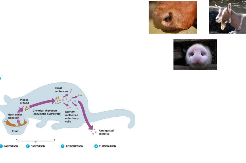 SISTEMA DIGESTÓRIO: BOCA E ANEXOS Função: ✓ Insalivação ✓ Mastigação ✓ Digestão ✓ Absorção ✓ Excreção Boca e anexos: Base óssea, limites da boca e dentes. Constituintes: ✓ Boca e anexos – Dentes, Língua e Glândulas Salivares ✓ Faringe ✓ Esôfago, Estômago e Intestino Delgado e Grosso ✓ Fígado ✓ Pâncreas Divisão: Porções -> pré-diafragmática e pós- diafragmática Classificação quanto a alimentação ✓ Herbívoros: Restrito a alimentos vegetais ✓ Carnívoros: Dieta baseada em carne (Felinos e Caninos) ✓ Onívoros: Dieta mista (vegetal e carne) Suíno, Aves e Humano ✓ Ruminantes: Bovino, Ovino, Caprino ✓ Não ruminantes: Equino, Coelho Planos nos animais domésticos Rostral: suíno Nasolabial: bovino Labial: carnívoros, equinos e pequenos ruminantes Lábios ✓ Auxiliam na sucção ✓ Apreensão do alimento ✓ Órgãos táteis Divisão: maxilar e mandibular Lábios - Duas pregas musculomembranosas que circundam a entra da boca e que se unem nas comissuras labiais. Externamente, o lábio superior apresenta o filtro mediano e inferior, uma proeminência arredondada, o queixo ou mento. Textura e mobilidade de acordo com a forma de alimentação Boca- Espaço delimitado rostralmente pelos lábios e caudalmente pela faringe Função: Apreensão Seleção Salivação Mastigação Defesa Subdivisão Vestíbulo da boca – entre os dentes e os lábios e as bochechas. Cavidade bucal propriamente dita – dos dentes para dentro. Base óssea: osso maxilar, processo palatino do osso maxilar, processo palatino do osso incisivo, mandíbula Delimitações ✓ Rostral: lábios ✓ Dorsal: palato duro e palato mole ✓ Lateral: bochechas ✓ Ventral: assoalho, ápice e corpo da língua ✓ Caudal: arcos palatoglossos e raiz da língua Bochechas Função: condução de alimento até a cavidade oral Estratigrafia : Mucosa,músculo estriado esquelético e glândulas e pele Textura de acordo com tipo de alimentação (papilas bucais - bochecha). Bolsas faciais ou bucais (Primatas e roedores) Papila parotídea Gengivas - parte da mucosa oral que está intimamente unida ao periósteo dos processos alveolares. Nos ruminantes se modifica para formar o pulvino dental. Pálato duro ✓ Rafe palatina ✓ Rugas palatinas ✓ Papila incisiva Pálato mole ✓ Arco palatoglosso ✓ Arco palatofaríngeo Dentes Função: ✓ Corte: (incisivo) ✓ Laceração e Apreensão: (Canino) ✓ Trituração e preensão: (Pré Molares e Molares) ✓ Defesa ✓ Locomoção Coroa: se projeta além do alvéolo; Raiz: contida no alvéolo; Cavidade pupar: no interior; contem vasos, nervos e tecido conjuntivo (polpa dentária); Colo: união entre coroa e raiz, envolvido por gengiva; Formado por substancias mineralizadas (esmalte, dentina e cemento), cuja disposição vai depender do tipo de dente; GONFOSE. Tipos: Incisivo; Canino; Pré Molares e Molares, Classificação quanto a forma: homodonte e heterodonte, Classificação quanto a forma dentária: Monofiodontia, Difiodontia e Polifiodontia Classificação quanto a morfologia da coroa: Braquiodontes (car, su) e Hipsodontes (herb Fórmula dentária Cão: 2 (I 3/3 C 1/1 PM 4/4 M2/3 ) = 42 Gato: 2 (I 3/3 C 1/1 PM 3/2 M1/1 ) = 30 Suíno: 2 (I 3/3 C 1/1 PM 4/4 M3/3 ) = 44 Ruminante: 2 (I0/4 C 0/0 PM 3/3 M3/3 ) = 32 Equino: 2 (I 3/3 C 1/1 PM 3(4)/3 M3/3 ) = 40(2) Língua Localização: no assoalho da cavidade oral propriamente dita, entre os ramos da mandíbula Divisão: raiz (base, fixo); corpo e ápice (móvel) Função: ingresso de alimentos sólidos ou líquidos (principalmente bovinos), órgão sensitivo (tátil, degustação, dor, temperatura), deglutição, ajuda na mastigação, limpeza da pele, perda de calor (principalmente cães) ✓ Constituída por músculos intrínsecos e extrínsecos, revestida por mucosa; ✓ Musculatura intrínseca: dá forma à língua; composta por lâminas longitudinais e perpendiculares; ✓ Musculatura extrínseca: dá mobilidade à língua (retração e exteriorização): → M. genioglosso: liga a mandíbula à língua; → M. hioglosso: liga o hióide à língua; → M. estiloglosso: liga o estilóide do hióide à língua; Papilas - elevações na mucosa. Podem ser: Mecânicas: filiformes, cônicas (rum, car e sui) e lentiformes (rum); Gustativas: valadas, fungiformes e foliáceas (eq, car e sui) Glândulas Salivares 1) Parótidas – próxima à orelha, caudal ao ramo da mandíbula. Ducto parotídeo desemboca no vestíbulo bucal. 2) Mandibulares – o ducto desemboca na carúncula sublingual. 3) Sublinguais – entre o ramo da mandíbula e a língua. Faringe - órgão comum aos sistemas digestório e respiratório. Tem formato quase afunilado: grande extremidade rostral (base) – Cavidade nasal e Oral e pequena extremidade caudal (ápice) - Esôfago. Divisão: 1. Nasofaringe; 2. Orofaringe e 3. Laringofaringe. Comunicações Orofaringe (01); Cavidades nasais (02); Tubas auditivas (02); Laringe (01); Esôfago (01).