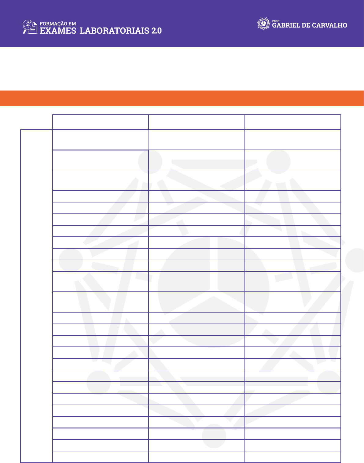 . TABELA DE VALORES IDEAIS DE EXAMES LABORATORIAIS Marcador H EM O GR A M A L EU CO GR A M A Eritrócitos Hematócrito Ferritina TIBC (capacidade total de ligação de ferro) Hemoglobina VCM B12 Linfócitos CHCM Holotranscobalamina Monócitos VSG Homocisteína Basófi los HCM Ácido Fó1ico Rel. Neutrófi los/Linfócitos RDW Ácido metilmalônico Eosinófi los Saturação Transferrina Leucócitos Plaquetas Transferrina Livre Neutrófi los Valor de referência= H: 4,5-6 × 106/mm³ M: 4-5,5 × 106/mm³ H: 39-52% M: 36-47% H: 30-300 mcg/ L M: 30–200 mcg/L 240 e 450 mcg/dL H: 13 – 17 g/dL M: 12 – 15,5 g/dL 80-98 fl 300-900 na/L 900 a 2900/mm3 31-36 a/dL > 50.00 prnol/L 100 a 1000/mm3 < 15mm 3-14 rncrnol/L 25 a 80/mm3 26-34 oc/célula >3,9 ng/ml 50 a 500/mm3 11 5 a 14,5% 20 a 50% 3500 a 10500/mm3 150 000 a 450 000 /mm³ 212–360 mg/dL 1700 a 7000/mm> 45 a 55% Valor Ideal** H: 4,5 - 6 M: 4 - 5.5 H: 42 a 48 M: 39 A 47 50 a 150 (ideal >70) 300-400 H: 14 a 16 M: 13,5 a 15,5 88 a 92 500-900 25 a 35% 31 a 35 >60pmol/L 3 a 8% < 10mm-1 hora 5-9 mcmol/L <0,5% 27 a 33 10-17 1-1,5 11,5 a 13 <220mmol/L <1% 25 a 40% 4000 a 6500 250000 a 300000 . Marcador PE R FI L M ET A BÓ LI CO C A R D IO VA SC U LA R Glicose jejum TTG Glicose 1h após 75g Rel LDL/HDL Insulina TTG Insulina 1h após 75g HOMA-IR (Ins x Glu/405) CT Rel CT/HDL HbA1C TTG Glicose 2h após 75g Triglicéridos Lp-PLA2 Adiponectina Pró-insulina TTG Insulina 2h após 75g Homa beta 20 x insulina jejum ÷ glicose jejum (mmol/L*) - 3,5 * mg/dL para mmol/L, multiplica-se por 0,0555 Valor de referência= 70 a 110 mg/dL 120 a 180 mg/dL 5 a 25 mcUI/mL 29 a 88 mcUI/mL inferior a 2,15 <200ma/dL 4,7-8,5% 85 a 140 mg/dL < 250 mg/dL 120 a 342 ng/ml 1,5 a 25 00 mcg/ml hasta 19,1 pmol/L 22 a 79 mcUI/mL entre 167 e 175 Valor Ideal** 75-90 (<100mg/dl en DM) Até 140 <2,3 <6 - Máximo 11 (<25 em DM Até 50 <1 <200mg/dL (>240=alto) <3,3 <5,4 (<6,5 em DM) Similar ao jejum <100mg/dl <201ng/ml >15 mcg/ml <10pmol/L Até 25 Ao redor de 100 (só utilizar este índice em pacientes insulino resistentes) HDL Rel TG/HDL LDL H: >45 mg/dl M: > 40 mg/dl <2,5 <130mg/dl H: 50-73 M: 60-93 H <1,38 M <1.15 <100mg/dl 130-159limite >190 muito alto ApoA 1 LDL oxidado ApoB/ApoA-1 ApoB Fribrinogênio Lp(a) H: 88-180 mg/dl M: 98-210 mg/dl Negativo: < a 20,0 EU/ml Positivo: > 25,0 EU/ml H: 55-151 mg/dl M: 44-148 mg/dl 150-350 mg/dl <30 mg/dl_ H: >130 M: >145 Negativo: H <30 | M <45 H <0,69 M <0.59 <100 <250mg/dL=risco baixo 250-400 médio risco >400mg/dL-=alto risco <15mg/dL=baixo risco 15-30=médio >30mg/dL=alto risco . Marcador PE R FI L M ET A BÓ LI CO / CA R D IO VA SC U LA R PCR ultrassensível TGO Coenzima Q10 Albumina sérica T3 total Fosfatase Alcalina TGP Bilirrubina Total Valor de referência= < 0,5 mg/dl 0-35 U/l 36 a 150 U/l 0-35 U/l 0 3-1,2 mq/dl/dia Valor Ideal** 0,1-0,7mg/dL=baixo risco 0,8-1,1=leve 1,2-1,9=moderado 2-3,8=alto >3,9=muito alto 10-20 >1 µmol/L 4 120 a 160na/dl >50 10-20 Máximo 1,2 Mieloperoxidase Ácido Úrico Ureia (proporcional a ingestão de proteínas) Microalbuminúria T4 livre Gama GT (relacionar com Radicais Livres ou metais tóxicos) Baixo risco <470pmol/L Médio risco 470 – 539 2,5-8 mg/dl 25-45 mg/dl < 30 mg/24 h Alb/creat< 20 mcg/24 h 0,7 - 1,9 ng/dl OU 7 -19pg/ml 0,40 a 1,10 µmol/L 3 5-5,4 q/dl 80 a 200 na/dl 8-78 U/l <470pmol/L >0,31 ou > 3,1 ou > 31 cfme unidade utilizada Negativo = o importante é dar abaixo do valor 294-536 mcg/g de creatinina 294 – 536 mcg/L 8 a 13 – ótimo 11,5 Negativo = o importante é dar abaixo do valor H:<4,9 mg/dl M:<3.9mg/dl 35-45 <8mg/g creat. (ideal ZERO) 0,9 a 1,3ng/dl 10-20 PE FI L TI R EO ID EA N O TSH T3 livre T4 total T3 reverso(sem função) Rel. T3 total/T3 reverso Iodo no plasma Rel. T3 livre/T4 livre Anticorpos –Anti-TG Iodo Urina Iodo Salivar Tiroglobulina (se alta = def iodo) Anticorpos –Anti-TPO (anticorpos anti- tireoperoxidase) < 34 U/mL – cfme lab < 100 U/mL – cfme lab 51,00 a 536 mcg/g de creatinina 51,00 a 536 mcg/L 40ng/ml 52 a 109 mcg/L 0,3 a 4,2 mcUI/ml 2,5 a 3,9 pg/ml 0,45 a 4,5 mUI/l 0 1 a 0,35 ng/ml 1 a 2,5 3 a 3,4pg/ml 1,5-2,5 0.1 a 0.25 =6 ? . Marcador A D R EN A L A D EQ U A ÇÃ O C A LC IO M IN ER A IS E V IT A M IN A S Cortisol sérico acordar 25-hidroxi 03 Ácido fólico Vitamina C Total Zinco sangue Sódio Zinco sérico (soro/plasma) Cortisol total Rel. 1,25-03/25-03 PTH intacto Creatinina urina 15-65pg/ml 900 a 2000 mg/24h Cortisol tarde Cortisol noite Cortisol salivar: 1,25-dihidroxi 03 Magnésio soro Cálcio urina 25-65oa/ml 1,7-2,4mg/dl 100-300 mg/dia 1 a 1,5x o valor 25(0H)D3 2,06 a 2,3mg/dL Vale relação Ca/Creat Cortisol despertar Valor de referência= 5 a 20 mg/dl 15-80ng/dl 3 a 17nq/ml 0,4-1,5 mg/dl 5,5-7,5 mq/dL 136-145 mEq/L 66–110 mcg/dL 17,7-34,4 nmol/L 3,0 a 8,0 nmol/L 1-2,90 nmol/L 13,1-23,5 nmol/L Valor Ideal** 10-20 40-60ng/ml 10-17ng/ml >1 >6,5mg/dl Ponto médio >96mcg/dL (até 115) 17,7-25,7 >1,5 25 a 40pg/ml Vale relação Ca/Creat 3,0-5,5 1,0-1,9 13,1-18,3 Cálcio iônico Creatinina no soro Rel. Cálcio/Creatinina Cobre sérico (soro/plasma) Caroteno sérlco Magnésio sérico Cromo 70-155 mcg/L 75–300 mcg/L ou 1,4–5,6 mcmol/L 1,5-2,4 mg/dl O 0, 7-1 nmol/L Sangue: 2,5-3,5 mcg/L Urina:<5mcg/L Cabelo=melhor avaliação Selênio sérico (soro/plasma) Potássio Zinco hemácia (eritrócito) Cobre hemácia Retinol sérico Manganês (sangue total) 20 a 190 mcg/L 3,5-5,0 mEq/L 9,5-11,5mg/dl 53-77mcg/dL 0,3-0,7mq/L 12-30 mcg/L 120-180mcg/ L Ponto médio 10 a 11 60 a 70mcg/dl Terço superior: >0,5mg/L 20 a 25 mcg/L Cálcio sérico 4,36-5,32 mg/dL ou 1,05 até 1,30 mmol/L 0,7-1,3 mg/dl 9–10,5 mg/dL ou 2,2–2,6 mmol/L 4,55 a 5,12mg/dl ou 1,1 a 1,25 mmol/L 0,8-1,2 (proporcional à massa magra) <0,1 má absorção ou ingestão >0,2 perda aumentada H: 80 a 110mcg/dL M: 90 a 125mcg/dL Terço superior >2,1 mg/dl > 0,9 nmol/L Sangue: 2,5-3,5mcg/L Urina:<5mcg/L 9,3-10,2mg/dl ou 2,28-2,52mmol/L . Marcador M ET A IS T Ó X IC O S SA Ú D E IN TE ST I