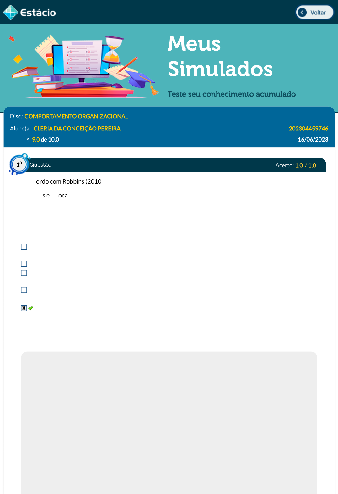 16/06/2023, 10:31 Estácio: Alunos https://simulado.estacio.br/bdq_simulados_avaliacao_parcial_resultado.asp?cod_hist_prova=312809409&cod_prova=6536384984&f_cod_disc= 1/7 Meus Simulados Teste seu conhecimento acumulado Disc.: COMPORTAMENTO ORGANIZACIONAL Aluno(a): CLERIA DA CONCEIÇÃO PEREIRA 202304459746 Acertos: 9,0 de 10,0 16/06/2023 Acerto: 1,0 / 1,0 De acordo com Robbins (2010): Rumores e fofocas são elementos bastantes comuns nas organizações. Em épocas de crise, então, essas práticas tornam-se ainda mais utilizadas pelos apreensivos funcionários. O medo das demissões, das reestruturações [...] leva-os a �car extremamente preocupados e estressados [...]. Em decorrência desse clima de angústia, os rumores são criados e se espalham a uma velocidade impressionante. As redes de rumores: Não são controladas pelos gestores, pois fazem parte do modelo de organização formal. Dessa forma, é importante retaliar o grupo que a mantém imediatamente. São controladas pelos gestores porque integram o canal de comunicação formal de uma organização Mesmo que consideradas parte integrante da organização informal, não são amplamente utilizadas para servir aos interesses pessoais daqueles que a integram. Embora façam parte da organização formal, não são consideradas como importante fonte de informação. São parte integrante de qualquer organização, logo, é importante manter os canais de comunicação abertos, explicando-se as decisões importantes pelos canais formais para que se reduza a ansiedade entre os empregados. Respondido em 16/06/2023 10:19:15 Explicação: De acordo com Robbins (2005), a rede de rumores tem três principais características: 1) Não é controlada pela direção da empresa. 2) É vista pela maioria dos funcionários como mais con�ável e �dedigna do que os comunicados formais. 3) Largamente utilizada para servir aos interesses pessoais que nela interagem. Assim, A alternativa "Embora façam parte da organização formal, não são consideradas como importante fonte de informação" está errada pois a rede de rumor, para Robbins é uma importante fonte de informação. A alternativa "Não são controladas pelos gestores, pois fazem parte do modelo de organização formal. Dessa forma, é importante retaliar o grupo que a mantém imediatamente" está errada pois a rede de rumor, para Robbins não deve, jamais, ser retaliada. A alternativa "Mesmo que consideradas parte integrante da organização informal, não são amplamente utilizadas para servir aos interesses pessoais daqueles que a integram" está errada pois a rede de rumor, para Robbins é argamente utilizada para servir aos interesses pessoais que nela interagem. Questão1 a https://simulado.estacio.br/alunos/inicio.asp javascript:voltar(); 16/06/2023, 10:31 Estácio: Alunos https://simulado.estacio.br/bdq_simulados_avaliacao_parcial_resultado.asp?cod_hist_prova=312809409&cod_prova=6536384984&f_cod_disc= 2/7 A alternativa "São controladas pelos gestores porque integram o canal de comunicação formal de uma organização" está errada pois a rede de rumor, para Robbins não são controladas pelos gestores Assim a alternativa "São parte integrante de qualquer organização, logo, é importante manter os canais de comunicação abertos, explicando-se as decisões importantes pelos canais formais para que se reduza a ansiedade entre os empregados" é a única correta. Acerto: 1,0 / 1,0 Muito embora Ana Maria, funcionária da empresa Águas Belas, saiba que diversas barreiras podem di�cultar ou distorcer a comunicação e�caz, quando comunica fatos negativos aos seus superiores, ela manipula as informações para que estes a vejam de forma mais favorável. Logo, pode-se dizer corretamente que Ana Maria: pratica a percepção seletiva. �ltra o conteúdo da mensagem escolhe os canais mais ricos para divulgar as informações utilização a sensação coletiva mantém a natureza da informação. Respondido em 16/06/2023 10:22:54 Explicação: Resposta correta: “"iltra o conteúdo da mensagem". A �ltragem ocorre quando o emissor manipula a informação para que a mensagem chegue de forma mais favorável a quem a ouve, omitindo ou distorcendo partes da comunicação. Se alguém tem medo de dar notícias ruins ou quer agradar a todos, a tendência é �ltrar seu conteúdo, comunicando sua parte favorável. Acerto: 1,0 / 1,0 Não há dúvidas de que as empresas foram levadas a reconhecer a realidade do mundo contemporâneo, cuja ideia defende novos modelos de gestão mais participativos. Tal modelo de liderança perpassa pelo(a): I- compartilhamento da missão, propósito e visão institucionais; II- contribuição na formação de valores e crenças organizacionais, modelando o caminho pelo exemplo de forma constante; III- a de�nição de acordos e compromissos de forma autocrática. Está(ão) correto(s): apenas os itens II e III. apenas os itens I e II. apenas os itens I e III. os itens I, II e III. apenas o item I. Respondido em 16/06/2023 10:24:58 Explicação: I- compartilhamento da missão, propósito e visão institucionais. - Correta. Modelos participativos de liderança pressupõe o compartilhamento de missão, propósito e visão institucionais. Questão2 a Questão3 a 16/06/2023, 10:31 Estácio: Alunos https://simulado.estacio.br/bdq_simulados_avaliacao_parcial_resultado.asp?cod_hist_prova=312809409&cod_prova=6536384984&f_cod_disc= 3/7 II- contribuição na formação de valores e crenças organizacionais, modelando o caminho pelo exemplo de forma constante - Correta. III- a de�nição de acordos e compromissos de forma autocrática. - Incorreta. A de�nição de acordos e compromissos deve ser feita de forma participativa e não autocrática. Acerto: 1,0 / 1,0 (FCC/2012 - adaptada) Alguns conceitos interessantes em gestão de pessoas tiveram destaque nos últimos tempos, como a vulnerabilidade dos líderes, a antifragilidade como avanço em relação à re