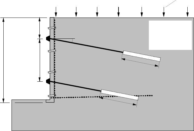 Exercício Dirigido: Para a cortina atirantada temporária apresentada abaixo, pede-se: (a) Calcular os esforços nos tirantes (usar teoria de Rankine para o cálculo dos empuxo ativo), sabendo-se que: . Tensão de escoamento do aço da barra = 500 MPa; . Diâmetro do bulbo de ancoragem = 150 mm . Adotar o espaçamento horizontal entre tirantes para os cálculos = 2,6 m. (b) Calcular o comprimento do bulbo de ancoragem dos tirantes, admitindo-se a tensão de aderência bulbo-solo igual a 250 kPa; (c) Verificar o posicionamento dos tirantes pelo método de Kranz. Formulário: T = 0.9 f A /F (obra temporária F = 1,5) T = 1.75 T T ult y T s 5,0 m 15 kPa c'= 0 f ' = 29 g = 19 kN/m o 3 10 o 1,25 L a L a 2,5