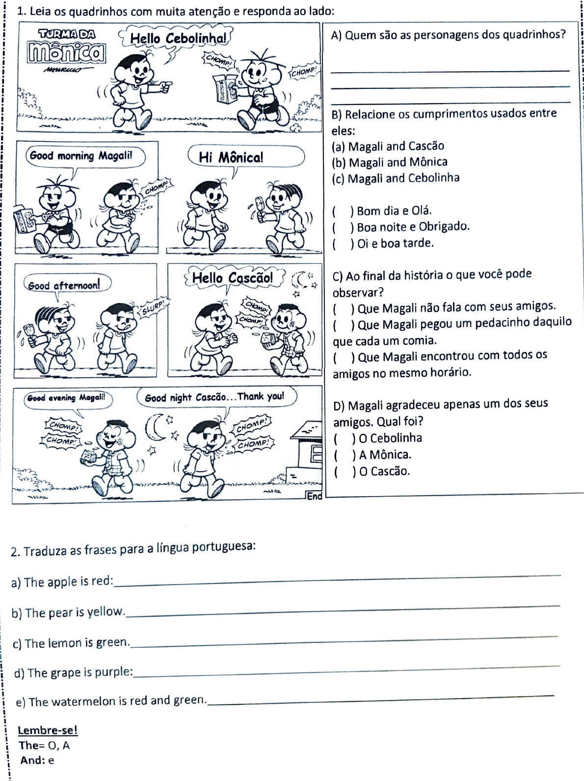 1. Leia os quadrinhos com muita atenção e responda ao lado: ( ( °½) i,;~-\ .. ~~~~,~,,.:---~,\, ..,........._ Good morning Magali! ( Hi Mônico! ) )/,------ 2. Traduza as frases para a língua portuguesa: A) Quem são as personagens dos quadrinhos? B) Relacione os cumprimentos usados entre eles: (a) Magali and Cascão (b) Magali and Mônica (c) Magali and Cebolinha ) Bom dia e Olá. ) Boa noite e Obrigado. ) Oi e boa tarde. C) Ao final da história o que você pode observar? ) Que Magali não fala com seus amigos. ) Que Magali pegou um pedacinho daquilo que cada um comia. ( ) Que Magali encontrou com todos os amigos no mesmo horário. D) Magali agradeceu apenas um dos seus amigos. Qual foi? ( ) O Cebolinha ( ) A Mônica. ( ) O Cascão. a) The apple is red: __________________________ _ b) The pear is ye llow. __________________________ _ c) The lemon is green. ________________ ____________ _ d) The grape is purple: _____________________ _ _____ _ 1 e) Th e watermelon is red and green. _________________ _ _ ___ _ 1 1 1 1 1 1 1 1 Lembre-se! The= O, A And: e