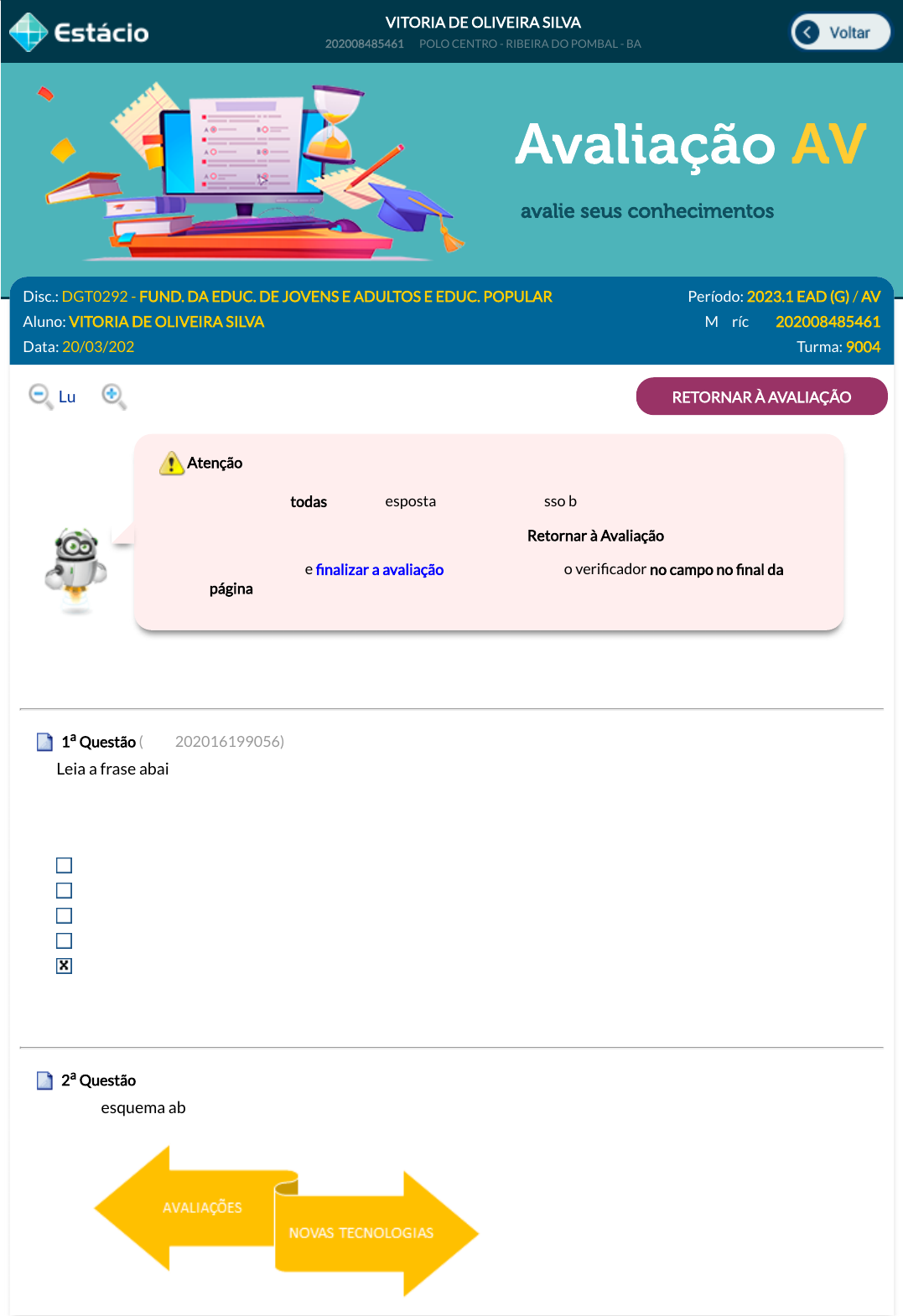 VITORIA DE OLIVEIRA SILVA Avaliação AV 202008485461 POLO CENTRO - RIBEIRA DO POMBAL - BA avalie seus conhecimentos Disc.: DGT0292 - FUND. DA EDUC. DE JOVENS E ADULTOS E EDUC. POPULAR Período: 2023.1 EAD (G) / AV Aluno: VITORIA DE OLIVEIRA SILVA Matrícula: 202008485461 Data: 20/03/2023 21:40:18 Turma: 9004 Lupa RETORNAR À AVALIAÇÃO 1a Questão (Ref.: 202016199056) Leia a frase abaixo: Precisamos compreender as __________ que vão desde a compreensão dos diferentes ____________ e tempo de aprendizagem, valorizando, assim, a ____________ na percepção das múltiplas identidades dos estudantes da EJA. Exclusão social, padronização, realidade Estruturas, exclusão e padronização Diversidades, modelos e subjetividade Padronização, espaço e cultura Diversidades, espaços, subjetividade 2a Questão (Ref.: 202014590628) Leia o esquema abaixo. Atenção 1. Veja abaixo, todas as suas respostas gravadas no nosso banco de dados. 2. Caso você queira voltar à prova clique no botão "Retornar à Avaliação". 3. Não esqueça de �nalizar a avaliação colocando o código veri�cador no campo no �nal da página. javascript:voltar_avaliacoes() javascript:diminui(); javascript:aumenta(); javascript:alert('C%C3%B3digo da quest%C3%A3o: 7665049\n\nStatus da quest%C3%A3o: Liberada para Uso.'); javascript:alert('C%C3%B3digo da quest%C3%A3o: 6056621\n\nStatus da quest%C3%A3o: Liberada para Uso.'); javascript:ir_finalizar(); Podemos dizer que Não está correto, pois as avaliações possuem um lugar central na EJA. Não está correto, pois esses conceitos não podem ser articulados. Está correto, pois a�rma a separação entre os recursos de reforço da desigualdade. Está correto, a�nal de contas tais conceitos não podem ser vistos de maneira conjunta. Ele não está correto, avaliação e novas tecnologias podem caminhar em conjunto em prol da inclusão educacional dos alunos da EJA. 3a Questão (Ref.: 202012623265) Na história da educação brasileira, diferentes concepções pedagógicas in�uíram e ainda in�uem na prática docente voltada para a educação de jovens e adultos. Uma delas, a concepção defendida por Paulo Freire, tem destaque. Considerando o olhar para o EJA podemos chamar esse desenvolvimento de voltado para: Nacionalismo. Cidadania. Conformidade social. Mercado de trabalho. Inovação Tecnológica. 4a Questão (Ref.: 202012611382) A educação de jovens e adultos (EJA) é a modalidade de ensino nas etapas de ensino fundamental e médio da rede escolar pública brasileira e é adotada por algumas redes particulares que recebem jovens e adultos que não completaram sua trajetória de escolarização no nível da educação básica. Em relação aos artigos dispostos na Constituição Federal que legitimam e possibilitam a oferta da EJA nas redes de educação básica, é correto citar O art. 211, parágrafo 2º, o qual incumbe apenas os Municípios de atuar prioritariamente no ensino fundamental na modalidade EJA. O art. 1 A República Federativa do Brasil, formada pela união indissolúvel dos Estados e Municípios e do Distrito Federal, constitui-se em Estado Democrático de Direito e tem como fundamentos: I - a soberania; II - a cidadania; III - a dignidade da pessoa humana; O art. 208, inciso I, que a�rma: "O dever do Estado com a educação será efetivado mediante a garantia de: ensino fundamental obrigatório e gratuito, inclusive para os que a ele não tiveram acesso na idade própria ". O art. 3, inciso IV, onde se encontra que: "Constituem objetivos fundamentais da República Federativa do Brasil: promover o bem de todos, sem preconceitos de origem, raça, sexo, cor, idade e quaisquer formas de discriminação". O art. 206, inciso III, no qual se lê que haverá "pluralismo de ideias e de concepções pedagógicas, e coexistência de instituições públicas e privadas de ensino". 5a Questão (Ref.: 202012692335) (Prefeitura de Ibirité - MG / 2016 - Adaptada) Paulo Freire sinalizou em sua teoria que ensinar exige saber escutar. Considerando essa uma premissa fundamental deve fazer parte da formação do professor discutir quais são essas qualidades indispensáveis na prática pedagógica, democrática ou progressista, que não se faz apenas com ciência e técnica. Nessa perspectiva, analise as a�rmativas a seguir. I. São qualidades indispensáveis na prática pedagógica a humildade, o gosto pela alegria e o gosto pela vida. javascript:alert('C%C3%B3digo da quest%C3%A3o: 4089258\n\nStatus da quest%C3%A3o: Liberada para Uso.'); javascript:alert('C%C3%B3digo da quest%C3%A3o: 4077375\n\nStatus da quest%C3%A3o: Liberada para Uso.'); javascript:alert('C%C3%B3digo da quest%C3%A3o: 4158328\n\nStatus da quest%C3%A3o: Liberada para Uso.'); II. São qualidades indispensáveis na prática pedagógica a abertura ao novo, a resistência à mudança e a persistência na luta. III. São qualidades indispensáveis na prática pedagógica a aceitação aos fatalismos, a identi�cação com a esperança e a abertura à justiça. IV. São qualidades indispensáveis na prática pedagógica a amorosidade, o respeito aos outros e a tolerância. Estão corretas as a�rmativas: I e IV, apenas I e II, apenas I, II, III e IV I, II e IV, apenas II e III, apenas 6a Questão (Ref.: 202016346718) Alguns conceitos do pensamento do educador Paulo Freire se tornaram referência para o debate curricular da Educação de Jovens e Adultos no Brasil, no que se refere aos procedimentos metodológicos. Assinale a alternativa que melhor corresponde aos conceitos de Paulo Freire: Opressão, conscientização e lealdade. Conscientização, libertação e lealdade. Conscientização, libertação e autonomia. Leitura de mundo, empreendedorismo e ação. Doutrinação, leitura de mundo e conscientização. 7a Questão (Ref.: 202012734407) A Educação de Jovens e Adultos (EJA) atualmente é destinada a: Jovens, adultos e idosos analfabetos. Crianças e jovens atrasados nos estudos.