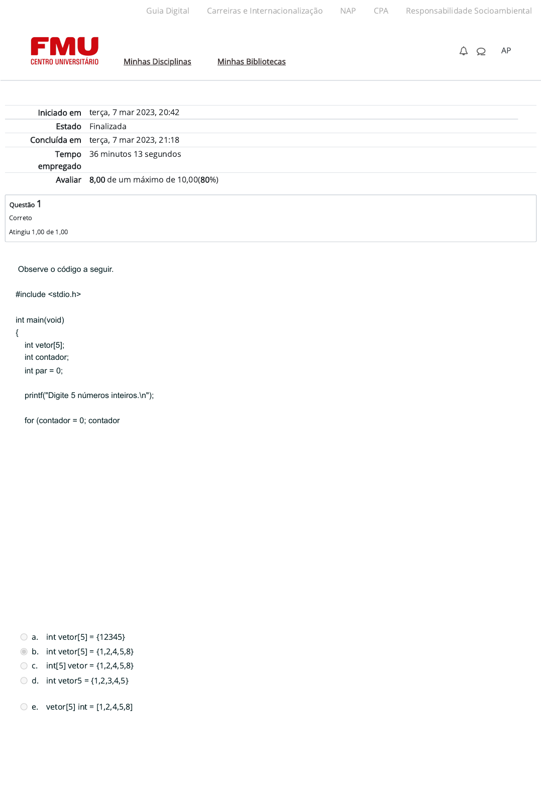 07/03/2023, 21:20 Atividade 3 (A3): Revisão da tentativa https://ambienteacademico.com.br/mod/quiz/review.php?attempt=1810389&cmid=756270 1/9 Iniciado em terça, 7 mar 2023, 20:42 Estado Finalizada Concluída em terça, 7 mar 2023, 21:18 Tempo empregado 36 minutos 13 segundos Avaliar 8,00 de um máximo de 10,00(80%) Questão 1 Correto Atingiu 1,00 de 1,00 Observe o código a seguir. #include <stdio.h> int main(void) { int vetor[5]; int contador; int par = 0; printf("Digite 5 números inteiros.\n"); for (contador = 0; contador < 5; contador++) { scanf("%d",&vetor[contador]); if (vetor[contador] % 2 == 0){ par++; } } printf("Foram digitados %d números pares.\n",par); return 0; } Este código realiza uma interação com o usuário e irá informar a quantidade de números pares digitados. Para realizar a criação e declaração de um vetor, já com 5 números inteiros, poderia ser feito de qual forma? Assinale a alternativa correta. a. int vetor[5] = {12345} b. int vetor[5] = {1,2,4,5,8} c. int[5] vetor = {1,2,4,5,8} d. int vetor5 = {1,2,3,4,5} e. vetor[5] int = [1,2,4,5,8] Guia Digital Carreiras e Internacionalização NAP CPA Responsabilidade Socioambiental Minhas Disciplinas Minhas Bibliotecas AP https://codely-fmu-content.s3.amazonaws.com/Moodle/GuiaDigital/Guia+digital/index.html https://carreiras.fmu.br/ https://codely-fmu-content.s3.amazonaws.com/Moodle/NAP/inicial/nap/fmu/index.html https://codely-fmu-content.s3.amazonaws.com/Moodle/CPA/landing_CPA/index.html https://portal.fmu.br/sustentabilidade https://ambienteacademico.com.br/ https://ambienteacademico.com.br/ https://ambienteacademico.com.br/course/view.php?id=236 User Máquina de escrever Observe o código a seguir. #include <stdio.h> int main(void) { int vetor[5]; int contador; int par = 0; printf("Digite 5 números inteiros.\n"); for (contador = 0; contador < 5; contador++) { scanf("%d",&vetor[contador]); if (vetor[contador] % 2 == 0){ par++; } } p rintf("Foram digitados %d números pares.\n",par); return 0; } E ste código realiza uma interação com o usuário e irá informar a quantidade de números pares digitados. Para realizar a criação e declaração de um vetor, já com 5 números inteiros, poderia ser feito de qual forma? 07/03/2023, 21:20 Atividade 3 (A3): Revisão da tentativa https://ambienteacademico.com.br/mod/quiz/review.php?attempt=1810389&cmid=756270 2/9 Questão 2 Incorreto Atingiu 0,00 de 1,00 Questão 3 Correto Atingiu 1,00 de 1,00 Qual a diferença principal entre usar um laço For e um laço While. a. O laço For irá executar o código um número determinado de vezes, enquanto o laço While executará o código in�nitamente. b. O laço For irá repetir o código até que a condição seja atingida, enquanto o laço While irá repetir o código um número determinado de vezes. c. O laço For irá executar o código um número determinado de vezes, enquanto o laço While executará o código enquanto a condição não for atingida. d. O laço For irá executar o código um número determinado de vezes, enquanto o laço While executará o código uma vez e depois repetirá enquanto a condição for válida. e. O laço For irá executar o código uma vez, e repetí-lo o código até que a condição seja atingida, enquanto o laço While irá repetir o código um número determinado de vezes. Quais são as três formas de repetição utilizadas para criar os laços em códigos? a. Do, While e Four. b. Main, For e Do. c. Do, For e Int. d. While, Int e Else. e. Do, While e For. Guia Digital Carreiras e Internacionalização NAP CPA Responsabilidade Socioambiental Minhas Disciplinas Minhas Bibliotecas AP https://codely-fmu-content.s3.amazonaws.com/Moodle/GuiaDigital/Guia+digital/index.html https://carreiras.fmu.br/ https://codely-fmu-content.s3.amazonaws.com/Moodle/NAP/inicial/nap/fmu/index.html https://codely-fmu-content.s3.amazonaws.com/Moodle/CPA/landing_CPA/index.html https://portal.fmu.br/sustentabilidade https://ambienteacademico.com.br/ https://ambienteacademico.com.br/ https://ambienteacademico.com.br/course/view.php?id=236 07/03/2023, 21:20 Atividade 3 (A3): Revisão da tentativa https://ambienteacademico.com.br/mod/quiz/review.php?attempt=1810389&cmid=756270 3/9 Questão 4 Correto Atingiu 1,00 de 1,00 No código abaixo, quantas vezes será exibido o texto ‘Hello World!’ em tela? #include <stdio.h> int main() { int duvida = 0; int contador = duvida + 5; while (contador <= 11) { printf("Hello World! \n"); contador++; } return 0; } a. 1 vezes. b. 5 vezes. c. 7 vezes. d. 11 vezes. e. 6 vezes. Guia Digital Carreiras e Internacionalização NAP CPA Responsabilidade Socioambiental Minhas Disciplinas Minhas Bibliotecas AP https://codely-fmu-content.s3.amazonaws.com/Moodle/GuiaDigital/Guia+digital/index.html https://carreiras.fmu.br/ https://codely-fmu-content.s3.amazonaws.com/Moodle/NAP/inicial/nap/fmu/index.html https://codely-fmu-content.s3.amazonaws.com/Moodle/CPA/landing_CPA/index.html https://portal.fmu.br/sustentabilidade https://ambienteacademico.com.br/ https://ambienteacademico.com.br/ https://ambienteacademico.com.br/course/view.php?id=236 07/03/2023, 21:20 Atividade 3 (A3): Revisão da tentativa https://ambienteacademico.com.br/mod/quiz/review.php?attempt=1810389&cmid=756270 4/9 Questão 5 Correto Atingiu 1,00 de 1,00 No código abaixo, quantas vezes será exibido o texto ‘Olá Mundo!’ em tela? #include <stdio.h> int main() { int contador = 1; for(contador = 0; contador < 10; contador++) { printf("Olá Mundo! \n"); } return 0; } a. 11 vezes. b. Nenhuma vez. c. 10 vezes. d. 5 vezes. e. 9 vezes. Guia Digital Carreiras e Internacionalização NAP CPA Responsabilidade Socioambiental Minhas Disciplinas Minhas Bibliotecas AP https://codely-fmu-content.s3.amazonaws.com/Moodle/GuiaDigital/Guia+digital/index.html https://carreiras.fmu.br/ https://codely-fmu-content.s3.amazonaws.com/Moodle/NAP/inicial/nap/fmu/index.html https://codely-fmu-content.s3.amazonaws.com/Moodle/CPA/landing_CPA/index.h