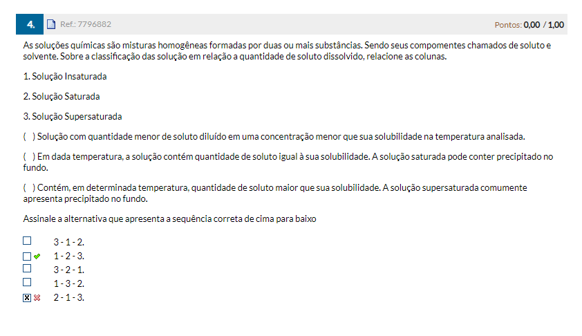 As soluções químicas são misturas homogêneas formadas por duas ou mais. Sendo seus componentes chamados de soluto e. Sobre a classificação das solução em relação a quantidade de soluto relacione as colunas. ( ) Solução com quantidade menor de soluto em uma concentração menor que sua solubilidade na temperatura analisada. ( ) Em dada temperatura, a solução contém quantidade de soluto igual à sua solubilidade. A solução saturada pode precipitar no fundo. ( ) Contém, em determinada temperatura, quantidade de soluto maior que sua solubilidade. A solução supersaturada comumente apresenta precipitado no fundo. 3 1 2. 1 2 3. 3 2 1. 1