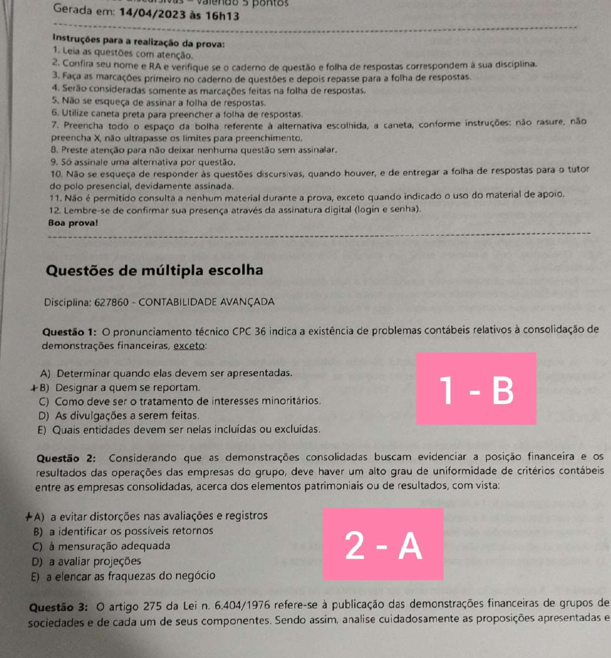 ] ● ● ● ● ● ● 02/03/2023, 23:22 Revisar envio do teste: QUESTIONÁRIO UNIDADE I – ... https://ava.ead.unip.br/webapps/assessment/review/review.jsp?attempt_id=_90751476_1&course_id=_265018_1&content_id=_3148759_1&retur… 1/4 Revisar envio do teste: QUESTIONÁRIO UNIDADE I CONTABILIDADE AVANÇADA 6278-60_59801_R_E1_20231 CONTEÚDO Usuário ana.santos713 @aluno.unip.br Curso CONTABILIDADE AVANÇADA Teste QUESTIONÁRIO UNIDADE I Iniciado 02/03/23 23:06 Enviado 02/03/23 23:21 Status Completada Resultado da tentativa 2,4 em 3 pontos Tempo decorrido 15 minutos Resultados exibidos Respostas enviadas, Perguntas respondidas incorretamente Pergunta 1 Resposta Selecionada: e. Para determinar se controla a investida, o investidor deve avaliar se possui: I. Poder sobre a investida. II.Exposição a, ou direitos sobre, retornos variáveis decorrentes de seu envolvimento com a investida. III. A capacidade de utilizar seu poder sobre a investida para afetar o valor de seus retornos. Está(ão) correto(s) o(s) item(ns): Todos estão corretos. Pergunta 2 Resposta Selecionada: b. A consolidação das Demonstrações Contábeis se realiza objetivando a apresentação da uniformidade nas práticas contábeis entre as empresas consolidadas na classi�cação dos ativos, passivos, receitas e despesas para que os saldos consolidados representem valores de mesma natureza. Assim, há a necessidade de: Eliminar os saldos existentes ou transações realizadas entre as empresas do grupo para que as demonstrações contábeis não apresentem saldos em duplicidade. UNIP EAD BIBLIOTECAS MURAL DO ALUNO TUTORIAISCONTEÚDOS ACADÊMICOS 0,3 em 0,3 pontos 0,3 em 0,3 pontos http://company.blackboard.com/ https://ava.ead.unip.br/webapps/blackboard/execute/courseMain?course_id=_265018_1 https://ava.ead.unip.br/webapps/blackboard/content/listContent.jsp?course_id=_265018_1&content_id=_3147236_1&mode=reset https://ava.ead.unip.br/webapps/portal/execute/tabs/tabAction?tab_tab_group_id=_10_1 https://ava.ead.unip.br/webapps/portal/execute/tabs/tabAction?tab_tab_group_id=_27_1 https://ava.ead.unip.br/webapps/portal/execute/tabs/tabAction?tab_tab_group_id=_47_1 https://ava.ead.unip.br/webapps/portal/execute/tabs/tabAction?tab_tab_group_id=_29_1 https://ava.ead.unip.br/webapps/portal/execute/tabs/tabAction?tab_tab_group_id=_25_1 https://ava.ead.unip.br/webapps/login/?action=logout 02/03/2023, 23:22 Revisar envio do teste: QUESTIONÁRIO UNIDADE I – ... https://ava.ead.unip.br/webapps/assessment/review/review.jsp?attempt_id=_90751476_1&course_id=_265018_1&content_id=_3148759_1&retur… 2/4 Pergunta 3 Resposta Selecionada: d. As perdas intragrupo podem indicar redução do valor recuperável dos ativos correspondentes que precisa: Ser reconhecida nas demonstrações contábeis consolidadas. Pergunta 4 Resposta Selecionada: e. Na ausência de quaisquer acordos adicionais que alterem a tomada de decisões, a avaliação do controle se concentra em: Instrumentos de dívida que conferem ao seu titular direitos de voto proporcionais. Comentário: Com base no parágrafo B6 da NBC TG 36 (R3) – Demonstrações Consolidadas, o principal objetivo de se ter o controle de uma investida é determinar as políticas operacionais e de �nanciamento da investida. Pergunta 5 Resposta Selecionada: c. O principal objetivo de se ter o controle de uma companhia é: Determinar as políticas operacional e de �nanciamento da investida. Pergunta 6 Para muitas investidas, uma série de atividades operacionais e de �nanciamento afetam signi�cativamente seus retornos. Entre elas, pode-se destacar: I. Compra e venda de bens ou serviços. II. Gestão de ativos �nanceiros durante sua vida (incluindo em caso de inadimplência). III. Seleção, aquisição ou alienação de ativos. IV. Pesquisa e desenvolvimento de novos produtos ou processos. 0,3 em 0,3 pontos 0 em 0,3 pontos 0,3 em 0,3 pontos 0,3 em 0,3 pontos 02/03/2023, 23:22 Revisar envio do teste: QUESTIONÁRIO UNIDADE I – ... https://ava.ead.unip.br/webapps/assessment/review/review.jsp?attempt_id=_90751476_1&course_id=_265018_1&content_id=_3148759_1&retur… 3/4 Resposta Selecionada: c. V. Determinação da estrutura de capital para obtenção de recursos. Está(ão) correto(s) o(s) item(ns): I, II, III, IV e V. Pergunta 7 Resposta Selecionada: d. Considerando as disposições da Lei n. 6.404/76 e as alterações posteriores, assinale a opção INCORRETA. O valor contábil do investimento em coligada abrange o custo de aquisição mais a equivalência patrimonial e o ágio não amortizado, deduzido do deságio não amortizado e da provisão para perdas. Pergunta 8 Resposta Selecionada: a. Deverá deixar de ser avaliado pelo método de equivalência patrimonial, o investimento em sociedades coligadas e controladas de: Empresa em efetiva e clara evidência de perda de continuidade de suas operações ou no caso em que estas estejam operando sob severas restrições em longo prazo que prejudiquem signi�cativamente a sua capacidade de transferir recursos para a investidora. Pergunta 9 Resposta Selecionada: b. Se uma empresa do grupo vendeu, ao preço de custo, $ 16.000 de mercadorias para outra empresa do grupo, a empresa compradora tem um passivo de $ 16.000 para com a empresa vendedora, e esta, por sua vez, tem a receber $ 16.000 da empresa compradora. Nesse caso, os lançamentos de eliminações são: Fornecedores (empresa vendedora) $ 16.000 a Duplicatas a Receber (empresa compradora) $ 16.000. 0,3 em 0,3 pontos 0,3 em 0,3 pontos 0 em 0,3 pontos 02/03/2023, 23:22 Revisar envio do teste: QUESTIONÁRIO UNIDADE I – ... https://ava.ead.unip.br/webapps/assessment/review/review.jsp?attempt_id=_90751476_1&course_id=_265018_1&content_id=_3148759_1&retur… 4/4 Quinta-feira, 2 de Março de 2023 23h21min53s GMT-03:00 Pergunta 10 Resposta Selecionada: c. A Participação dos Não Controladores é a parte do patrimônio líquido de uma controlada não atribuível, direta ou indiretamente, à 
