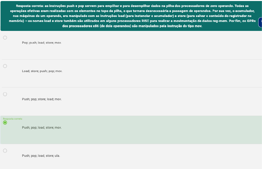 1) Sabe-se que uma instrução pode ser representada, genericamente, pelo seu opcode em conjunto com os seus operandos. O termo opcode se refere ao código que representa a instrução. Porém, a quantidade de operandos pode variar entre as famílias de processadores, pois podem seguir padrões distintos para a elaboração de seus ISA (Instruction Set Architecture - em português, arquitetura do conjunto de instruções). Para esta questão, complete as lacunas do texto abaixo com as instruções apropriadas.Na máquina de zero operando, também conhecida como máquina à pilha, é utilizada uma pilha de dados para fornecer informações ao módulo responsável pelo processamento. A manipulação da pilha é feita por intermédio das instruções ____ (para empilhar dados na pilha) e ____ (para desempilhar da pilha). Já nos processadores de um operando, surge a figura de um registrador “acumulador”, para servir de fonte e de destino das operações. A manipulação do registrador é realizada pelas instruções ____ (para instanciar o acumulador) e ____ (para salvar o valor do acumulador na memória). Em máquinas RISC, como o MIPS, utilizam-se instruções com esses mesmos nomes para realizar movimentações de dados entre o registrador e a memória. Por fim, máquinas de dois e de três operandos utilizam GPR (General Purpose Register - em português, registradores de propósito geral). Em processadores x86, os registradores GPR são manipulados por meio de instruções do tipo ____. Agora, assinale a alternativa que você julgue conter as expressões que completam as lacunas corretamente. 2) A linguagem Assembly é formada por mnemônicos, que correspondem às instruções exportadas pelo processador em questão. Geralmente, instruções de linguagens de alto nível, após terem sido compiladas, são convertidas em uma sequência de várias instruções Assembly. Nesta questão, considere o seguinte código escrito em um Assembly hipotético: mov Reg1, 5mov Reg2, 4 add Reg2, 1 sub Reg1, Reg2 je p_elseadd Reg2, 2 sub Reg1, 5jump p_final p_else:sub Reg2, 1 p_final: sub Reg1, Reg2 js p_finaltotalsub Reg2, 1 p_finaltotal: No código acima, além das instruções de movimentação de dados, de soma e de subtração, foram, também, utilizadas as seguintes instruções de desvio: · “Je” (jump equal), que desvia o fluxo caso a flag “zero” tenha sido instanciada em “1” - ou seja, caso a operação da ULA resulte em um valor nulo; · “js” ( jump signal), que desvia o fluxo caso a flag “sinal” tenha sido instanciada em “1” - ou seja, caso a operação da ULA resulte em um valor negativo; · “jump”, que introduz um desvio não condicional. Agora, assinale a alternativa que contém os valores finais de “ Reg1” e de “ Reg2”, respectivamente. 3) Para a utilização do barramento e de alguns dispositivos de I/O ( Input/ Output - em português, entrada/saída); e, também, de serviços baseados em conexão das redes de comunicação de dados, adota-se um mecanismo denominado handshake. Com o handshake, garante-se que ou o dispositivo ou o canal poderá ser utilizado por aquele que conseguiu fechar a conexão. Para esta questão, sequencie as etapas listadas a seguir, do ponto de vista do solicitante da conexão, de acordo com a ordem em que ocorrem. (_) Envio de um sinal de requisição de uso (REQ). (_) Envio de um sinal ACK. (_) Espera de um sinal de concessão de uso (ACK). (_) Envio das informações. Selecione a alternativa que contém a sequência correta. 4) O mapeamento do tipo conjunto associativo representa uma fusão da memória associativa com o mapeamento direto. Como suas principais vantagens, podemos citar uma maior eficiência em relação ao mapeamento direto e uma complexidade de hardware mais baixa em relação à memória associativa. Para esta questão, suponha uma memória cache vazia composta por oito linhas do tipo 2-way set associative, que utiliza o mecanismo LRU para a substituição dos blocos. Suponha, ainda, que serão demandados os blocos de acordo com a seguinte ordem: 10; 4; 2; 3; 18; 2; 3; 12; 3; 2; 4; 18. Marque a alternativa que contém, respectivamente, a quantidade de miss e de hits ocorridos até o fim da sequência de utilização dos blocos, 5) Nos sistemas de memória, a organização dos blocos armazenados é denominada mapeamento. Sendo mais específico em relação à cache, o mapeamento envolve as políticas e os mecanismos que possam direcionar o bloco dentro da cache; e, consequentemente, como localizá-lo em futuras demandas. Ainda quanto à cache, existem três tipos de mapeamento: memória associativa, mapeamento direto e conjunto associativo. No mapeamento direto e no conjunto associativo, cada bloco tem, exatamente, uma única posição (linha) para ser armazenado. Para esta questão, suponha uma memória composta por oito linhas que receberá os seguintes blocos: 33, 28, 47 e 10. Agora, selecione a alternativa que contém a sequência correta dos números das linhas que receberão os blocos. 6) O processador MIPS é um exemplo de arquitetura RISC. Sendo assim, podemos relacioná-lo a algumas características dos processadores RISC: poucos formatos de instruções; máquina de três operandos; e transferência de informações entre a memória e o banco de registradores por intermédio apenas das instruções load e store. Tais particularidades podem ser identificadas quando analisamos o seu datapath. Esta questão é baseada no datapath do processador MIPS. Analise as afirmativas a seguir, classificando-as com “V” (verdadeiras) ou com “F” (falsas). (_) Os opcodes das instruções são representados pelos bits de 26 a 31. (_) Nas instruções do tipo “add reg3, reg2, reg1”, o registrador destino é mapeado pelos bits [15:11]; e as fontes, pelos bits [25:21] e [20:16]. (_) Os valores produzidos pela ALU podem ser diretamente gravados na memória de dados. (_) O MIPS também usa a abordagem da ar