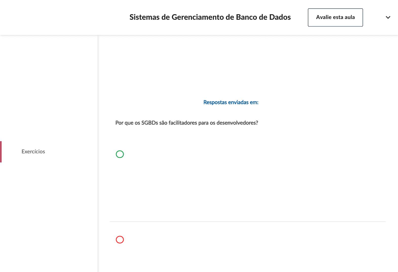 03/06/23, 15:31 Sistemas de Gerenciamento de Banco de Dados :: Plataforma A https://unicarioca.grupoa.education/sagah/object/default/50728222 1/3 Exercícios Respostas enviadas em: 31/05/2023 15:47 1. Por que os SGBDs são facilitadores para os desenvolvedores? Você acertou! A. Porque os desenvolvedores não precisam se preocupar com as regras e a manipulação de valores no banco de dados. Os SGBDs são facilitadores porque os desenvolvedores não precisam se preocupar com as regras e a manipulação de valores no banco de dados. Lembre-se que a a�vidade básica do SGBD é a de manipular e controlar os dados e suas edições unicamente, portanto, qualquer outra solicitação é fora de contexto. Resposta incorreta. B. Porque guardarão os dados do sistema. Os SGBDs são facilitadores porque os desenvolvedores não precisam se preocupar com as regras e a manipulação de valores no banco de dados. Lembre-se que a a�vidade básica do SGBD é a de manipular Anterior Dica do Professor Próximo Na prá�ca Apresentação Desafio Infográfico Conteúdo do Livro Dica do Professor Exercícios Na prá�ca Saiba mais Sistemas de Gerenciamento de Banco de Dados Avalie esta aula MC 03/06/23, 15:31 Sistemas de Gerenciamento de Banco de Dados :: Plataforma A https://unicarioca.grupoa.education/sagah/object/default/50728222 2/3 e controlar os dados e suas edições unicamente, portanto, qualquer outra solicitação é fora de contexto. Resposta incorreta. C. Porque servem para auditar a aplicação. Os SGBDs são facilitadores porque os desenvolvedores não precisam se preocupar com as regras e a manipulação de valores no banco de dados. Lembre-se que a a�vidade básica do SGBD é a de manipular e controlar os dados e suas edições unicamente, portanto, qualquer outra solicitação é fora de contexto. Resposta incorreta. D. Porque criam segurança na aplicação. Os SGBDs são facilitadores porque os desenvolvedores não precisam se preocupar com as regras e a manipulação de valores no banco de dados. Lembre-se que a a�vidade básica do SGBD é a de manipular e controlar os dados e suas edições unicamente, portanto, qualquer outra solicitação é fora de contexto. Resposta incorreta. E. Nenhuma das alterna�vas anteriores está correta. Os SGBDs são facilitadores porque os desenvolvedores não precisam se preocupar com as regras e a manipulação de valores no banco de dados. Lembre-se que a a�vidade básica do SGBD é a de manipular e controlar os dados e suas edições unicamente, portanto, qualquer outra solicitação é fora de contexto. Anterior Dica do Professor Próximo Na prá�ca Apresentação Desafio Infográfico Conteúdo do Livro Dica do Professor Exercícios Na prá�ca Saiba mais Sistemas de Gerenciamento de Banco de Dados Avalie esta aula MC 03/06/23, 15:31 Sistemas de Gerenciamento de Banco de Dados :: Plataforma A https://unicarioca.grupoa.education/sagah/object/default/50728222 3/3 1 de 5 perguntas Próximo Anterior Dica do Professor Próximo Na prá�ca Apresentação Desafio Infográfico Conteúdo do Livro Dica do Professor Exercícios Na prá�ca Saiba mais Sistemas de Gerenciamento de Banco de Dados Avalie esta aula MC