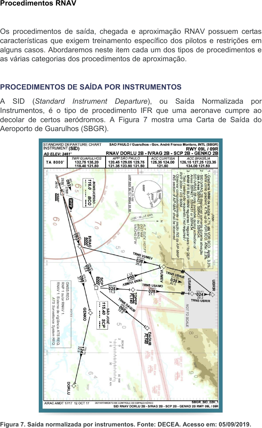 Procedimentos RNAV Os procedimentos de saída, chegada e aproximação RNAV possuem certas características que exigem treinamento específico dos pilotos e restrições em alguns casos. Abordaremos neste item cada um dos tipos de procedimentos e as várias categorias dos procedimentos de aproximação. PROCEDIMENTOS DE SAÍDA POR INSTRUMENTOS A SID (Standard Instrument Departure), ou Saída Normalizada por Instrumentos, é o tipo de procedimento IFR que uma aeronave cumpre ao decolar de certos aeródromos. A Figura 7 mostra uma Carta de Saída do Aeroporto de Guarulhos (SBGR). Figura 7. Saída normalizada por instrumentos. Fonte: DECEA. Acesso em: 05/09/2019. É importante observar na carta os mínimos operacionais, no canto superior esquerdo. É necessário manter um gradiente de subida de 4,7% após decolar até o VOR de Bonsucesso (BCO), e após manter ao menos 3,3%. A saída IVRAG 2B só é permitida caso as áreas restritas demonstradas na carta estejam ativadas. Não há mínimos de teto para realizar a saída, apenas mínimos de alcance visual da pista (Runway Visual Range – RVR) de 200 m e visibilidade de 600 m. Por fim, é necessário observar a seção INS (introdutória) do Manual de Publicações Aeronáuticas (AIP) para conhecimento das abreviaturas e nomenclaturas aeronáuticas contidas na carta.Áreas restritas são espaços aéreos condicionados, onde as aeronaves precisam ajustar-se às condições daquele espaço ou coordenar com o órgão de controle de tráfego aéreo daquela região se têm permissão para cruzá-lo. Na prática, as aeronaves evitam essas áreas restritas para não interferir no que ocorre nesses locais. Há também restrições de altitude em determinados fixos, como em IVRAG, onde é necessário estar acima de 6.000 pés, e TOPEP e DAGUB, onde é necessário estar acima do FL140. Observe que a restrição de IVRAG é em altitude, pois ainda não foi cruzado a altitude de transição de 8.000 pés, conforme canto superior esquerdo da carta. Portanto, é utilizado o ajuste QNH. Após 8.000 pés, utiliza-se o ajuste QNE, para indicar níveis de voo.Na base da carta há uma caixa com as exigências de especificações de navegação, sendo necessário equipamento GNSS para cumprir performance RNP 1, ou seja, defasagem máxima de uma milha náutica. Além disso, é necessário o sistema de vigilância dos serviços de tráfego aéreo (ATS) para cumpri-la em segurança. Vale salientar que, no Brasil, procedimentos que exijam performance RNP 1 e 2 devem ser realizados em áreas com cobertura radar. PROCEDIMENTO DE CHEGADA POR INSTRUMENTOS Assim como nos procedimentos da saída, a STAR (Standard Arrival Chart) possui especificações de navegação mínimos (RNAV 1 e vigilância ATS), além de, obviamente, necessidade de equipamento GNSS a bordo. A Carta de Chegada ILSOR 1C de SBGR indica o fixo principal do procedimento, ILSOR, e diversas “entradas”, que são ANISE, ao sudoeste, para aeronaves provenientes de Curitiba e Florianópolis, por exemplo, e VUKIK e PAGOG, ao leste, para aeronaves provenientes de outras regiões, principalmente do Rio de Janeiro, pois ambos os fixos se encontram em aerovias que abrangem a movimentada ponte aérea Rio-São Paulo. Para as aeronaves cumprindo o perfil via ANISE, há a interceptação do auxílio- rádio SAT (NDB de Santos). Entretanto, a navegação não deverá tornar-se convencional naquele trecho, pois os sistemas de navegação RNAV e inerciais possuem em seu banco de dados os fixos rádio e os transforma em fixos de GPS. O procedimento padrão é, naturalmente, sintonizar no equipamento ADF (Automatic Direction Finder) a frequência de 375 kHz, e o mesmo apontará a direção da estação, como um backup da navegação baseada em performance. É comum pensar que, como vimos no início do tópico anterior, se as trajetórias RNAV servem para otimizar o espaço aéreo e voar de ponto a ponto, por que a necessidade de tantas mudanças de rumo? Simplesmente para garantir a segurança com um alto volume de tráfego. Aeronaves chegando de todas as direções, com diferentes velocidades e performance de voo precisam de ordenação, responsabilidade do controle de tráfego aéreo. O mesmo, porém, não consegue ordenar o fluxo de aeronaves de qualquer maneira ou ao seu bem entender, pois seria caótico. Assim, com trajetórias pré-definidas, o controlador fica responsável por administrar a navegação da aeronave momentos antes de interceptar os procedimentos de aproximação. Porém, vale ressaltar que ao entrar em espaços aéreos com vetoração radar, o controlador pode solicitar mudanças de rumos e altitudes aos pilotos, dentro de suas respectivas capacidades. Após UTBUR, há uma linha tracejada com o rumo magnético 315°, na direção oposta do aeroporto. Isto significa que, nesse momento, a aeronave estará sob o serviço de vetoração radar do Controle São Paulo (APP SP), como explicado há pouco, e será encaminhada na “fila” de aeronaves em procedimentos de pouso em SBGR. Em alguns casos, as aeronaves podem prosseguir diretamente e cumprir o procedimento de Aproximação por Instrumentos, que veremos em detalhes a seguir. Figura 8. Chegada normalizada por instrumentos. Fonte: DECEA. Acesso em: 05/09/2019. PROCEDIMENTO DE APROXIMAÇÃO POR INSTRUMENTOS Como apontado no tópico anterior (Conceito e aplicação PBN/RNAV), há especificações de navegação RNP voltadas justamente para a aproximação, por isso, antes de expormos os procedimentos, é importante explicar algumas nomenclaturas. As aproximações RNAV dividem-se, basicamente, em aproximações sem orientação vertical (apenas lateral) e com orientação lateral e vertical. As aproximações sem orientação vertical são: LP (Localizer Performance): Aproximação de não precisão com orientação lateral via sistema SBAS. São procedimentos publicados onde o relevo ou obstáculos impedem a orientação vertical. A sensitividade 
