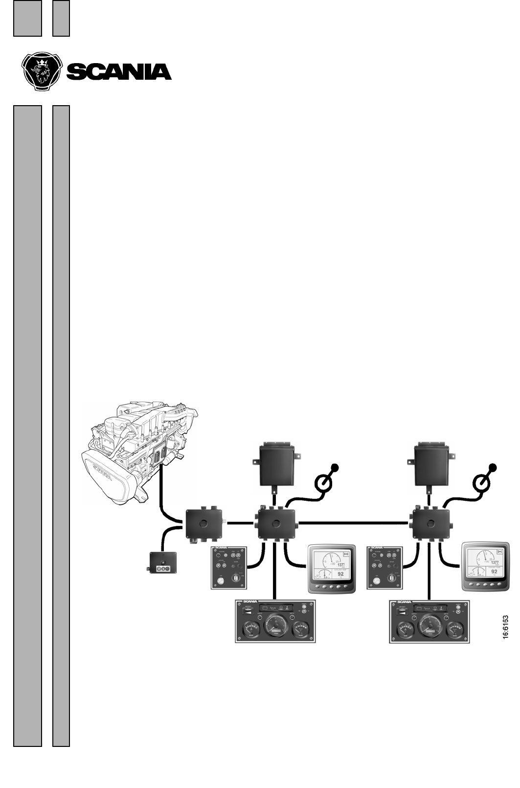 © Scania CV AB 2004-12:1 Edição 1 pb N° de peça 1 588 976 Industrial & Marine Engines Engine Management System com Instrumentos do EMS Scania Diagnóstico de falhas 16:02-04 Índice Diagnóstico de falhas com o uso de códigos de piscadas para coordenador e unidade de comando do EMS . . . . . . . . . . . . . . . . . . . . . . . . . . . . . . . . . . . . . . . . 3 Generalidades . . . . . . . . . . . . . . . . . . . . . . . . . . . . . . . . . . . . . . . . . . . . . . . . . . 3 Função . . . . . . . . . . . . . . . . . . . . . . . . . . . . . . . . . . . . . . . . . . . . . . . . . . . . . . . . 3 Leitura de códigos de piscadas para a unidade de comando do EMS. . . . . . . . 4 Apagamento de códigos de falha (códigos de piscadas) para a unidade de comando do EMS . . . . . . . . . . . . . . . . . . . . . . . . . . . . . . . . . . . . . . . . . . . . . 5 Vista geral de códigos de piscadas para unidade de comando do EMS . . . . . . 6 Leitura de códigos de piscadas para o coordenador do EMS . . . . . . . . . . . . . . 7 Apagamento de códigos de falha (códigos de piscadas) para o coordenador . . 8 Vista geral de códigos de piscadas para o coordenador do EMS . . . . . . . . . . . 9 2 © Scania CV AB 2004-12:1 16:02-04 Diagnóstico de falhas com o uso de códigos de piscadas para coordenador e unidade de comando do EMS Generalidades Fora os instrumentos para a leitura da rotação do motor com horímetro, da temperatura do líquido de arrefecimento e da pressão de óleo, o painel de instrumentos analógico tem um interruptor, S53, e uma lâmpada de diagnóstico, W21, com a qual pode-se ler os códigos de piscadas para o coordenador e unidade de comando do EMS. Função O S53 é um interruptor de 3 posições que é associado com a lâmpada de diagnóstico W21. A lâmpada de diagnóstico fica iluminada enquanto o sistema tiver um código de falha ativo e se apagará se o sistema não tiver um código de falha ou nenhum código de falha passivo. Quando o interruptor é colocado na posição do COO por pelo menos 1 segundo, qualquer código de falha armazenado pelo coordenador será emitido como código de piscadas pela lâmpada de diagnóstico. Quando o interruptor é colocado na posição do EMS por pelo menos 1 segundo, qualquer código de falha armazenado pelo coordenador será emitido como código de piscadas pela lâmpada de diagnóstico. Para poder ler códigos de piscadas nos instrumentos duplos, é necessário exigir o diagnóstico do painel de instrumentos onde o coordenador em questão está conectado. W21 S53 16:02-04 © Scania CV AB 2004-12:1 3 Leitura de códigos de piscadas para a unidade de comando do EMS 1. Ligue a ignição. Caso a lâmpada de diagnóstico ainda estiver ligada após 2 segundos, existe uma falha ativa. 2. Ajuste o interruptor de diagnóstico (S53) na esquerda para ver os códigos de piscadas para a unidade de comando (EMS). 3. A lâmpada de diagnóstico (W21) piscará para indicar o código de falha. Esse código de piscadas consiste de clarões longos (aprox. 1 segundo) e clarões curtos (0,3 segundo). Os clarões longos são equivalentes às dezenas e os clarões curtos às unidades. Exemplo: longo-longo-curto-curto-curto- curto-curto = código de falha 25. 4. Repita este procedimento até o primeiro código de piscadas for repetido. Isso significa que toda a memória de códigos de falha foi iluminada. Se a memória de códigos de falha estiver vazia, apenas um clarão longo de aprox. 4 segundos vai aparecer. 5. Veja a tabela de códigos de piscadas na próxima página para ver a descrição e o local da falha. 6. Para obter maiores informações sobre o código de falha, é preciso usar a ferramenta de diagnóstico do PC ou o Scania EMS Display (Indicador do EMS Scania). Entre em contato com uma oficina da Scania autorizada. 7. A lâmpada de diagnóstico permanecerá acesa enquanto uma falha estiver ativa. Mesmo se a lâmpada se apagar e a falha não estiver mais ativa, é geralmente possível ler o código de acordo com as instruções acima. 8. Após corrigir uma falha, ela pode ser apagada conforme as descrições na página seguinte. 10 6 15 8 10 6 15 7 4 © Scania CV AB 2004-12:1 16:02-04 Apagamento de códigos de falha (códigos de piscadas) para a unidade de comando do EMS 1. Desligue a ignição. Se a embarcação tiver instrumentos duplos, a ignição deverá ser desligada em ambos os painéis. 2. Mova o interruptor de diagnóstico em direção dos códigos de piscadas, i.e. para a esquerda para EMS. 3. Ligue a ignição ao mesmo tempo que segura o interruptor de diagnóstico na posição à esquerda (EMS) por 3 segundos. 4. Isso apagará os códigos de falha passivos que podem ser lidos via código de piscadas para o sistema relevante. O resto do código de falha permanecerá na EEPROM e só poderá ser apagado com a ferramenta do PC. Qualquer falha ativa ainda indicará uma falha. 16:02-04 © Scania CV AB 2004-12:1 5 Vista geral de códigos de piscadas para unidade de comando do EMS Código Descrição Código Descrição 0 Nenhuma falha foi encontrada. 53 PDE no cilindro 3: a válvula solenóide não está funcionando corretamente. 11 Sobrevelocidade. Um ou ambos os sensores de rotações do motor está indicando rotações mais altas que 3000 rpm. 54 PDE no cilindro 4: a válvula solenóide não está funcionando corretamente. 12 Sensor de rotações do motor 1 com falha ou sinal incorreto. 55 PDE no cilindro 5: a válvula solenóide não está funcionando corretamente. 13 Sensor de rotações do motor 2 com falha ou sinal incorreto. 56 PDE no cilindro 6: a válvula solenóide não está funcionando corretamente. 14 Sensor de temperatura do líquido de arrefecimento com falha ou sinal incorreto. 57 PDE no cilindro 7: a válvula solenóide não está funcionando corretamente. 15 Sensor de temperatura do ar de admissão com falha ou sinal incorreto. 58 PDE no cilindro 8: a válvula solenóide não está funcionando corretamente. 16 Sens