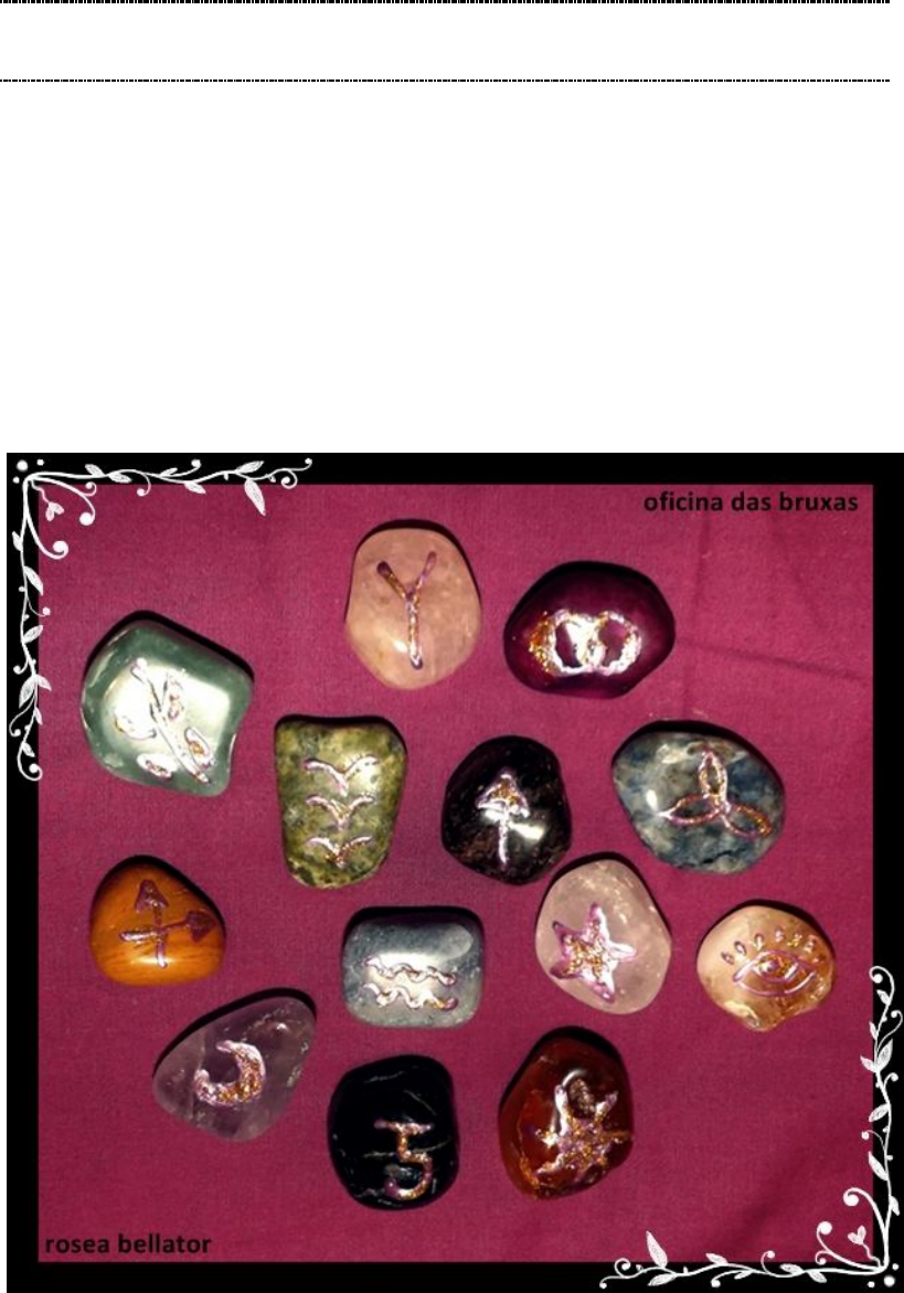 AS RUNAS DAS BRUXAS Não se sabe ao certo onde apareceram as runas das bruxas, porém já são conhecidas há muitos anos. Este é um oráculo feito pela bruxa para usar para si mesma. As Runas das Bruxas são um oráculo composto por 13 pedras, cada uma com um símbolo. O oráculo deve ser feito pela própria bruxa para si mesma ou para dar para outra bruxa – por isso runas das bruxas. Se for comprar, compre de uma bruxa ou bruxo, pois os bruxos sabem que na confecção dessas peças é necessário a invocação de sabedoria, força e energia. Quanto maior a energia empenhada, melhor será para lidar com as runas das bruxas. As Runas das Bruxas. Foto: Rosea Bellator Como fazer as Runas das Bruxas 1. Consiga 13 pedras ou cristais. Pode ser feito na madeira também. As pedras podem ser qualquer uma, até mesmo as que você encontra no chão na rua tanto quanto pedras de vidro (porque o vidro vem da areia). 2. Purifique as pedras: lave-as com sal grosso e deixe-as energizar por toda uma noite sob o luar. Tem que ser o luar, pois é a lua que possui dons sobre o mistério, sobre nossa inconsciência. 3. Antes de confeccionar durma ao menos 1 semana com essas pedras debaixo do travesseiro para se ligar com suas futuras runas. Anote no seu diário de sonhos ou livro das sombras o que sonhar nesses dias. Se você decidir dar essas runas para alguém ou vender, a pessoa que deverá dormir com as pedras, e claro, depois de terminadas. 4. Na hora de confeccionar, acenda uma vela e faça uma oração em honra a lua. Se você tem alguma divindade e quiser consagrá-la, faça como preferir. 5. Depois de confeccionar as runas das bruxas, faça uma toalha que será usada somente para esse oráculo. Como fazer a toalha O local onde se joga as runas das bruxas normalmente é uma toalha, porém não precisa ser uma toalha de um pano específico, pode até ser madeira. Veja a imagem: A toalha é dividida em 3 partes: 1 – parte da toalha que não é usada no jogo. 2 – Grande círculo. Um dos jogos mais comuns é a leitura que começa da margem superior que segue até a margem inferior do grande círculo. 3 – Pequeno círculo. As pedras que caem aqui são como conselhos juntamente com as previsões. É mais focado na área espiritual. Existem diversas formas de jogar as runas das bruxas, mas aqui só para exemplificar a toalha, usei esse método mais simples e mais usado. … Como jogar Método 1 Repare que numerei as runas das bruxas para você ver a ordem que caíram, coloquei também as linhas amarelas para mostrar como entender qual será a ordem da leitura. É simples, inicie a leitura onde está marcada a runa 1, e vá descendo, mas sempre vendo qual a mais próxima. Veja, a runa 2 está fora dos círculo, assim a as runas 9 e 13, estas não serão interpretadas. As runas 6 e 7 estão dentro do círculo menor, sendo a 7 a mais forte por estar mais no centro, elas lhe dirão mais sobre seu lado espiritual ou lhe darão um conselho. Você saberá diferenciar conforme for o jogo. Todas as runas, as que estiverem com o símbolo visível serão interpretadas, caso contrário devem ser retiradas da toalha. Método 2 Neste método as runas do grande círculo não são consideradas, assim como as que estão fora dele. Como na imagem, as únicas consideradas serão as que estão dentro do círculo menor, da mais próxima da margem superior seguindo até a mais próxima da margem inferior. Aqui será visto seu futuro, sendo a ultima runa um conselho de como seguir adiante. Se cair somente uma runa aqui no pequeno círculo, esta runa dirá o futuro que está para acontecer. Se a runa solitária cair exatamente no centro, ela lhe dirá um segredo que escondem de você. Atenção: Não jogue vezes seguidas esperando que isso aconteça, pois o que estará fazendo na verdade é uma manipulação do jogo. Significado de cada símbolo das Runas das Bruxas Vou colocar os desenhos de forma simples para que consigam copiar, ok? Runa do Sol – Assim como o próprio Sol, esta runa indica iluminação de bens materiais, da mente e do espírito. Coisas boas vem aí, mas não espere sentado. Se você não magoar quem está sempre ao seu lado pode ser que tenha sérios problemas. No lado espiritual indica que alguém lhe enviou grandes bençãos ou que você está cheio de energia para enfrentar o que der e vier. Runa dos Pássaros – Hora de voar e livrar-se do que lhe prendia! Nada nem ninguém pode te parar agora. Voe alto atrás de seus desejos. Novos projetos aparecem no ar, e com eles novos desafios, novas pessoas! Viagens, comunicação e mudanças são favorecidas. No lado espiritual pede que você repense algumas coisas e se for preciso, mude urgentemente. Runa dos Anéis – Todo tipo de sociedade será favorecida. Os anéis indicam união, uma união selada pelos deuses. Assuntos da justiça serão verificados e favorecidos. Dê prioridade para a área do amor. No lado espiritual pede para você procurar bases sólidas, pessoas realmente confiáveis, pois pode acontecer uma situação/problema que te abale demais. Runa da Mulher – Tudo que havia de mal está sendo banido. Hora de gerir projetos, começar novos sonhos, abrir novos caminhos, procurar novo emprego, novo amor. Assim como a mulher, essa runa indica mil possibilidades de um futuro. No lado espiritual indica banhos para abrir caminhos, feitiços de prosperidade e proteção. Banimentos são os mais favorecidos. Runa do Casamento – Pendências serão resolvidas, projetos serão finalizados, namoros transformarão-se em casamento. Hora de florescer, dar frutos. Se quer ter filhos, esta runa indica que esta é a hora. Indica sucesso. No lado espiritual indica que o perdão é possível. Procure manter- se zen. Rituais e feitiços e proteção serão fortificados. Runa das Ondas – Escura e misteriosa como as águas do oceano, é assim que está a atual situação. Existem muitos mistérios que podem não ser solucionados agora, evite a pressa. 