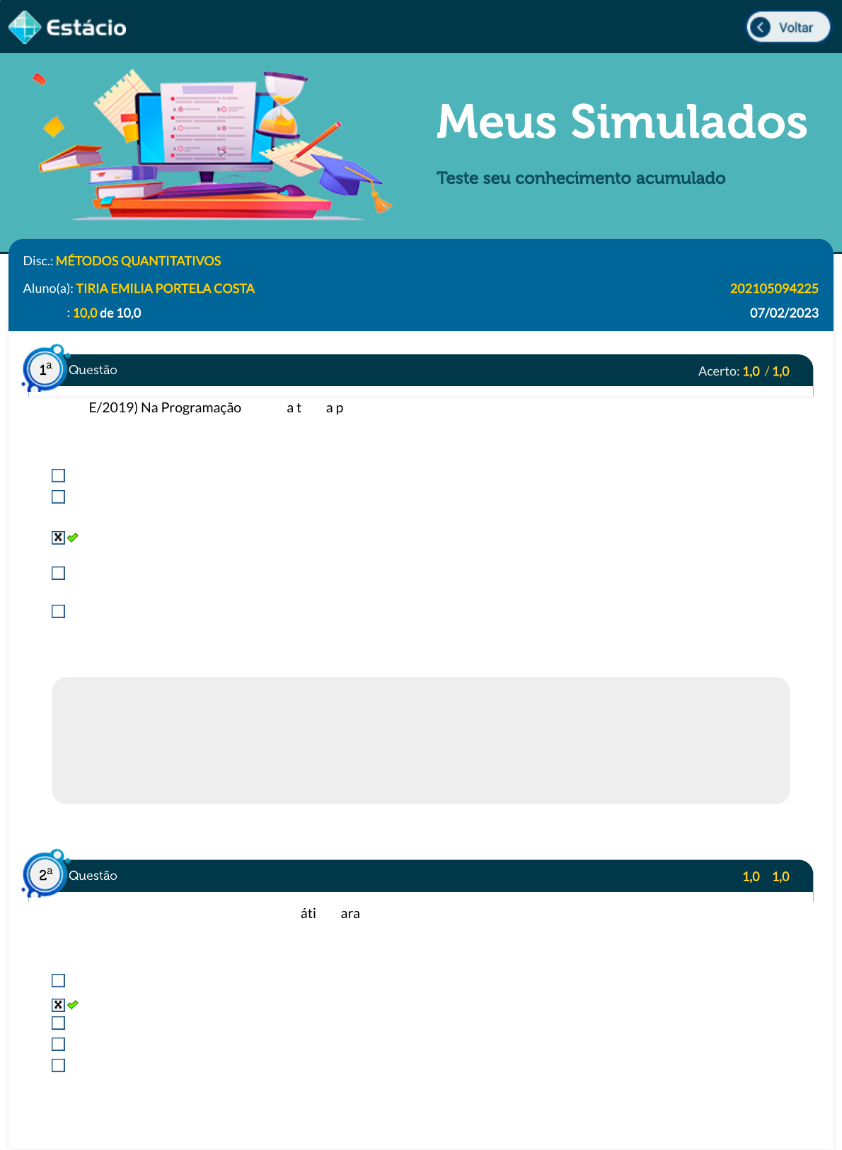 Meus Simulados Teste seu conhecimento acumulado Disc.: MÉTODOS QUANTITATIVOS Aluno(a): TIRIA EMILIA PORTELA COSTA 202105094225 Acertos: 10,0 de 10,0 07/02/2023 Acerto: 1,0 / 1,0 (IBADE/2019) Na Programação Linear, a tarefa primordial é o reconhecimento e a formulação do problema de forma tal que ele possa ser trabalhado e, assim, fornecer um objetivo desejável a ser otimizado. O Método Grá�co da Programação Linear consiste em um sistema: não coordenado, onde se mostra um polígono côncavo que contém os pontos representativos das possibilidades. de coordenadas perpendiculares, onde se mostra um polígono côncavo que contém os pontos representativos das possibilidades. de coordenadas ortogonais, onde se mostra um polígono convexo que contém os pontos representativos das possibilidades. de coordenadas ortogonais, onde se mostra um polígono convexo que não contém os pontos representativos das possibilidades. não coordenado, onde se mostra um polígono convexo que contém os pontos representativos das possibilidades. Respondido em 07/02/2023 19:57:33 Explicação: O Método Grá�co da Programação Linear é uma técnica utilizada para resolver problemas de programação linear. Ele consiste em representar gra�camente as restrições do problema como equações lineares e encontrar a solução ótima como o ponto de interseção dessas equações, o qual estará dentro de um polígono convexo formado pelas equações. Esse método é geralmente utilizado para problemas pequenos e com poucas restrições, pois a complexidade aumenta rapidamente com o aumento do número de variáveis e restrições. Acerto: 1,0 / 1,0 O desenvolvimento de um modelo matemático para estudos em pesquisa operacional pode ser dividido em diferentes etapas. Uma dessas etapas versa sobre a identi�cação das variáveis de decisão, sua função objetivo e suas restrições. Qual etapa seria essa? Formulação do problema Formulação do modelo matemático Veri�cação do modelo matemático e uso para predição Observação do sistema Seleção da melhor alternativa Respondido em 07/02/2023 20:01:44 Questão1 a Questão2 a https://simulado.estacio.br/alunos/inicio.asp javascript:voltar(); Explicação: Winston (2004) propõe um procedimento composto por sete passos para o desenvolvimento de modelos matemáticos em estudos de pesquisa operacional. A descrição do enunciado faz referência a formulação do modelo matemático. Acerto: 1,0 / 1,0 O gerenciamento de recursos nem sempre é uma tarefa trivial. Nesse sentido, avalie as assertivas a seguir: I. Tornar o processo decisório mais criterioso e com menos incertezas. II. Ganhar conhecimento e entendimento sobre o problema investigado. III. Maior dispêndio de recursos, tanto �nanceiros quanto de tempo, para a análise do problema. Assinale a alternativa que corresponde a uma vantagem obtida por meio da utilização de modelos. II e III, apenas. I, apenas. III, apenas. I e II, apenas. II, apenas. Respondido em 07/02/2023 20:03:08 Explicação: Os modelos geralmente são utilizados com o objetivo de tornar o processo decisório mais criterioso e com menos incertezas. Além disso, os modelos também permitem explicitar objetivos, ganhar conhecimento e entendimento sobre o problema investigado e analisar cenários que seriam impossíveis de serem analisados na realidade. A a�rmação III é falsa, pois a utilização de modelos pode economizar recursos (�nanceiros e de tempo) ao permitir a análise de cenários e simulações sem necessidade de testar tudo na realidade. Acerto: 1,0 / 1,0 (Adaptado de GOLDBARG; LUNA, 2005) Um fazendeiro está de�nindo a sua estratégia de plantio para as culturas de trigo, arroz e milho na próxima safra. A produtividade de sua terra para as culturas desejadas é: 0,3 kg/m² para o trigo; 0,4 kg/m² para o arroz; e 0,5 kg/m² para o milho. O lucro de produção é de 11 centavos por kg de trigo, 5 centavos por kg de arroz e 2 centavos por kg de milho. O fazendeiro dispõe de 400.000m² de área cultivável, sendo que, para atender às demandas de sua própria fazenda, deve ser plantado, no mínimo, 500m² de trigo, 1000m² de arroz e 20.000m² de milho. Ainda, devido à restrição de capacidade de armazenamento dos silos da fazenda, a produção está limitada a 100 toneladas. Adote a área a ser plantada como a variável de decisão para o modelo matemático deste problema, ou seja, xi= área em m2 a ser plantada da cultura do tipo i = (T-Trigo, A-Arroz, M-Milho). Assim, a função objetivo é: Min f(x)=0,11xt+0,05xa+0,02xm Max f(x)= 0,033xt+0,02xa+0,01xm Min f(x)= 0,033xt+0,02xa+0,01xm Max f(x)= 0,3xt+0,4xa+0,5xm Max f(x)=0,11xt+0,05xa+0,02xm Respondido em 07/02/2023 20:06:47 Questão3 a Questão4 a Explicação: A resposta certa é:Max f(x)= 0,033xt+0,02xa+0,01xm Acerto: 1,0 / 1,0 Um fazendeiro está de�nindo a sua estratégia de plantio para as culturas de trigo, arroz e milho na próxima safra. A produtividade de sua terra para as culturas desejadas é: 0,3 kg/m² para o trigo; 0,4 kg/m² para o arroz; e 0,5 kg/m² para o milho. O lucro de produção é de 11 centavos por kg de trigo, 5 centavos por kg de arroz e 2 centavos por kg de milho. O fazendeiro dispõe de 400.000m² de área cultivável, sendo que, para atender às demandas de sua própria fazenda, deve ser plantado, no mínimo, 500m² de trigo, 1000m² de arroz e 20.000m² de milho. Ainda, devido à restrição de capacidade de armazenamento dos silos da fazenda, a produção está limitada a 100 toneladas. Adote a área a ser plantada como a variável de decisão para o modelo matemático deste problema, ou seja, xi= área em m2 a ser plantada da cultura do tipo i = (T-Trigo, A-Arroz, M-Milho). Assim, a restrição associada a área total disponível para plantio é: xt+xa+xm≥21.500 xt+xa+xm≤400.000 xt+xa+xm≥421.500 xt≥500, xa≥1000 e xm≥20.000 xt≤500, xa≤1000 e xm≤20.000 Respondido em 07/02/2023 20:10:19 Explic