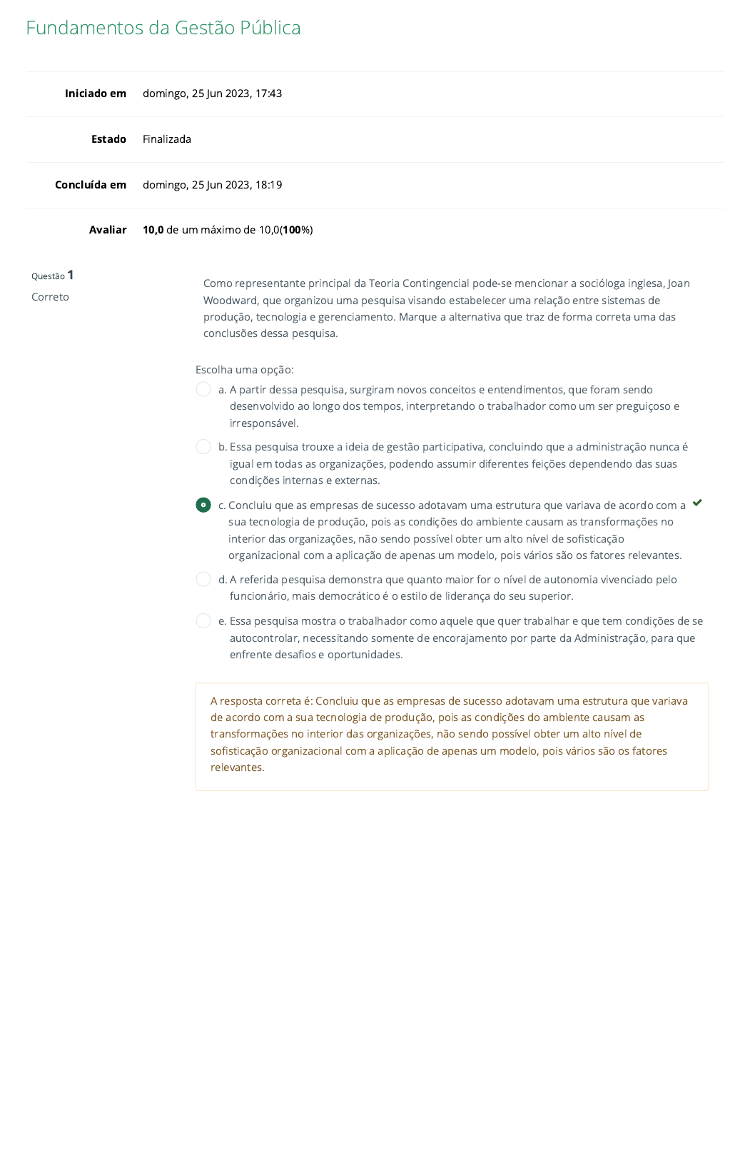 Fundamentos da Gestão Pública Questão 1 Correto Iniciado em domingo, 25 Jun 2023, 17:43 Estado Finalizada Concluída em domingo, 25 Jun 2023, 18:19 Avaliar 10,0 de um máximo de 10,0(100%) Como representante principal da Teoria Contingencial pode-se mencionar a socióloga inglesa, Joan Woodward, que organizou uma pesquisa visando estabelecer uma relação entre sistemas de produção, tecnologia e gerenciamento. Marque a alternativa que traz de forma correta uma das conclusões dessa pesquisa. Escolha uma opção: a. A partir dessa pesquisa, surgiram novos conceitos e entendimentos, que foram sendo desenvolvido ao longo dos tempos, interpretando o trabalhador como um ser preguiçoso e irresponsável. b. Essa pesquisa trouxe a ideia de gestão participativa, concluindo que a administração nunca é igual em todas as organizações, podendo assumir diferentes feições dependendo das suas condições internas e externas. c. Concluiu que as empresas de sucesso adotavam uma estrutura que variava de acordo com a sua tecnologia de produção, pois as condições do ambiente causam as transformações no interior das organizações, não sendo possível obter um alto nível de so�sticação organizacional com a aplicação de apenas um modelo, pois vários são os fatores relevantes. d. A referida pesquisa demonstra que quanto maior for o nível de autonomia vivenciado pelo funcionário, mais democrático é o estilo de liderança do seu superior. e. Essa pesquisa mostra o trabalhador como aquele que quer trabalhar e que tem condições de se autocontrolar, necessitando somente de encorajamento por parte da Administração, para que enfrente desa�os e oportunidades. A resposta correta é: Concluiu que as empresas de sucesso adotavam uma estrutura que variava de acordo com a sua tecnologia de produção, pois as condições do ambiente causam as transformações no interior das organizações, não sendo possível obter um alto nível de so�sticação organizacional com a aplicação de apenas um modelo, pois vários são os fatores relevantes. Questão 2 Correto “Não há dúvida e que a e�cácia é um princípio que não se deve subestimar na Administração de um Estado de Direito, pois o que importa aos cidadãos é que os serviços públicos sejam prestados adequadamente. Daí o fato de a Constituição o situar no topo dos princípios que devem conduzir a função administrativa dos interesses gerais. Entretanto, a e�cácia que a Constituição exige da administração não deve se confundir com a e�ciência das organizações privadas, nem é, tampouco, um valor absoluto diante dos demais. Agora, o princípio da legalidade deve �car resguardado, porque a e�cácia que a Constituição propõe é sempre suscetível de ser alcançada conforme o ordenamento jurídico, e em nenhum caso ludibriando este último, que haverá de ser modi�cado quando sua inadequação às necessidades presentes constitua um obstáculo para a gestão e�caz dos interesses gerais, porém nunca poderá se justi�car a atuação administrativa contrária ao direito, por mais que possa ser elogiado em termos de pura e�ciência.” (VILLA, Jesus Leguina. A Constituição Espanhola e a fuga do direito administrativo. Revista de Direito Administrativo Aplicado, ano 2, nº 6, set.1995, p.637.) Considerando esse conceito elaborado pelo ilustre autor Jesus Leguina Villa, assinale a alternativa correta. Escolha uma opção: a. A e�ciência é vista como um conjunto de comportamentos que a sociedade convencionou serem desejáveis ou necessários para o adequado funcionamento e convívio entre os indivíduos. b. Em complemento ao princípio da e�ciência segue o princípio da publicidade e a necessidade de evitar a criação de obrigações desnecessárias. c. proporcionar clareza e visibilidade social em face dos atos da Administração, uma vez que os atos do estado devem ser públicos já que são emanados ‘do’ poder público, ‘no’ interesse público, ‘para’ o público e ‘de conhecimento’ público. d. A e�ciência apresenta-se por meio de dois aspectos: em relação ao modo de atuação do agente público, do qual se espera um bom desempenho e bons resultados; e em relação ao modo de organizar, estruturar, disciplinar a Administração Pública, também com o objetivo de alcançar os melhores resultados na prestação do serviço público. e. Esse princípio pode ser aplicado quando se reconhece a validade dos atos praticados por funcionário irregularmente investidos no cargo ou função, já que os atos são atribuídos ao órgão e não ao agente público. A resposta correta é: A e�ciência apresenta-se por meio de dois aspectos: em relação ao modo de atuação do agente público, do qual se espera um bom desempenho e bons resultados; e em relação ao modo de organizar, estruturar, disciplinar a Administração Pública, também com o objetivo de alcançar os melhores resultados na prestação do serviço público. Questão 3 Correto Questão 4 Correto Acerca da Teoria Sistêmica é interessante mencionar o conceito trazido pelo autor Stanford Levin Optner: “O objetivo do sistema é precisar a �nalidade para a qual são organizados seus componentes (entradas, processamentos e saídas) e as relações desse sistema. Enquanto as suas restrições são as limitações introduzidas em seu funcionamento, devendo haver sempre um pleno alinhamento com as características e variáveis do ambiente externo em que o sistema está localizado.” (OPTNER, Stanford Levin. Análise de sistemas empresariais. Rio de Janeiro: Ao Livro Técnico, 1971). Assinale a alternativa que traz a�rmações corretas sobre a Teoria Sistêmica. Escolha uma opção: a. Para que seja possível entender um subsistema, é preciso observar cada subsistema de forma isolada e não o todo onde ele está inserido. b. A Teoria Sistêmica serviu como uma reação contra a crueldade, o nepotismo e os ju