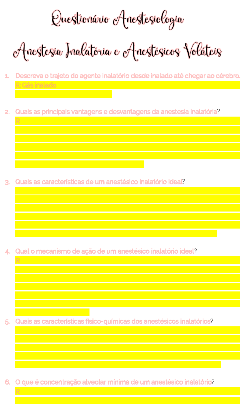ANESTESIOLOGIA VETERINÁRIA @IZACSSR 1. Descreva o trajeto do agente inalatório desde inalado até chegar ao cérebro. R: Gás inalado → membrana alveolar → difusão sanguínea → SNC/tecidos → efeitos depressores → anestesia. 2. Quais as principais vantagens e desvantagens da anestesia inalatória? R: As vantagens da anestesia inalatória incluem maior e melhor controle do plano anestésico, recuperação rápida, rápida eliminação por via aérea (até 98%), rápida metabolização (0,2%), não tem efeito cumulativo, pode manter por tempo prolongado e baixo consumo. As desvantagens são: requer aparelhos específicos, treinamento de profissionais e profissional específico para executar o procedimento de anestesia. 3. Quais as características de um anestésico inalatório ideal? R: Um anestésico inalatório ideal deve ter: Ação previsível, indução e recuperação rápidas, odor agradável, ausência de efeitos adversos renais e hepáticos, depressão cardiovascular mínima, não sensibilizar o miocárdio à ação das catecolaminas, não ser inflamável, biotransformação mínima ou ausente, possibilidade de monitoração da concentração inspirada e expirada (CAM clínica), estabilidade química, fácil administração e custo baixo. 4. Qual o mecanismo de ação de um anestésico inalatório ideal? R: Os anestésicos inalatórios estabelecem o plano anestésico por seus efeitos na atividade neuronal espontânea e metabolismo. Não há receptor específico nem local único de ação. Sugere-se que o estado de anestesia seja instalado a partir dos efeitos inibitórios nos receptores GABAa e glicina. Agem no sistema reticular ativador, córtex cerebral, núcleo cuneado, córtex olfatório e hipocampo. Deprimem transmissão excitatória na medula espinhal e também agem no tronco cerebral. 5. Quais as características físico-químicas dos anestésicos inalatórios? R: As características físicas determinam os meios pelos quais os anestésicos devem ser administrados, a cinética no organismo e influenciam nos períodos de indução e recuperação da anestesia. Já as características químicas determinam a ação e segurança na administração, apresentação física do fármaco (gás ou líquido), indica estabilidade à luz, calor e solubilidade. 6. O que é concentração alveolar mínima de um anestésico inalatório? R: CAM ou concentração alveolar mínima é definida como a concentração alveolar de um agente, a uma atmosfera de pressão, capaz de evitar em 50% ANESTESIOLOGIA VETERINÁRIA @IZACSSR dos pacientes movimentos intencionais em resposta a um estímulo supramáximo. 7. O que é coeficiente de solubilidade de um anestésico inalatório? R: Razão entre as quantidades do anestésico dissolvido em dois meios diferentes quando há equilíbrio entre eles/capacidade de determinado solvente em dissolver o gás anestésico. 8. O que é pressão de vapor de um anestésico inalatório? R: É a pressão que as moléculas de vapor exercem no estado de equilíbrio. Quanto maior a pressão de vapor, maior a capacidade de evaporação. 9. O que é ponto de ebulição de um anestésico inalatório? R: É a temperatura em que a pressão de vapor do líquido é igual à pressão atmosférica. Quanto menor o ponto de ebulição, mais facilmente o fármaco se transforma em vapor. 10. O que é peso molecular de um anestésico inalatório? R: O peso molecular influencia em determinar a capacidade do anestésico em atravessar as membranas celulares. Quanto maior o peso molecular, mais difícil de atravessar as barreiras placentária e hematoencefálica. 11. Quais os principais fatores que alteram a captação, a distribuição e a eliminação dos anestésicos inalatórios? 12. Quais os principais agentes inalatórios e as características principais de cada um? R: Isofluorano: - isômero de enfluorano, estável; - produz rápida indução e recuperação da anestesia; - pode ser utilizado em todas as spp.; - absorvido e eliminado pelos alvéolos; - excretado na íntegra pelos pulmões; - pouco eliminado pelo sistema renal; - pouco degradado (0,25% é metabolizado). ANESTESIOLOGIA VETERINÁRIA @IZACSSR Sevofluorano: - baixo coeficiente de gás : sangue 0,6 a 0,7; - indução e recuperação rápidas e suaves; - CAM aprox. de 2,4%; - não pungente (odor agradável); - relativamente estável na cal sodada; - depressor do SNC; - produz bom miorrelaxamento e analgesia; - depressão cardiorrespiratória dose dependente; - não sensibiliza o miocárdio às catecolaminas. 13. Quais os principais efeitos dos anestésicos inalatórios nos vários sistemas do organismo? R: Isofluorano: - SNC: depressão generalizada, fluxo sanguíneo estável na ventilação correta; - SISTEMA RESPIRATÓRIO: depressão resp; PaCO2 aumenta com o tempo; - SISTEMA CARDIOVASCULAR: depressão cardáica menor que o halotano, diminuição da contratilidade muscular, ocorre vasodilatação importante; hipotensor, não sensibiliza o miocárdio às catecolaminas; - SISTEMA GASTROINTESTINAL: diminui a motilidade intestinal, não hepatotóxico; - SISTEMA RENAL: não altera a função; - SISTEMA MUSCULAR: excelente miorrelaxamento, potencializa os miorrelaxantes, pode causar hipertemia maligna em suínos; - ÚTERO E FETO: atravessa rapidamente a placenta, reduz o tônus uterino, segurança. Sevofluorano: - SNC: depressão generalizada, aumento do fluxo sanguíneo cerebral, sem potencial de promover convulsões; - SISTEMA RESPIRATÓRIO: depressão cardiorrespiratória dose dependente; - SISTEMA CARDIOVASCULAR: depressão dose dependente; - SISTEMA GASTROINTESTINAL: mantém fluxo sanguíneo hepático; - SISTEMA RENAL: diminui levemente, redução na taxa glomerular; - SISTEMA MUSCULAR: bom relaxamento muscular; - ÚTERO E FETO: atravessa a placenta, produz depressão fetal.