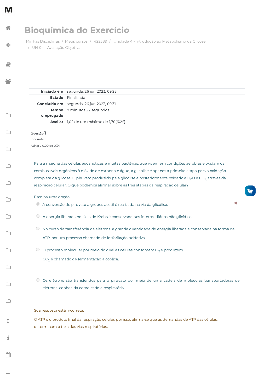 Minhas Disciplinas / Meus cursos / 422389 / Unidade 4 - Introdução ao Metabolismo da Glicose / UN 04 - Avaliação Objetiva Bioquímica do Exercício Iniciado em segunda, 26 jun 2023, 09:23 Estado Finalizada Concluída em segunda, 26 jun 2023, 09:31 Tempo empregado 8 minutos 22 segundos Avaliar 1,02 de um máximo de 1,70(60%) Questão 1 Incorreto Atingiu 0,00 de 0,34 Para a maioria das células eucarióticas e muitas bactérias, que vivem em condições aeróbias e oxidam os combustíveis orgânicos à dióxido de carbono e água, a glicólise é apenas a primeira etapa para a oxidação completa da glicose. O piruvato produzido pela glicólise é posteriormente oxidado a H O e CO através da respiração celular. O que podemos a�rmar sobre as três etapas da respiração celular? Escolha uma opção: A conversão de piruvato a grupos acetil é realizada na via da glicólise. A energia liberada no ciclo de Krebs é conservada nos intermediários não glicídicos. No curso da transferência de elétrons, a grande quantidade de energia liberada é conservada na forma de ATP, por um processo chamado de fosforilação oxidativa. O processo molecular por meio do qual as células consomem O e produzem CO é chamado de fermentação alcóolica. Os elétrons são transferidos para o piruvato por meio de uma cadeia de moléculas transportadoras de elétrons, conhecida como cadeia respiratória. 2 2, 2 2 Sua resposta está incorreta. O ATP é o produto �nal da respiração celular, por isso, a�rma-se que as demandas de ATP das células, determinam a taxa das vias respiratórias. https://avap.multivix.edu.br/my/ https://avap.multivix.edu.br/course/view.php?id=20339 https://avap.multivix.edu.br/course/view.php?id=20339§ion=5 https://avap.multivix.edu.br/mod/quiz/view.php?id=1332212 https://avap.multivix.edu.br/my/ https://avap.multivix.edu.br/course/view.php?id=20339 https://avap.multivix.edu.br/user/index.php?id=20339 https://avap.multivix.edu.br/course/view.php?id=20339§ion=1 https://avap.multivix.edu.br/course/view.php?id=20339§ion=2 https://avap.multivix.edu.br/course/view.php?id=20339§ion=3 https://avap.multivix.edu.br/course/view.php?id=20339§ion=4 https://avap.multivix.edu.br/course/view.php?id=20339§ion=5 https://avap.multivix.edu.br/course/view.php?id=20339§ion=6 https://avap.multivix.edu.br/course/view.php?id=20339§ion=7 https://avap.multivix.edu.br/course/view.php?id=20339§ion=8 https://avap.multivix.edu.br/course/view.php?id=20339§ion=9 https://avap.multivix.edu.br/course/view.php?id=20339§ion=10 https://avap.multivix.edu.br/course/view.php?id=20339§ion=11 https://avap.multivix.edu.br/course/view.php?id=20339§ion=12 https://avap.multivix.edu.br/hooks/portal/ https://avap.multivix.edu.br/mod/page/view.php?id=1252%2F%22%20target%3D%22_blank https://avap.multivix.edu.br/calendar/view.php/ https://avap.multivix.edu.br/local/staticpage/view.php?page=biblioteca https://avap.multivix.edu.br/ Questão 2 Correto Atingiu 0,34 de 0,34 O glicogênio é uma forma de armazenamento prontamente mobilizada de glicose. Trata-se de um polímero rami�cado muito grande de resíduos de glicose, que pode ser decomposto para produzir moléculas de glicose quando há necessidade de energia. Os resíduos de glicose no glicogênio estão ligados, em sua maioria, por ligações glicosídicas α-1,4, enquanto as rami�cações são criadas por ligações glicosídicas α-1,6. Em que consiste o metabolismo do glicogênio? Escolha uma opção: A ação da glicogênio fosforilase prossegue ao longo da cadeia, liberando os resíduos de glicose da cadeia rami�cada. A degradação de glicogênio não é um processo rápido e e�ciente, graças à estrutura e à ausência das enzimas de degradação intimamente associadas aos grânulos de glicogênio. A degradação do glicogênio, a gliconeogênese, consiste na remoção sucessiva de resíduos de glicose. A degradação do glicogênio hepático é responsável pela manutenção da glicemia nos períodos entre as refeições, sobretudo durante o jejum noturno. O glicogênio dos músculos esqueléticos provê energia para os demais órgãos e tecidos. Sua resposta está correta. Entre as refeições e durante atividade física, o fígado libera glicose no sangue, que é captada pelo cérebro e pelo músculo esquelético. https://avap.multivix.edu.br/my/ https://avap.multivix.edu.br/course/view.php?id=20339 https://avap.multivix.edu.br/user/index.php?id=20339 https://avap.multivix.edu.br/course/view.php?id=20339§ion=1 https://avap.multivix.edu.br/course/view.php?id=20339§ion=2 https://avap.multivix.edu.br/course/view.php?id=20339§ion=3 https://avap.multivix.edu.br/course/view.php?id=20339§ion=4 https://avap.multivix.edu.br/course/view.php?id=20339§ion=5 https://avap.multivix.edu.br/course/view.php?id=20339§ion=6 https://avap.multivix.edu.br/course/view.php?id=20339§ion=7 https://avap.multivix.edu.br/course/view.php?id=20339§ion=8 https://avap.multivix.edu.br/course/view.php?id=20339§ion=9 https://avap.multivix.edu.br/course/view.php?id=20339§ion=10 https://avap.multivix.edu.br/course/view.php?id=20339§ion=11 https://avap.multivix.edu.br/course/view.php?id=20339§ion=12 https://avap.multivix.edu.br/hooks/portal/ https://avap.multivix.edu.br/mod/page/view.php?id=1252%2F%22%20target%3D%22_blank https://avap.multivix.edu.br/calendar/view.php/ https://avap.multivix.edu.br/local/staticpage/view.php?page=biblioteca https://avap.multivix.edu.br/ Questão 3 Incorreto Atingiu 0,00 de 0,34 Em mamíferos, alguns tecidos dependem quase completamente de glicose para sua energia metabólica. Para o cérebro humano e o sistema nervoso, assim como para os eritrócitos, os testículos, a medula renal e os tecidos embrionários, a glicose do sangue é a principal ou a única fonte de combustível. Apenas o cérebro requer em média 120 g de glicose por dia, mais da metade de toda a glicose estocada como glicogênio nos músculos e no fígado. O suprimento 
