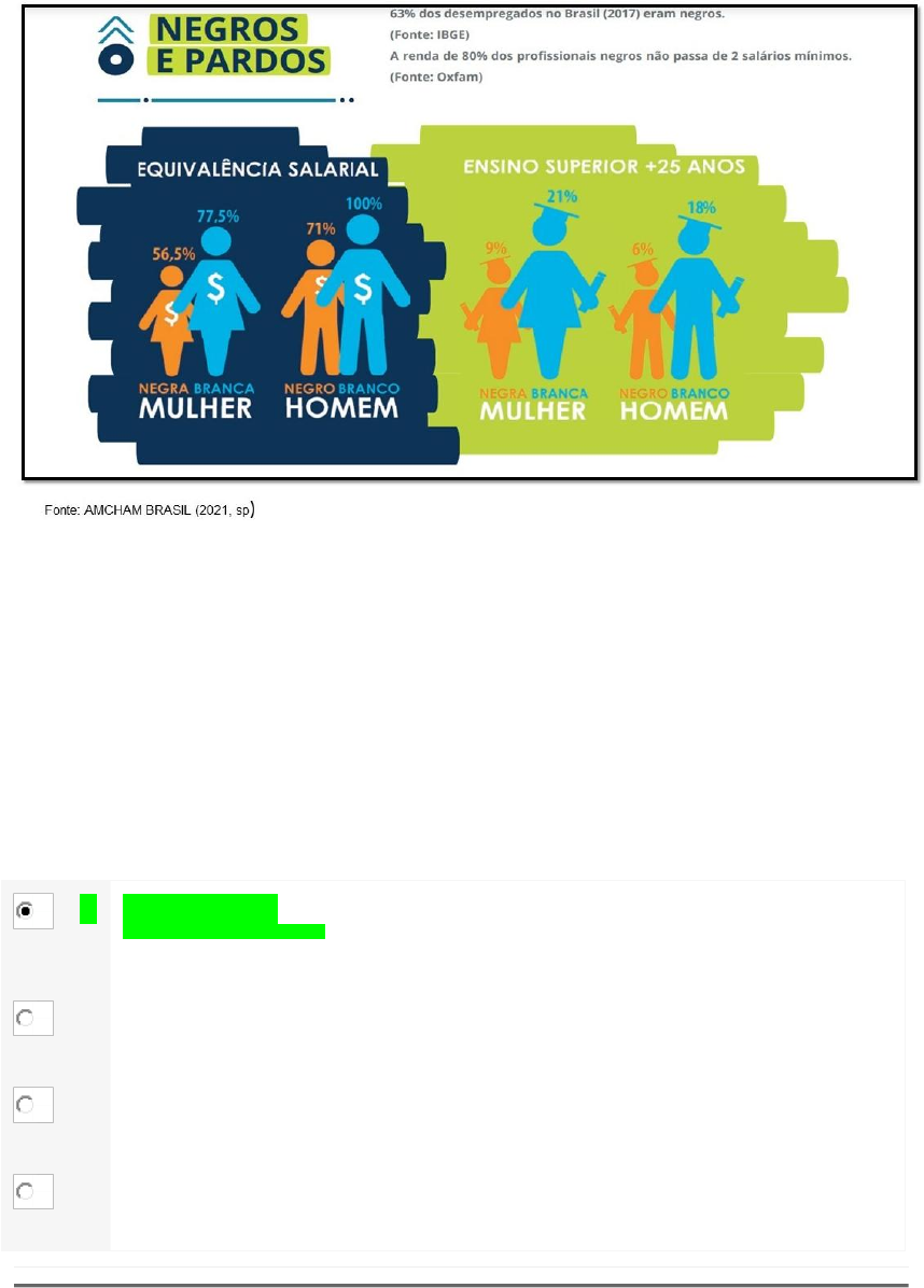 Questão 1/7 - Gestão da Diversidade As relações assimétricas entre homens e mulheres, ou pretos e brancos, não são elaborações inatas de nenhuma população humana, mas de comportamento culturalmente aprendido e ensinado (BUTLER, 2017). Neste sentido, evidenciam-se assimetrias sociais para o tratamento de mulheres brancas e negras, homens negros e mulheres negras em várias perspectivas. Assim, é possível observar na figura abaixo a representação desta assimetria evidenciada pela ANCHAM Brasil (2021, n.p.) Analise as afirmativas a seguir que revelam o panorama das pessoas negras no trabalho, conteúdo da Rota 3 da disciplina de Gestão da Diversidade em consonância com o texto acima, e marque V para as asserções verdadeiras e F para as asserções falsas: I. ( ) Os cargos hierárquicos de liderança são ocupados por homens brancos e de classe média alta e, na maioria das vezes, sem o conhecimento sobre a questão racial no Brasil — o que leva à falta de conscientização e o engajamento sobre a assimetria existente. II. ( ) Quando existe a ocupação de cargos de maior nível hierárquico por pessoas negras, geralmente, são confundidas com trabalhadores (ras) de funções operacionais. III. ( ) A discriminação indireta em processos seletivos: inúmeras publicações e pesquisas relevam que trabalhadores (ras) negros (ras) tem sua capacidade questionada e são avaliados com notas inferiores com relação aos colaboradores brancos. IV. ( ) A discriminação pela aparência: situação que ocorre com pedidos da liderança imediata para que trabalhadores (ras) negros (ras) cortem e ou alisem o cabelo afro. Agora, assinale a alternativa que apresenta a sequência correta: A V – V – V – V Você assinalou essa alternativa (A) B V – F – V – V C F – V – V – F D V – V – F – F Questão 2/7 - Gestão da Diversidade A implementação de políticas cujo objetivo é o estímulo à diversidade nas organizações tem se consolidado na pauta empresarial em todo o mundo. Uma das principais razões é a diferença na força de trabalho. As questões como gênero, etnia, orientação sexual, idade, crença religiosa ou deficiências, por exemplo, evidenciam a heterogeneidade (FLEURY, 2000; NKOMO; COX, 1994), demandando práticas que harmonizem lucro e justiça social (ROBINS; COULTER, 1998). Analise as assertivas a seguir que revelam os benefícios da diversidade para as organizações do trabalho, conteúdo da disciplina de Gestão da Diversidade em consonância com o texto acima, e marque V para as asserções verdadeiras e F para as asserções falsas: I. ( ) Criatividade e inovação facilitadas pelo perfil heterogêneo dos colaboradores. II. ( ) Competência de liderança para que os gerentes estejam preparados para as possíveis situações de tensão nas relações interpessoais do ambiente de trabalho em função das diferenças. III. ( ) Intercâmbio de conhecimento e valores nos relacionamentos entre os colaboradores. Intensifica-se, assim, a reflexão e identificação de novos valores pessoais. IV. ( ) Enriquecimento do clima organizacional positivo nos relacionamentos e retenção de talentos pela valorização da diversidade. Agora, assinale a alternativa que apresenta a sequência correta: A V – F – V – F B V – F – V – V Você assinalou essa alternativa (B) C F – V – V – F D V – V – F – F Questão 3/7 - Gestão da Diversidade No conteúdo da Rota 6 da Disciplina de Gestão da Diversidade, sobre as tendências da gestão de diversidade nas organizações, nos é revelado que o futuro e a diversidade precisam ser pensados para trazerem indícios importantes sobre os novos contornos da diversidade e inclusão nos cenários futuros. Considerando o contexto atual, as organizações precisam se atentar para as grandes mudanças sociais introduzidas em 2020, principalmente pela influência da pandemia do novo coronavírus que impulsionou novas formas de trabalho e profissões, entre outros. Analise as afirmativas a seguir que contemplem as tendências: I. Os efeitos do Covid-19 vieram para ficar e uma dessas grandes mudanças se refere ao processo de diversidade e inclusão nas organizações, que deverá estar cada vez mais alinhado às tendências do mundo e ao core business (negócio principal em tradução livre) para garantir a sua existência a longo prazo em mercados futuros II. Haverá a diminuição no número de empresas brasileiras interessadas no tema da diversidade e crescimento do debate sobre as Interseccionalidades, ou seja, um olhar cruzado que considera de forma mais ampla as necessidades de alguns sujeitos III. A formalização de uma carreira em Diversidade e Inclusão com a criação de funções como o de Chief Inclusion Officer, gerentes e analistas de Diversidade e Inclusão passam a ser uma nova realidade e também uma oportunidade de carreira. IV. Os grupos de afinidade passaram a colaborar com a estratégia de atração e retenção de talentos das companhias. São chamados de ERGs (Employee Resource Groups) São corretas apenas as afirmativas: A I,II e III B I, III e IV C Somente I e IV D Somente III e IV Você assinalou essa alternativa (D) Questão 4/7 - Gestão da Diversidade Segundo a Gestão Kairós (2020, p. 6), um programa de diversidade bem-sucedido é aquele capaz de incorporar à cultura de uma organização os conceitos mais importantes da Diversidade e Inclusão. Espera-se que, a partir deste modelo, crie-se um ambiente em que todos os funcionários possam conviver de forma harmônica e no qual todas as pessoas tenham oportunidades iguais de desenvolvimento profissional. Como estudado no conteúdo da Rota 6 da disciplina de Gestão da Diversidade, o plano de ação apresenta alguns elementos. Enumere, na ordem sequencial, as explicações que se relacionam a cada um dos elementos a seguir: 1. Aspectos do programa 2. Elementos do Plano de Ação 3. Metodologia 5W2H 4. Diagnóstico de diversi