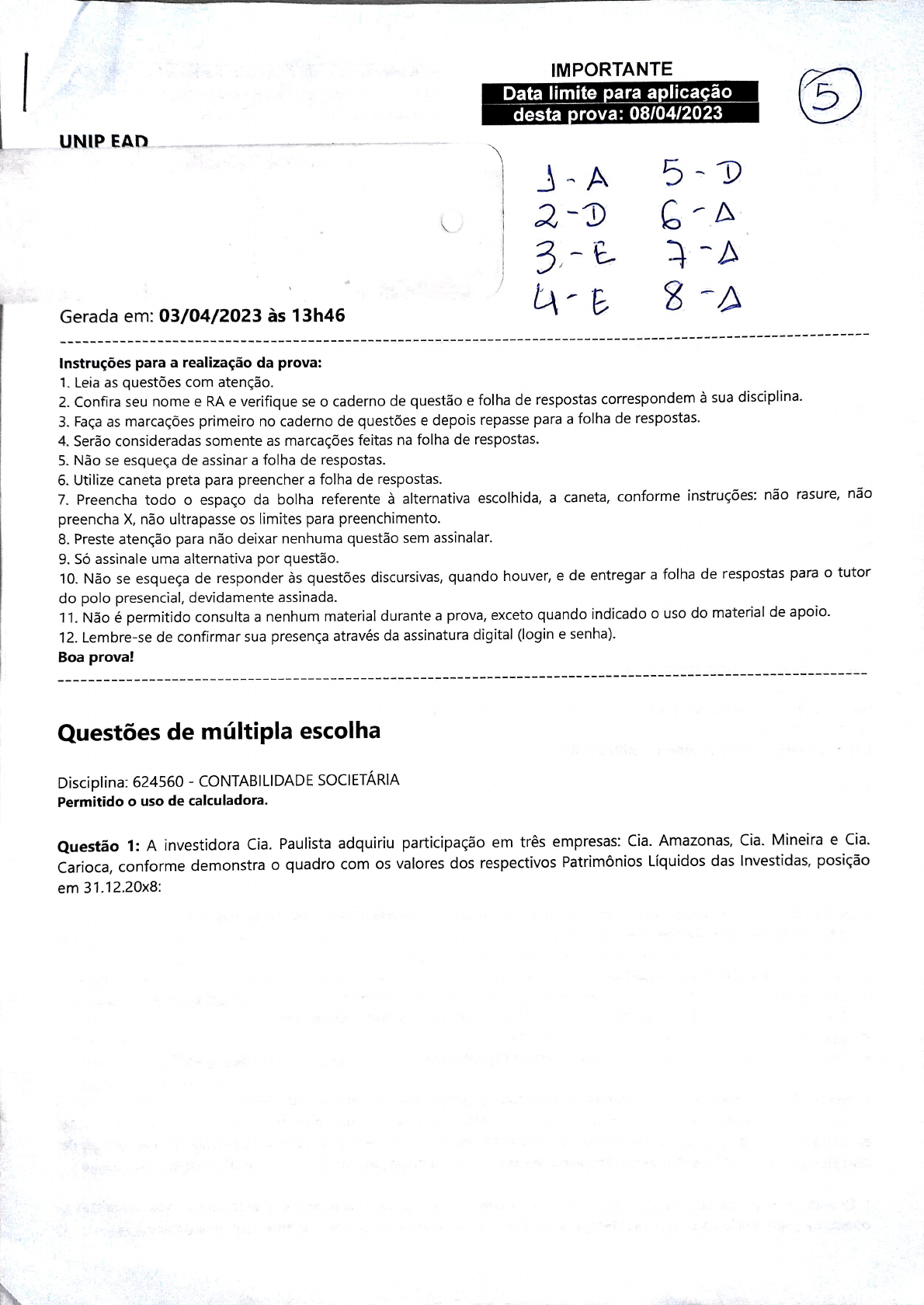 PROVA CONTABILIDADE SOCIETÁRIA UNIP 2023
