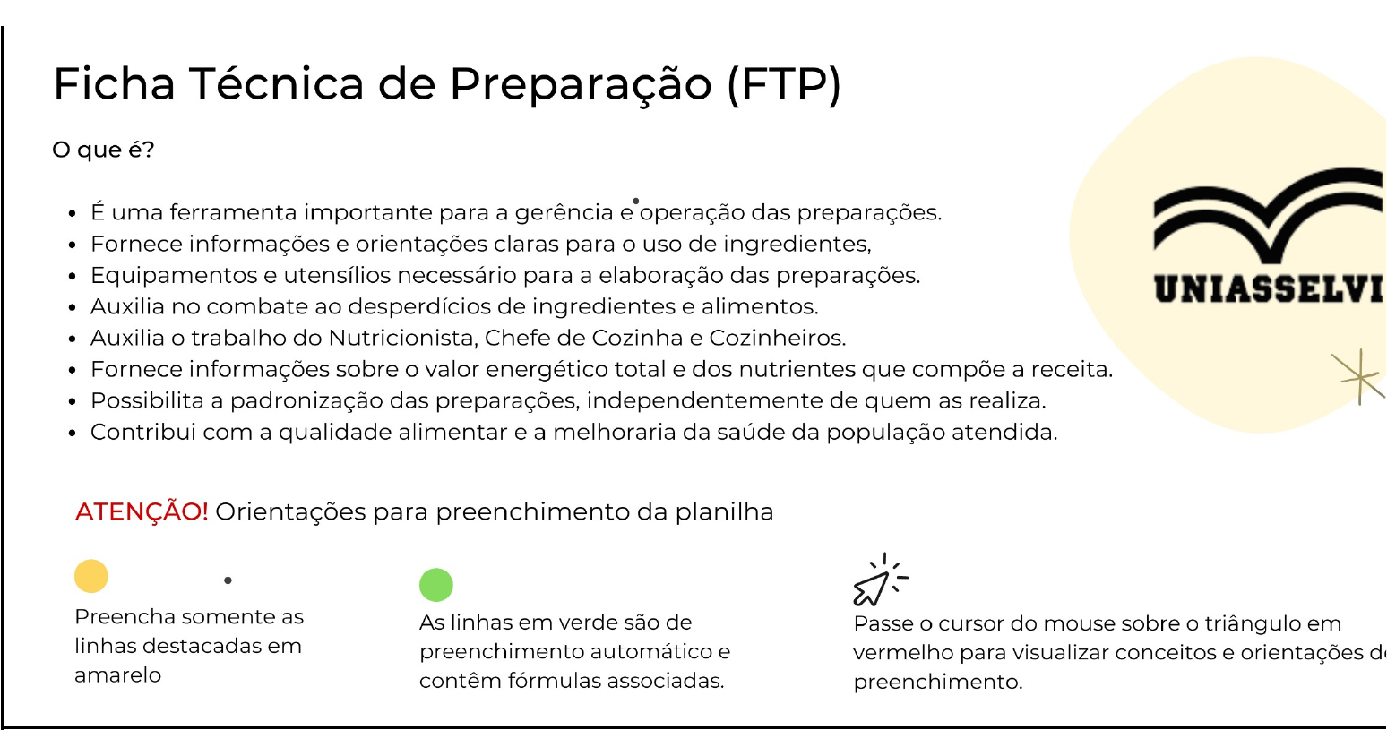 Orientações user: Muito bem! Você encontrou! Ficha Técnica Tema da aula: Nome da preparação: Descrição da preparação: Redimento da receita: user: Informar com o total do peso líquido final colocado em Kg. g Peso da porção (per capta): user: Para obter este valor deve-se analisar a medida caseira (colher de sopa, fatia, etc.) de uma porção e pesar para saber sua quantidade em gramas. g Rendimento da porção: user: É o resultado da divisão do total do peso líquido final da preparação (pronta para servir) pelo peso da porção. Deve-se sempre arredondar o valor para baixo, pois se arredondarmos para cima, é provável que em algum momento, a receita renda menos do que deveria render. Para calcular, utiliza-se a fórmula: Rendimento da porção: peso líquido final da preparação / peso da porção porções Tempo de preparo: user: Tempo que foi utilizado para executar a receita, incluindo o pré-preparo e o preparo. min Medida caseira da preparação: user: Buscar como referência o per capta dos alimentos disponíveis no Anexo C do GAPB (BRASIL, 2008). Utilizar sempre medidas caseiras completas. Exemplo: Cheia, rasa, nivelada Custo da preparação: user: Obtido através do custo bruto da preparação. ERROR:#DIV/0! user: Para calcular de forma automática, é preciso excluir as linhas excedentes (em branco) na tabela abaixo. Custa da porção (per capta): user: Resultado da divisão do custo total da preparação pelo número de porções que esta rendeu. ERROR:#DIV/0! INGREDIENTES user: Para funcionamento de todos os cálculos, deverá ser excluídas as linhas em branco dentro da tabela. Peso Bruto (g) user: É o peso do alimento na forma que ele é adquirido, ou seja, com cascas, sementes, talos ou ossos. Peso Líq inicial (g) user: É o peso do alimento no estado cru e após o pré-preparo do alimento. Exemplos: fruta descascada; frango descongelado, sem gordura e peles; massa crua. Peso Líq final (g) user: É o peso do alimento depois de limpo e pronto para o consumo. Exemplos: suco de frutas ou fruta picada; frango assado; massa cozida. Fator de Correção user: O Fator de Correção (FC) preve as perdas inevitáveis que ocorrem durante a etapa do pré-preparo, quando os alimentos são limpos, descascados, desossados, ou cortados. Para calcular o FC, utiliza-se a fórmula: PC = peso bruto / peso líquido inicial Indicador de Cocção user: O Indicador de Cocção (IC) é utilizado para determinar a variação de peso e volume que o alimento apresenta decorrente da etapa de cocção. Para calcular o IC, utiliza-se a fórmula: IC = peso líquido final / peso líquido inicial Indicador de Reidratação user: O Indicador de Reidratação (IR) estima a incorporação de água na etapa de remolho. Para calcular, utiliza-se a fórmula: IR = Peso do alimento reidratado / peso do alimento seco Custo Bruto CB user: Buscar o preço disponível no mercado por ingrediente (em gramas, kg, litros ou ml). Pode ser tanto no mercado mesmo, como em mercados online. Custo da Preparação user: Obtido através do custo bruto da preparação. Medida Caseira user: Informar a medida caseira completa. Exemplos: 1 colher de sopa cheia 1/2 xícara de chá PB PL in PL fin FC IC IR R$ user: Inserir o preço (R$) do ingrediente. user: Obtido através do custo bruto da preparação. Peso user: Inserir o peso do produto informado na embalagem. Exemplo: óleo de soja é comercializado em embalagem de 900ml. user: Informar a medida caseira completa. Exemplos: 1 colher de sopa cheia 1/2 xícara de chá CP ERROR:#DIV/0! ERROR:#DIV/0! ERROR:#DIV/0! ERROR:#DIV/0! ERROR:#DIV/0! ERROR:#DIV/0! ERROR:#DIV/0! ERROR:#DIV/0! ERROR:#DIV/0! ERROR:#DIV/0! ERROR:#DIV/0! ERROR:#DIV/0! ERROR:#DIV/0! ERROR:#DIV/0! ERROR:#DIV/0! ERROR:#DIV/0! ERROR:#DIV/0! ERROR:#DIV/0! ERROR:#DIV/0! ERROR:#DIV/0! ERROR:#DIV/0! ERROR:#DIV/0! ERROR:#DIV/0! ERROR:#DIV/0! ERROR:#DIV/0! ERROR:#DIV/0! ERROR:#DIV/0! ERROR:#DIV/0! ERROR:#DIV/0! ERROR:#DIV/0! ERROR:#DIV/0! ERROR:#DIV/0! ERROR:#DIV/0! ERROR:#DIV/0! ERROR:#DIV/0! ERROR:#DIV/0! ERROR:#DIV/0! ERROR:#DIV/0! ERROR:#DIV/0! ERROR:#DIV/0! ERROR:#DIV/0! ERROR:#DIV/0! ERROR:#DIV/0! ERROR:#DIV/0! ERROR:#DIV/0! TOTAL 0 **** **** **** ERROR:#DIV/0! **** Informações sobre a preparação Tema da aula: 0 Nome da preparação: 0 Modo de preparo user: user: Descrever detalhadamente como foi elaborada a receita passo a passo. Técnica utilizada user: user: Características da Preparação: Análise Sensorial da Porção Tempo de preparo (min): Cor: Temperatura de Cocção: Sabor: Peso Bruto Total (g): user: É o peso total de todos os ingredientes da preparação antes de serem descascados, cortados, picados ou cozidos. Cheiro: Peso Líquido Inicial (g): user: É o peso total de todos os ingredientes da preparação que serão submetidos à cocção antes de serem expostos a esta. Consistência: Peso Líquido Final(g): user: É o peso obtido após a cocção. user: user: Aceitação: Fator de Cocção da preparação: user: user: Para saber qual o fator de cocção da preparação deve-se dividir o peso final da preparação pelo seu peso inicial. Valor Calórico da Porção (kcal): ERROR:#DIV/0! Nível de Dificuldade Peso da porção per capta (g): 0 ( ) Difícil Medida caseira da preparação: 0 ( ) Médio Rendimento da porção: 0 ( ) Fácil Informação Nutricional Tema da aula: 0 Nome da preparação: 0 Rendimento da receita: 0 g Peso da porção (per capta): 0 g Rendimento da porção: 0 porções Alimento user: Quando o alimento não fornecer nutriente, informar o número zero. Exemplo: sal - 0g de Proteína. Informar até 3 casas demais. Arredondamentos devem ser realizados somente no final. Sempre que o alimento for cozido, e tiver o alimento cozido na tabela nutricional, utilizar este. Porém, lembre-se de usar também o peso do alimento cozido. Quant. user: Para este cálculo, devemos sempre utilizar o peso líquido inicial da preparação para compor o item quantidade e verific