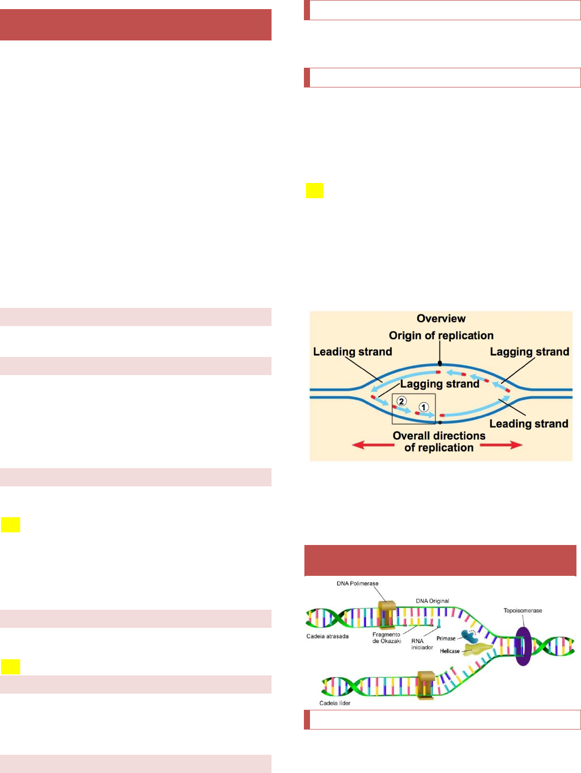 Millena Fernandes l @medmillena Replicação do DNA CARACTERÍSTICAS ◊ Ocorre na interfase (fase S). ◊ Célula só replica o DNA para fazer mitose (divisão celular) ◊ Há gasto de energia. ◊ Ocorre no núcleo. ◊ Não pode ocorrer erros para não gerar mutação (menor taxa de erro) ◊ Processo preciso e com atividade corretiva (DNA polimerase). ◊ Replicação de 100 nucleotídeos por segundo. - Célula copia o equivalente a um livro de 1000 páginas em 8h, errando apenas 2 letras. ◊ Semiconservativa: cada nova molécula de DNA é feita de uma fita antiga de uma nova (a replicada). ◊ A ordem das bases determina a complementariedade das fitas A=T (locais de início começam com AT -> mais fácil de quebrar); CG Helicase ◊ Enzima que separa as fitas (quebra as ponte de hidrogênio). DNA primase ◊ Adiciona o primer (segmento de RNA). - É orientado no sentido 5’ -> 3’ (antiparalelo). ◊ É pareado ao DNA e tem como função iniciar a polimerização da fita. ◊ Importante: por ser RNA, o primer precisa ser removido. Logo, a RNAse H exonuclease faz isso. DNA polimerase ◊ Só consegue adicionar o nucleotídeo na extremidade 3’, no sentido 5’ -> 3’ (IMPORTANTE). OBS: adiciona na extremidade 3’, mas cresce no sentido da vida. ◊ Para isso, adiciona-se um novo primer, permitindo que ela adicione entre os primers (replica em “pedacinhos”) na FITA DESCONTÍNUA. ◊ Uma fita é feita de forma contínua (LÍDER) e outra de modo descontínuo (ATRASADA). Fragmentos de Okazaki ◊ Estão entre os primers; de um primer a outro. ◊ Pedacinhos de DNA da fita descontínua. OBS: formação de um Y deitado -> forquilha de replicação. RNAse H exonuclease ◊ Remove o/os primer/primers pareado(s) ao DNA. ◊ Após a remoção do primer, fica um vão entre os fragmentos de Okazaki. Assim, outra DNA polimerase adiciona nucleotídeos de DNA para completar a fita. DNA ligase ◊ Une os fragmentos de DNA para ter uma fita contínua. Fases ◊ Iniciação: helicase ◊ Alongamento: primase e DNA polimerase. ◊ Término: remoção do primer e DNA ligase. Origem de replicação ◊ Local onde ocorre a abertura inicial do DNA, formando as bolhas de replicação (forquilha de replicação) ◊ Regiões ricas em A=T - Facilita o trabalho da helicase. - Espalhadas ao longo de todos os cromossomos. - Locais onde há abertura inicial do DNA. OBS: o genoma humano possui 10.000 origens de replicação. ◊ Se fosse feito de cromossomo em cromossomo, demoraria 30 dias; mas leva em média 7 horas. ◊ Separa somente a parte que será necessária. ◊ Inicia-se em vários sítios: - Fundamental para que as enormes moléculas de DNA se repliquem em períodos de tempo curtos. - Dentro dos cromossomos existem várias “origem de replicação”. ◊ Forquilhas de replicação: - Onde há a síntese de DNA. - Estruturas em forma de Y. - Duas forquilhas são geradas a partir de 1 origem de replicação. - Processo bidirecional. MAQUINARIA DA REPLICAÇÃO Helicase “zíper” ◊ Faz a hidrólise da dupla fita. Millena Fernandes l @medmillena ◊ Utiliza a energia da hidrólise do ATP para separar a dupla hélice. Topoisomerase (DNA girase) ◊ Alivia a tensão na fita. ◊ Altera o grau de superenovelamento do DNA. ◊ Vai desenrolando o DNA para abri-lo facilmente. Está sempre presente. OBS: a inibição da topoisomerase impediria a replicação, devido a quebra do DNA (morte de células tumorais). ssb proteína ◊ Proteína estabilizadora de fita simples. ◊ Se liga à fita simples do DNA exposta pela helicase evitando o repareamento de bases e mantendo a fita alongada para a DNA polimerase. OBS: NÃO possui afinidade por dupla hélice. DNA primase ◊ Enzima de produz pequenos segmentos de RNA (10 nucleotídeos) chamados primers ◊ Avisa a DNA polimerase onde ela deve iniciar a replicação. - Fita líder: apenas um para iniciar. - Fita retardada: novos a cada intervalo. DNA ligase ◊ União dos fragmentos após a polimerização pela DNA polimerase. ◊ Restaura as ligações fosfodiéster. ◊ Transforma a fita em um segmento único. Exonuclease (RNAse) ◊ Remove nucleotídeos de RNA (primer). ◊ Identifica e remove cada iniciador de RNA. DNA polimerase ◊ Catalisa a ligação fosfodiéster pela adição de novos nucleotídeos na extremidade 3’-OH. ◊ Tem função corretiva (autocorretiva); ◊ Só catalisa a reação se o pareamento estiver correto. ◊ Após adicionar a próxima fase, ela verifica se o nucleotídeo inserido está correto. - Removem o nucleotídeo 3-OH incorretamente emparelhado (ATIVIDADE EXONUCLEOTÍDICA 3’->5’). Inversa ao sentido da cadeia. - Importante para garantir a estabilidade genética ao longo das gerações. ◊ Para que ela inicia sua ação é necessário que outra enzima adicione os primeiros nucleotídeos. Replissomo ◊ Junção de enzimas e cofatores que formam o complexo de replicação. ◊ Complexo necessário para a replicação do DNA. Telômeros ◊ São empacotados em estruturas especializadas que protegem as extremidades cromossômicas. ◊ Final do DNA descontínuo não consegue finalizar, pois com a retirada do primer, a polimerase não tem como replicar por não ter primer (pois foi retirado). ◊ Regiões teloméricas: NÃO TEM EXTREMIDADE 3’ para conectar. ◊ Telomerase: adiciona múltiplas cópias de uma curta sequência nucleotídica em extremidades 3’ dos cromossomos eucarióticos. - Adiciona na cadeia líder.