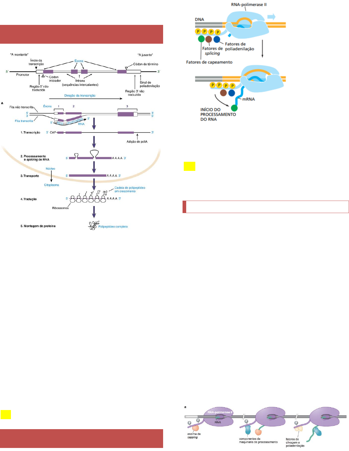 Millena Fernandes l @medmillena Controle pós transcricional Antes de ser exportado para o citoplasma, o RNAm deve passar por várias etapas do processamento do RNA, que incluem o capeamento, splicing (encadeamento) e a poliadenilação. ORGANIZAÇÃO GÊNICA DE EUCARIOTO ◊ Monocistrônica ◊ Os procariotos não passam pelo processamento do RNA, somente os eucariotos. - Permite que o RNA saia do núcleo e vá para o citoplasma. - Enquanto o RNA não sair do núcleo, não é possível produzir proteínas. ◊ Ocorre com a RNA polimerase II. - Na região negativa: PROMOTORA dos genes (reconhecimento da RNA polimerase II) - A região promotora é igual (precisa ser reconhecida pela mesma enzima), apenas a regulatória e codificadora são diferentes. - É essencial que a região promotora esteja perto da codificadora (sempre antes/coladinha). ◊ Fatores de transcrição gerais (ou basais): iguais para todas. ◊ Mesma enzima reconhece diferentes regiões promotoras ◊ Fatores de transcrição específicos: servem para ALGUNS genes. Se ligam na região regulatória através das dobras de DNA. Assim, se juntam no complexo RNA polimerase- fator de transcrição basal e iniciam a transcrição. OBS: geralmente quando se refere a “fatores de transcrição” está se tratando do ESPECÍFICO. ETAPAS DE PROCESSAMENTO DO RNAM Para que ele se torne um RNAm maduro; os processos ocorrem concomitantemente. 3. Poliadenilação da extremidade 3’ do RNA (cauda-poliA) - Adição de nucleotídeos com adeninas na extremidade 3’. Se inicia durante o processo de transcrição. - Transcrito primário = pré RNAm OBS: o capeamento e a poliadenilação ocorrem somente em transcritos de RNA destinados a se tornarem moléculas de RNAm (denominadas mRNAs precursores, ou pré-mRNAs); aumentam a estabilidade do RNAm, facilitando a exportação para o núcleo. Capping – capeamento do RNA ◊ Protege a extremidade 5’ do transcrito de RNA. ◊ Adição de um nucleotídeo guanina contendo um grupo metila (5’). - Dentro do núcleo existe enzimas que degradam RNAses (RNAse – quebram ligações fosfodiéster - remove os primers) NÃO HÁ DNAse no núcleo - Quando o RNAm vai sendo produzido, não faz sentido ir transcrevendo e degradando ao mesmo tempo. - A adição impede que enzimas degradem essa nova molécula de RNAm. Une grupo fosfato com grupo fosfato, gerando uma ligação diferente que não pode ser degrada por RNAse (já que não é uma ligação fosfodiéster) - Polimerases adicionam nucleotídeo na extremidade 3’ (deixa um OH livre) ◊ É adicionado inicialmente para não correr o risco de perder algum nucleotídeo ◊ Também é importante para o reconhecimento do ribossomo para o RNAm e dar início no processo de tradução. 1. CAPPING ou capeamento: adição do CAP na extremidade 5’ do RNA (capa metalizada) 2. Processamento propriamente dito (splicing: retirada dos íntrons) Millena Fernandes l @medmillena Splicing ou retirada dos íntrons ◊ Processamento em si. ◊ Permite que diferentes proteínas sejam produzidas a partir de um mesmo gene. ◊ Remoção dos íntrons e união dos éxons. ◊ Se um transcrito já sofreu splicing e ambas as extremidades 5’ e 3’ foram modificadas, esse RNA é uma molécula funcional que pode então deixar o núcleo e ser traduzida em proteína. ◊ O pré-RNAm precisa ser modificado para formar um RNAm maduro. ◊ É catalisado/feito por um complexo de RNAses e proteínas que receberão o nome de spliceossomo. - Spliceossomo: complexo formado por muitas proteínas e alguns pequenos RNAs funcionais. OBS: é feito por moléculas de RNA, em vez de proteínas (pequenas RNAs nucleares – snRNAs) As sequências especiais são reconhecidas principalmente por pequenas ribonucleoproteínas nucleases (snRNPs), que dirigem a clivagem do RNA nos limites éxon-íntron e catalisam a ligação covalente das sequências dos éxons ◊ Os íntrons são marcados inicialmente por uma sequência específicas (sítio de processamento) EX: gene da beta globina só tem 3 éxons e 2 íntrons (precisam ser retirados); ◊ Importância de trabalhar com pequenas sequências de RNA: grupos de nucleotídeos de fita simples. - Possuem sequências complementares, que realizam o pareamento e sinalizam o local em que os íntrons devem ser removidos. - Extremidade 5’ do íntrons GU, meio adenina, 3’ AG. - Primeiro vem um RNA que reconhece a extremidade 5’, usa energia e ATP e dobra a fita. - Segundo RNA se liga no meio (A). - Vem mais complexo que se liga na região 3’, engloba o íntrons, sofre alterações conformacionais e cliva o início do íntrons (5’) e gruda a extremidade no sítio A (Fazendo uma alça), nesse momento a extremidade 3’ está “livre” – mas presa ao splicessomo. - Com a ajuda de energia, cliva a outra extremidade 3’ e o complexo une os éxons. - Assim, retira-se o íntrons que pode ou não ser degradado. ◊ RNAs são complementares às sequências que estão nos íntrons e éxons (snRNAs, small nuclear RNAs) ◊ As snRNPs desempenham três funções no processamento: - Reconhecem o sítio de processamento 5' e o sítio de ramificação; - Aproximam esses sítios; - Catalisam (ou auxiliam a catálise) a clivagem do RNA e as reações de religação. ◊ Esse tipo de dobra/ligação só ocorre com moléculas de RNA. Pois a ribose do RNA liga o grupo fosfato na hidroxila da ribose. ◊ O que ocorre se não houver a retirada de um íntron: mutação. Sequências erradas da proteína. - Alteração no quadro de lesão tipo corte-junção. - Alteração na sequência de reconhecimento. Poliadenilação ◊ Adição de uma calda na extremidade 3’ do RNAm recentemente transcrito. Após finalizar o RNAm, ele é clivado e a enzima adiciona vários nucleotídeos de adenina. ◊ Funções: ajuda na estabilidade do RNA; impede a formação de um grampo/dobramento do RNA; ajuda o complexo de poro a entender que o RNAm está maduro (importante para sinal