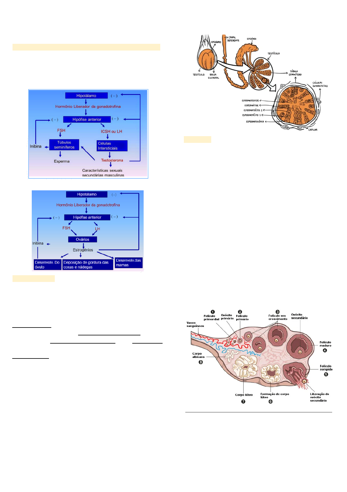UC2 - BIOQUÍMICA SP1 . EIXO HHG MASCULINO E FEMININO Hipotálamo, hipófise e a gônadas (testículos, ovários) - Maculino: - Feminino: Espermatogênese: → Ao nascimento as células germinativas são imaturas, na infância o hipotálamo não secreta grandes quantidades de GnRH (hormônio liberador de gonadotrofina) → Na puberdade a secreção de GnRH aumenta e a mitose das células germinativas é retomada. E depois, se diferenciam em espermatogônias (2n). → O que origina os espermatócitos primários (2n) e posteriormente espermatócitos secundários (n) e espermátides (n), cada um com 23 cromossomos originando o espermatozóide (n) Ovogênese: ▪ Antes do nascimento (3 meses) > ovogônias (2n) ativas sofrem alterações metabólicas que as transformam em ovócitos I ( 2n), no folículo primordial (estacionam até a puberdade). → Puberdade > primeiro ciclo menstrual (menarca). 1. O hormônio GnRH é liberado pelo hipotálamo que influencia a hipófise anterior. 2. Hipófise libera os hormônios FSH e LH que influenciarão o ovário (gônada). 3. FSH estimula o desenvolvimento e crescimento dos folículos ovarianos (folículo primário para folículo maduro/Graaf) e a secreção de estrogênios. 4. LH, juntamente ao FSH, estimula a “ovulação” (liberação do ovócito II n pelo folículo maduro/Graaf) e, depois, promove a formação do corpo lúteo (resultante do folículo de Graaf, fechado após a liberação do ovócito). 5. Se o ovócito II não for fertilizado, o corpo lúteo dura apenas duas semanas, após as quais sua atividade secretora declina e ocorre a degeneração, transformando-se em corpo albicante (corpo lúteo “frustado”). → Caso o ovócito II seja fertilizado, gera o óvulo (n) e sucessivamente o zigoto (2n). ESPERMOGRAMA → É o foco central da avaliação laboratorial para o homem com queixa de infertilidade → Fornece informações sobre a atividade germinativa, a atividade dos epidídimos e a atividade das glândulas sexuais acessórias. Orientações ao paciente para coleta: - Abstinência sexual de 5 dias (pode variar de 2 a 7) - Coleta no laboratório - Higiene das mãos e do penis - Amostra deve ser colhida por masturbação, em frascos limpos, de vidro ou plástico, fornecido pelo laboratório - Não utilizar métodos alternativos para a colheita de amostra (relação interrompida) - Evitar a perda do material, e fechar assim que coletar, para não alcalinizar - Não usar preservativo - É indispensável informar o horario da coleta - O jejum não é obrigatório, a menos que seja solicitado a dosagem de frutose.0 ASPECTOS MACROSCÓPICOS Vitalidade: → O teste rotineiramente empregado para a avaliação da vitalidade espermática utiliza o corante EOSINA. → Espermatozóides vivos apresentam membrana plasmática íntegra e não permitem a passagem da eosina para o interior da célula (espermatozóide não corado). → Espermatozóides mortos, cujas membranas não estão intactas (espermatozóide corado de rosa). → Pelo menos duzentos espermatozóides são avaliados utilizando- se microscopia óptica com objetiva de imersão. Motilidade: É fundamental na fecundação. TIPOS: I – Progressiva - movimento rápido com direção específica. II – Não Progressiva - movimento quase ondulante (lento). III –Imóvel. Etapas: (espermatozóides frescos) 1. Após homogenização do líquido seminal, coloca-se uma gota numa lâmina e cobre-se com lamínula; 2. Levar ao microscópio e focalizar primeiramente com a objetiva de 10x e posteriormente passar para objetivas de 40x. 3. Examinar. Fixar um espermatozóide e observar o seu movimento. Morfologia: → A coloração de Papanicolau é recomendada, mas, podem- se utilizar as colorações de GIEMSA, LEISHMAN, SHORR E PANÓTICO. → A análise da morfologia é realizada preparando-se um esfregaço com 10 μl de sêmen liquefeito (coagulado). → A lâmina de microscopia utilizada para a confecção do esfregaço deve ser previamente limpa com álcool 70%, e, após a fixação e coloração, no mínimo duzentos espermatozóides são contados e classificados como normais e anormais. SP2 . MITOSE X MEIOSE Mitose: ✓ Crescimento, desenvolvimento e reparo; Reprodução assexuada (gera duas células idênticas com o mesmo número de cromossomos); ✓ Ocorre nas células somáticas. ✓ Divisão equacional. ✓ Processo permite a proliferação celular, ou seja, aumento do número de células, que é importante durante o desenvolvimento, o reparo de um tecido lesado, assim como durante toda a vida, em que há perdas naturais de células, com a renovação ocorrendo através da mitose. Meiose: ✓ Reprodução sexuada (células com metade do número de cromossomos); Ocorre em células reprodutivas; ✓ Origina os gametas. ✓ Divisão Reducional (reduz a quantidade de cromossomos) ✓ Ex: 23 cromossomos por gameta – espécie humana. ✓ Embaralhamento dos genes (variabilidade genética); ANOTAÇÕES: ✓ Quando uma menina nasce, as células germinativas dela já são criadas e permanecem em prófase I até a primeira menstruação, em cada menstruação é liberada apenas uma célula. por este motivo que quanto mais idade a mulher resolve engravidar, há mais chances de anomalias, as células envelhecem também. ✓ Quando ocorre algum machucado na pele, por exemplo, ocorre uma inflamação, que é necessária para garantir o reparo. PRÁTICA: ✓ Visualização de leucócitos em amadurecimento celular em lâminas de esfregaço sanguíneo/extensão sanguínea com coloração rápida Panótico ( tipo de corante utilizado em análises laboratoriais com a finalidade de se obter resultados de forma mais rápida) ✓ Visualização realizada em microscópio em objetiva de imersão (necessário uso de óleo de imersão). VISUALIZAÇÃO DE LEUCÓCITOS EM AMADURECIMENTO CELULAR SP3 . GENÉTICA MÉDICA ⛤ Lida com doenças que têm prevalência de 31 a 75 casos em cada 1000 indivíduos. ⛤ Resultado de