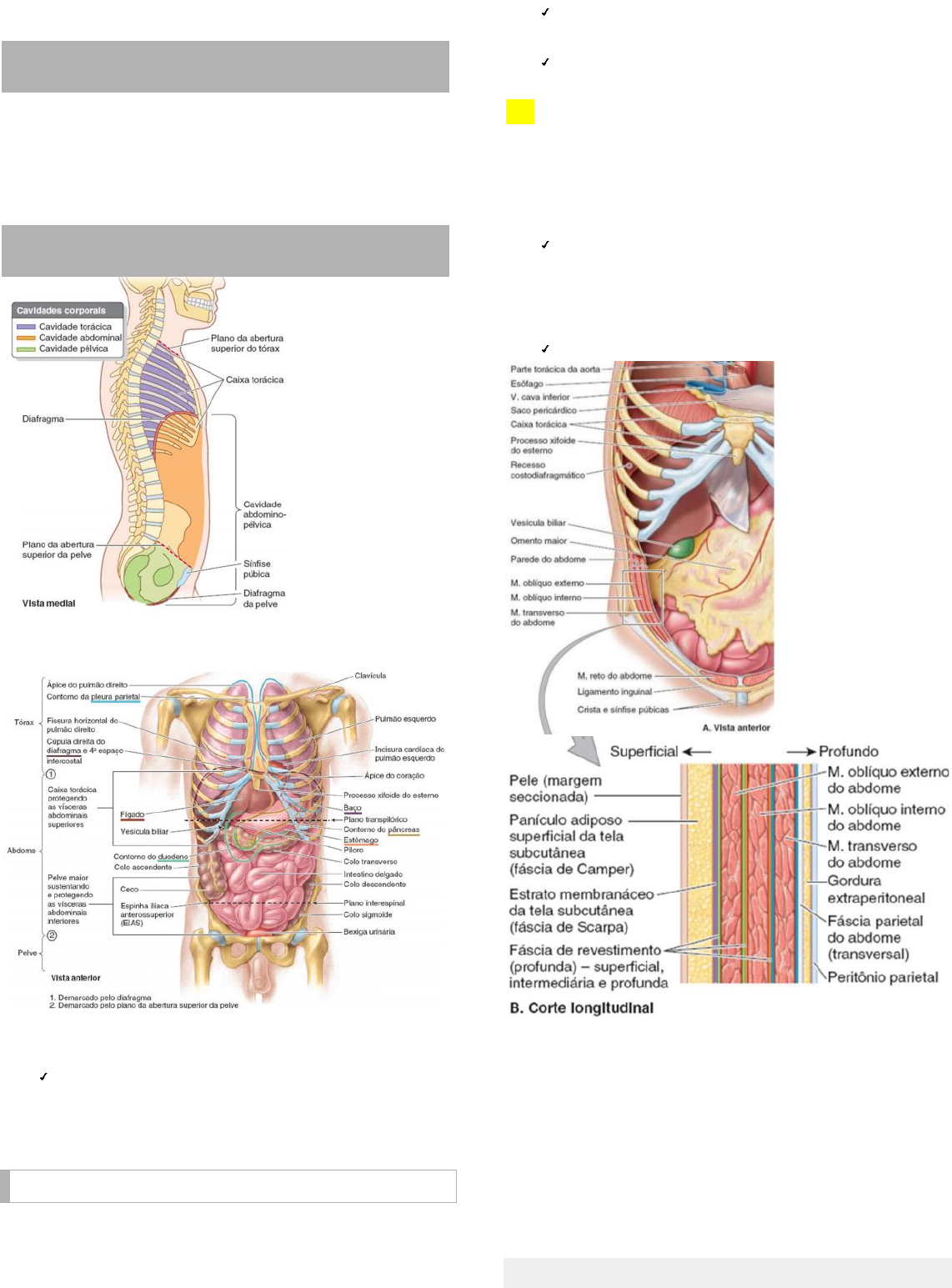 Millena Fernandes l @medmillena Anatomia da parede abdominal e peritônio CASO CLÍNICO Homem de 30 anos, chega ao PS ensanguentado, devido à um ferimento por arma branca na região de quadrante inferior direito após uma briga de bar. De acordo com a localização do ferimento, descreva as camadas que foram atingidas desde a pele até a membrana que reveste o abdome. ABDOME Sistema digestório= se inicia na boca. Trajeto do alimento= boca, faringe, esôfago, estômago e intestinos Porção protegida= fígado (gradil costal), parte do estômago, rins, baço e pâncreas Conteção dos órgãos abdominais - Contenção anterosuperior= paredes musculoaponeuróticas - Contenção superior= diafragma - Contenção inferior= músculos da pelve Paredes do abdome Se contraem para aumentar a pressão intra-abdominal e distendem na ingestão de alimentos, na gravidez, deposição de gordura ou em doenças Peritônio= circunda as vísceras abdominais= estômago, intestino, fígado e baço Estende-se superiormente até o 4º espaço intercostal da caixa torácica OBS= órgãos abdominais mais altos são protegidos pela caixa torácica OBS2= pelve maior sustenta e protege parcialmente as vísceras abdominais inferior (parte do ílio, ceco, apêndice vermiforme e colo sigmoide) Delimitações= - Superiormente= processo xifoide e margens costais - Posteriormente= coluna vertebral - Inferiormente= partes superiores dos ossos da pelve Camadas da parede abdominal: De superficial para profundo, na parede anterolateral do abdome, temos o seguinte: pele, tela subcutânea (camada adiposa + camada membranácea), plano músculo-aponeurótico (oblíquo externo, oblíquo interno e transverso, anterolateralmente, e reto do abdome medialmente, e suas respectivas aponeuroses), fáscia transversal (reveste o m.transverso do abdome internamente), tecido extraperitoneal (tecido conjuntivo frouxo com células adiposas) e peritônio parietal (membrana serosa). Pele - Está entre a cavidade torácica e a cavidade pélvica - Abriga uma grande quantidade de órgãos do sistema digestório e parte dos sistemas genital e urinário - É dinâmico e flexivel 1. Pele (epiderme e derme) 2. Tela subcutânea - Fáscia de Camper 3. Tela subcutânea - Fáscia de Scarpa (extrato membranáceo) 4. Músculos 5. Fáscia de revestimento 6. Gordura extra peritoneal 7. Peritônio parietal (membrana) Millena Fernandes l @medmillena Ligamento inguinal= marca a transição da cavidade abdominal para os membros inferiores Parede anterolateral do abdome Parede anterior, lateral direita e esquerda e posterior É musculoaponeurótica, exceto a parede posterior O limite entre a parede anterior e as paredes laterais é indefinido, portanto, usa-se o termo “parede anterolateral do abdome” É formada por pele e tela subcutânea, composta por gordura, músculos, suas aponeuroses e fáscia muscular, gordura extraperitoneal e peritônio parietal Anatomia de superfície Pode ser dividido em 4 quadrantes ou 9 regiões Pontos de superfície= McBurney/Blumberg É um ponto na junção da linha dois terços medial e um terço lateral que se estende do umbigo até a espinha ilíaca anterossuperior (linha espinoumbilical). A base do apêndice vermiforme encontra-se profundamente neste ponto. Facilita o diagnóstico de apendicite Apêndice= parte do intestino grosso Sinal de rovsing= dor no quadrante inferior Tela subcutânea Camada de tecido conjuntivo adiposo. Abaixo do umbigo ela forma duas camadas: Uma camada superficial de tecido adiposo do abdome (fáscia de Camper) Uma camada membranosa mais profunda - estrato membranáceo (fáscia de Scarpa) O estrato membranáceo continua inferiormente para a região perineal como o estrato membranáceo do períneo (fáscia de Colles) - A camada superficial de tecido adiposo da fáscia superficial varia em espessura. - Camada membranosa profunda da fáscia superficial; - Fina e membranosa e contém pouca ou nenhuma gordura. - No plano sagital mediano, ela é firmemente aderida à linha alba e à sínfise púbica MÚSCULOS Linha alba: processo xifoide até a sínfise púbica Intersecções tendíneas: entre os ventres musculares Linha semilunar (Spiegel): formato de semilua, delimita o M. Reto do abdome. Aparecimento das aponeuroses dos músculos Millena Fernandes l @medmillena Há uma divisão Músculos da parede anterolateral do abdome Há cinco (pares bilaterais)= três planos e dois verticais Planos= oblíquo externo, oblíquo interno e transverso do abdome - Fibras musculares possuem orientações diferentes (começam póstero lateralmente) - Continuam anterior e medialmente como aponeuroses fortes, semelhantes a lâminas - Formação da BAINHA DO MÚSCULO RETO DO ABDOME= tendínea, aponeurótica e resistente. Envolve o músculo reto do abdome Verticais= músculo reto do abdome e músculo piramidal - Contidos na bainha do músculo reto do abdome - Próximos à linha mediana anterior, envolvidos por uma bainha tendínea formada pelas aponeuroses dos músculos planos Oblíquo externo= fibras no sentido de mão no bolso Oblíquo interno= fibras no sentido de mão na bunda Músculo oblíquo externo do abdome Sua aponeurose forma a face externa da baixa dos músculos retos do abdome Maior e mais superficial Músculo oblíquo interno do abdome Há a formação de uma musculatura que vai para a região das gônodas (cremaster) Músculo transverso do abdome O mais interno Orientação circunferencial e transversal ideal para comprimir o conteúdo abdominal e aumentar a pressão Músculo reto do abdome Origem= costela V a XII Inserção= linha alba, tubérculo púbico e metade anterior da crista ilíaca Inervação= nervos toracoabdominais e nervo subcostal Ação= comprime e sustenta as vísceras abdominais, flexiona e roda o tronco Origem= fáscia toracolombar Inserção= margens inferiores das costela X e VII, linha alba e linha pectínea do púbis Inervação= nervos toracoabdominais e primeiro nervo lombar Ação= co