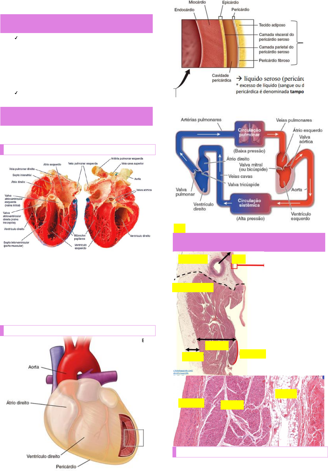 Millena Fernandes l @medmillena Histologia do coração Componentes do sistema circulatório Sistema cardiovascular: coração, artérias, veias e capilares (sangue). Coração: bomba, permite que ocorra o fluxo unidirecional de sangue e nutrientes. Artérias, veias e capilares: vias de transporte para o sangue percorrer. Sistema vascular linfático: vasos linfáticos (linfa). Tem função imunológica. Coração Formado na 3ª semana de gestação -> necessário para a distribuição de sangue. Características gerais Parte posterior do coração: esquerda; parte anterior à direita. - Esqueleto fibroso: entre os átrios e recobrindo as valvas. - Valvas: inserida no esqueleto fibroso. - Sistema de condução elétrica: formado por células musculares cardíacas modificadoras (fibras de Purkinje). Todo órgão oco (com cavidade no interior) ou víscera, no seu interior vai ter um tecido epitelial. Parede dos átrios e ventrículos LADO DIREITO: realiza a circulação pulmonar. LADO ESQUERDO: circulação sistêmica. OBS: coração está aderido ao epicárdio. CAMADAS Epicárdio Endocárdio Miocárdio Epicárdio Pericárdio ACD* - Epicárdio: camada externa, correspondendo a camada visceral do pericárdio seroso. - Miocárdio: camada intermediária. - Endocárdio: camada interna. *ACD: artéria coronária direita Átrio direito Ventrículo direito Epicárdio Miocárdio Endocárdio Millena Fernandes l @medmillena Também conhecido como camada visceral do pericárdio seroso. Adere à superfície externa do coração. Está voltado para a parede dos grandes vasos que entram e saem do coração. Composta por: tecido epitelial (mesotélio, mais externamente), tecido conjuntivo frouxo e tecido adiposo. Presença de vasos sanguíneos e nervos circundados por tecido adiposo. OBS: não é toda a parte que tem tecido adiposo associado. Miocárdio Músculo estriado cardíaco. Camada intermediária. Principal componente do coração. Presença de vasos sanguíneos. Maior parte do tecido cardíaco; mais espessa (principalmente nos ventrículos). Coronária direita: leva sangue até o miocárdio. Está na região do epicárdio. Células musculares arranjadas de modo variado. Presença de tecido adiposo (faz parte do conjuntivo). Composto por três tecidos: - Epitelial: mesotélio. Diferença de endotélio para mesotélio (tecido epitelial simples pavimentoso). Presença das coronárias. Cardiomiócitos: possui no máximo 2 núcleos. Células responsáveis pela contração cardíaca; Compõe o tecido muscular estriado cardíaco. OBS: no corte transversal o núcleo fica mais redondinho e no longitudinal mais oval. - Cardiomiócitos contráteis: contraem para bombear sangue; maior quantidade, são contráteis e com muitas mitocôndrias. - Cardiomiócitos mioendócrino: sintetizam hormônio. - Cardiomiócitos nodais: controlam a contração rítmica do coração; menores que as células musculares cardíacas atriais. Menos quantidade de miofibrilas. - Fibras de Punkinje: propagam a contração rítmica do coração. Presença do endomísio: camada de tecido conjuntivo revestindo o cardiomiócito. Discos intercalares: permite aumentar a comunicação celular na contração (propagação do estímulo elétrico). - Zônula de adesão - Desmossomos - Junções comunicantes. Observado em corte transversal. Endocárdio Corte transversal Corte longitudinal Adiposo JC: propaga o estímulo elétrico. Canais que se abrem para que as células de comuniquem, permitindo um estímulo homogêneo. Conjuntivo frouxo Epitélio Simples pavimentoso Epicárdio Conj. frouxo Epitélio Simples pavimentoso Millena Fernandes l @medmillena 1. Primeira camada de células: tecido epitelial simples pavimentoso. 2. Camada subendotelial: tecido conjuntivo frouxo (contendo fibras colágenas, fibras elásticas e células musculares lisas isoladas). Colágeno faz um “miojinho”, região densa não modelada. - Subendocárdio: continuação do conjuntivo, contém vasos, nervos, fibras de Purkinje. OBS: fibras de Purkinje pode estar ausente em algumas regiões (estão só no ventrículo). DIFERANÇAS DE ESPESSURA Espessura varia de uma camada para a outra. Ventrículos: maior espessura (miocárdio mais espesso, sendo que o esquerdo é mais ainda). Lado esquerdo mais espesso. Endotélio: dentro da luz do vaso sanguíneo. Sangue chega primeiro no epicárdio, vai para o miocárdio e depois ao endocárdio. Parte mais próxima do endocárdio que sofre os efeitos do infarto agudo do miocárdio. Sistema gerador e condutor do impulso do coração Sistema presente no miocárdio responsável por gerar um estímulo cardíaco. É constituído pelo nó sinoatrial, nó atrioventricular e feixe atrioventricular. Nós: marcapasso “natural” Feixe atrioventricular: se origina do nodo e se ramifica para ambos os ventrículos. Células conectadas por junções do tipo comunicantes. Nó sinoatrial Células musculares cardíacas especializadas, fusiformes, menores que as células musculares do átrio, e apresente menor quantidade de miofibrilas. Região da veia cava. Partem alguns ramos, que são cardiomiocítos especializados na propagação. Nó atrioventricular Semelhante ao sinoatrial. Possui células ramificadas que emitem projeções citoplasmáticas em várias direções, formando uma rede. Feixe de células especializadas: entre o AD e VD. Feixe atrioventricular São cardiomiocítos especializados na condução do estímulo elétrico. Ramos subendocárdicos (fibras de Purkinje) estão localizados nos ventrículos, tornando possível que o estímulo penetre as camadas mais internas do ventrículo. Esqueleto fibroso ou cardíaco Estrutura constituída por tecido conjuntivo denso não modelado. Estão em volta das valvas cardíacas e trígonos (4 anéis fibrosos). Função: dá sustentação (estrutura) para as válvulas, dando resistência para o “abre e fecha”; funciona como isolante elétrico, permitindo que ele tenha um sentido (direciona os imp