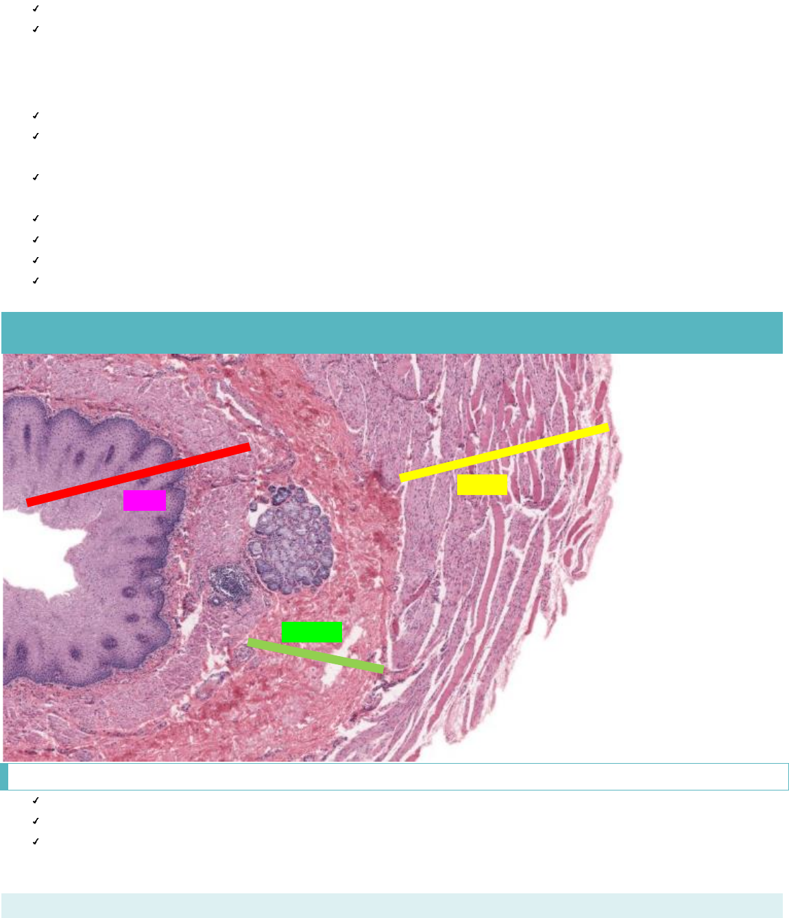 Millena Fernandes l @medmillena Histologia do trato gastro intestinal A camada mucosa é a principal camada que irá proporcionar a função do segmento. O epitélio da mucosa pode apresentar variações regionais, sendo dos tipos: Protetor: estratificado pavimentoso não queratinizado (exemplo: esôfago). Secretor: epitélio simples colunar com células unidas por zônulas de oclusão (estômago). Absortivo: epitélio simples colunar com células unidas por zônulas de oclusão (intestino). Serosa: constituída de tecido conjuntivo frouxo com mesotélio externamente. Adventícia: apenas tecido conjuntivo frouxo, sem o mesotélio. Presente na porção torácica do esôfago, no duodeno, nos cólons ascendente e descendente, no reto e no canal anal. Submucosa= constituída de tecido conjuntivo denso não modelado com fibras colágenas, fibroblastos, vasos sanguíneos e vasos linfáticos. É onde o plexo submucoso (Plexo de Meissner) está localizado. No esôfago e no duodeno pode apresentar glândulas. As fibras do sistema nervoso autônomo simpático e parassimpático formam o componente extrínseco de inervação do TGI. Os plexos Submucoso e Mioentérico estão conectados ao SNA formando o componente intrínseco ou entérico. A inervação do sistema digestório visa também regular e controlar a atividade secretora das glândulas da mucosa e da submucosa. As células intersticiais de Cajal estão localizadas conectando os plexos e os músculos lisos do TGI. Elas participam da motil idade do TGI ao originarem as ondas lentas, potenciais graduados que irão gerar potenciais de ação para contração muscular. ESÔFAGO Camada mucosa Virada para a luz do órgão Tecido básico: epitelial (revestindo internamente) A camada mucosa do esôfago apresenta epitélio estratificado pavimentoso não queratinizado. Entretanto, a única porção da mucosa que apresenta glândulas é a porção próxima ao estômago. Na lâmina própria da mucosa próxima ao estômago, encontramos as glândulas cárdicas do esôfago. Epitélio estratificado pavimentoso não queratinizado e lâmina própria Mucosa Submucosa Muscular Possui 4 camadas: - Mucosa - Submucosa - Muscular - Adventícia/serosa Serosa: tecido conjuntivo e tecido epitelial Adventícia: tecido conjuntivo Millena Fernandes l @medmillena Lâmina própria: Tecido conjuntivo frouxo (abaixo do verde) Presença de células de defesa (núcleo mais esférico) Presença de vasos Músculo liso Camada fina de músculo da mucosa Corte transversal com as fibras no sentido esférico Presença de tecido conjuntivo envolvendo cada fibra muscular para permitir a irrigação/vascularização/inervação dessas células Submucosa Tecido conjuntivo denso fibroelástico + glândulas esofágicas mucosas, produtoras de muco (verde) (azul: ducto) Ducto para conduzir muco até a cavidade do órgão Adipócitos isolados concentrados nessa camada (junto com tecido conjuntivo) Encontramos tecido conjuntivo denso não modelado com fibras elásticas e colágenas, além de glândulas tubuloacinosas com células mucosas e serosas. Epitélio estratificado pavimentoso não queratinizado (mais externo) Millena Fernandes l @medmillena Tecido linfoide (GALT) Presença de células de defesa associado à submucosa, formando tecido linfático (GALT) Túnica muscular Porção cervical: músculo estriado esquelético Porção torácica: músculo estriado esquelético e liso; túnica adventícia; região de transição Porção abdominal: músculo liso Tecido conjuntivo denso não modelado Millena Fernandes l @medmillena Túnica adventícia Une o esôfago às estruturas adjacentes Não há nenhuma membrana serosa revestindo o esôfago; membrana serosa que reveste o órgão Membrana serosa: revestimento externo de órgãos internos/cavitários (estômago, coração, pulmão). Possui uma divisão em lâmina visceral e parietal. Entre as lâminas há uma cavidade preenchida por líquido. Constituição histológica por tecido conjuntivo frouxo e epitélio simples pavimentoso (MESOTÉLIO) Parte abdominal: túnica serosa. ESTÔMAGO Mucosa é diferente; considerando órgãos diferentes Esquerda: epitélio simples colunar Direita: epitélio estratificado pavimentoso Área de junção esofágico gástrica Estômago finaliza na região do piloro, uma região que forma uma esfíncter e possui um sentido circular Pregas gástricas que permitem a distensão do estômago: invaginações representam as criptas gástricas/rugas/fossetas/fovéolas gástricas (as pregas ou rugas gástricas são formadas por dobras longitudinais da mucosa e da submucosa) - Formação das glândulas gástricas nas fossetas. Invaginação da mucosa para uma camada mais profunda, formando a fovéola e glândulas gástricas. Formato meio tubular - Cárdia: tanto a fosseta quanto a glândula possuem tamanhos semelhantes - Fundo gástrico: tamanhos de fossetas menores em relação ao tamanho de glândulas gástricas (SERÃO MAIORES) Corpos celulares de neurônios Plexo nervoso submucosa: inerva a camada muscular da túnica mucosa e as glândulas presentes; inerva e controla os movimentos peristálticos Túnica muscular depende do trecho do esôfago e em relação a quantidade de camadas em outros órgãos Millena Fernandes l @medmillena - Refluxo devido à ausência de uma musculatura no sentido circular - Região pilórica (final do estômago): tamanho de fossetas maiores em relação ao tamanho das glândulas - Na junção gastroesofágica, o epitélio esofágico é substituído abruptamente pelo epitélio simples colunar da mucosa gástrica Células tronco, mucosas, parietais, principal e enteroendócrina Células fonte: células tronco responsáveis pela renovação do epitélio estomacal. Divisão histológica o corpo e o fundo contam como uma só parte. Assim há apenas 3: cárdia; corpo e fundo; piloro. Mucosa: tecido epitelial modifica do esôfago para os demais órgãos - Presença de células mucosas para produzirem m