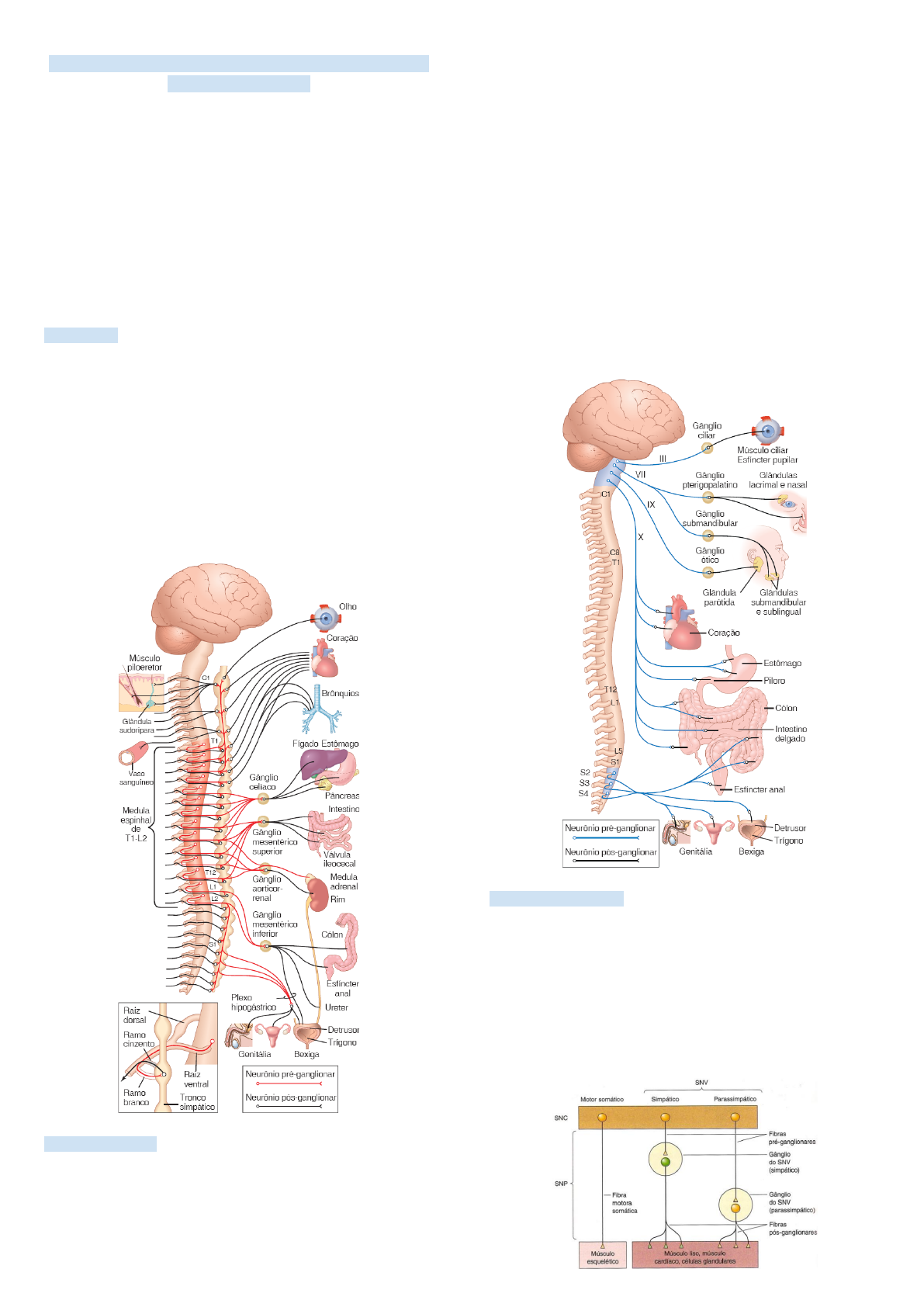 SISTEMA NERVOSO AUTÔNOMO SIMPÁTICO E PARASSIMPÁTICO O sistema nervoso autônomo é a parte do sistema nervoso que regula a maioria das funções viscerais do corpo. Ele ajuda a controlar a pressão arterial, a motilidade gastrointestinal, a secreção gastrointestinal, o esvaziamento da bexiga urinária, a sudorese, a temperatura corporal e muitas outras atividades. O sistema nervoso simpático é catabólico e ativa as respostas de luta ou fuga. O sistema nervoso parassimpático é anabólico; ele conserva e restaura Simpático Os corpos celulares pré-ganglionares do sistema simpático estão localizados nas porções torácica e lombar da medula espinhal T1 e L2 ou L3. Inervação simpática Fibras longas vão desses gânglios aos órgãos efetores, como: - Músculo liso dos vasos sanguíneos, vísceras, pulmões, couro cabeludo (músculos piloeretores) e pupilas - Coração - Glândulas (sudoríparas, salivares e digestivas) Parassimpático Os corpos celulares pré-ganglionares do sistema parassimpático estão localizados no tronco encefálico e na parte sacral da medula espinal. Fibras pré-ganglionares emergem do tronco encefálico com o III, VII, IX e X pares cranianos (vago) e emergem da medula espinal em S2 e S3; o nervo vago (X) contém aproximadamente 75% de todas as fibras parassimpáticas. Inervação parassimpática Os gânglios parassimpáticos (p. ex., ciliares, esplenopalatinos, ópticos, pélvicos e vagais) estão localizados no interior dos órgãos efetores e as fibras pós-ganglionares possuem somente 1 a 2 mm de comprimento. Assim, o sistema parassimpático pode produzir respostas específicas e localizadas nos órgãos efetores, como a seguir: - Os vasos sanguíneos da cabeça, pescoço e vísceras toracoabdominais - Glândulas lacrimais e salivares - O músculo liso das glândulas e vísceras (p. ex., fígado, baço, cólon, rins, bexiga, órgãos genitais) - Músculos da pupila Corpos neuronais: Os sistemas simpático e parassimpático consistem, cada um, em 2 conjuntos de corpos neuronais: - Pré-ganglionar: esse conjunto está situado no sistema nervoso central e tem conexões com o outro conjunto situado nos gânglios fora do sistema nervoso central. - Pós-ganglionar: esse conjunto tem fibras eferentes que vão dos gânglios aos órgãos efetores Fibras colinérgicas e adrenérgicas As fibras nervosas simpáticas e parassimpáticas secretam principalmente uma ou outra das duas substâncias transmissoras sinápticas: acetilcolina ou noradrenalina. As fibras que secretam acetilcolina são consideradas colinérgicas. Aquelas que secretam noradrenalina são as adrenérgicas, um termo derivado da adrenalina. Figura: Os axônios pré-ganglionares simpáticos e parassimpáticos são levemente mielinizados, ou seja, são recobertos por uma bainha de mielina, que é uma substância “gordurosa” que isola a membrana celular do neurônio, e usam acetilcolina (Ach) como neurotransmissor. Os axônios pós-ganglionares são amielínicos, ou seja, são axônios de pequeno diâmetro que são envolvidos somente por uma única dobra de mielina. A maioria dos axônios pós-ganglionares simpáticos armazena noradrenalina (NA) em suas varicosidades e libera esse neurotransmissor sobre a superfície do tecido-alvo. Os axônios parassimpáticos pós-ganglionares armazenam Ach nas varicosidades e liberam Ach na superfície do tecido-alvo. RECEPTORES NOS ÓRGÃOS EFERENTES A acetilcolina, a noradrenalina ou a adrenalina secretadas em uma terminação nervosa autônoma, antes de poderem estimular um órgão efetor, devem primeiro se ligar a receptores específicos nas células efetoras. O receptor fica do lado de fora da membrana celular, ligado como um grupo protético a uma molécula de proteína que penetra integralmente a membrana celular. A ligação da substância transmissora com o receptor provoca mudança conformacional na estrutura da molécula de proteína. Por sua vez, a molécula de proteína alterada excita ou inibe a célula, causando, na maioria das vezes 1 ou 2: 1. alteração na permeabilidade da membrana celular a um ou mais íons; 2. ativação ou inativação de uma enzima ligada à outra extremidade da proteína receptora, onde se projeta para o interior da célula. Receptores Adrenérgicos: Existem duas classes principais de receptores adrenérgicos: os receptores alfa e receptores beta. Existem dois tipos principais de receptores alfa (alfa1 e alfa2), que estão ligados a diferentes proteínas G. Os receptores beta são divididos em receptores beta1, beta2 e beta3 porque certas substâncias químicas afetam apenas alguns receptores beta. Os receptores beta também usam proteínas G para a sinalização. A noradrenalina e a adrenalina, ambas secretadas no sangue pela medula adrenal, têm efeitos ligeiramente diferentes na excitação dos receptores alfa e beta. A noradrenalina excita sobretudo os receptores alfa, mas também os receptores beta em menor grau. Tabela: Lista a distribuição dos receptores alfa e beta em alguns dos órgãos e sistemas controlados pelos nervos simpáticos. Observe que certas ações alfa são excitatórias, enquanto outras são inibitórias. Da mesma maneira, certas ações beta são excitatórias, e outras, inibitórias. Assim, os receptores alfa e beta estão necessariamente associados à afinidade do hormônio pelos receptores em determinado órgão efetor. Receptores Colinérgicos A acetilcolina ativa principalmente dois tipos de receptores, chamados de receptores muscarínicos e nicotínicos. A razão desses nomes é que a muscarina, um veneno presente em alguns cogumelos, ativa apenas os receptores muscarínicos, enquanto a nicotina ativa somente os receptores nicotínicos. A acetilcolina ativa os dois. Os receptores muscarínicos, que usam proteínas G como mecanismo de sinalização, são encontrados em todas as células efetoras estimuladas pelos neurônios colinérgicos pós-ganglionares do sistema nervoso parassimp