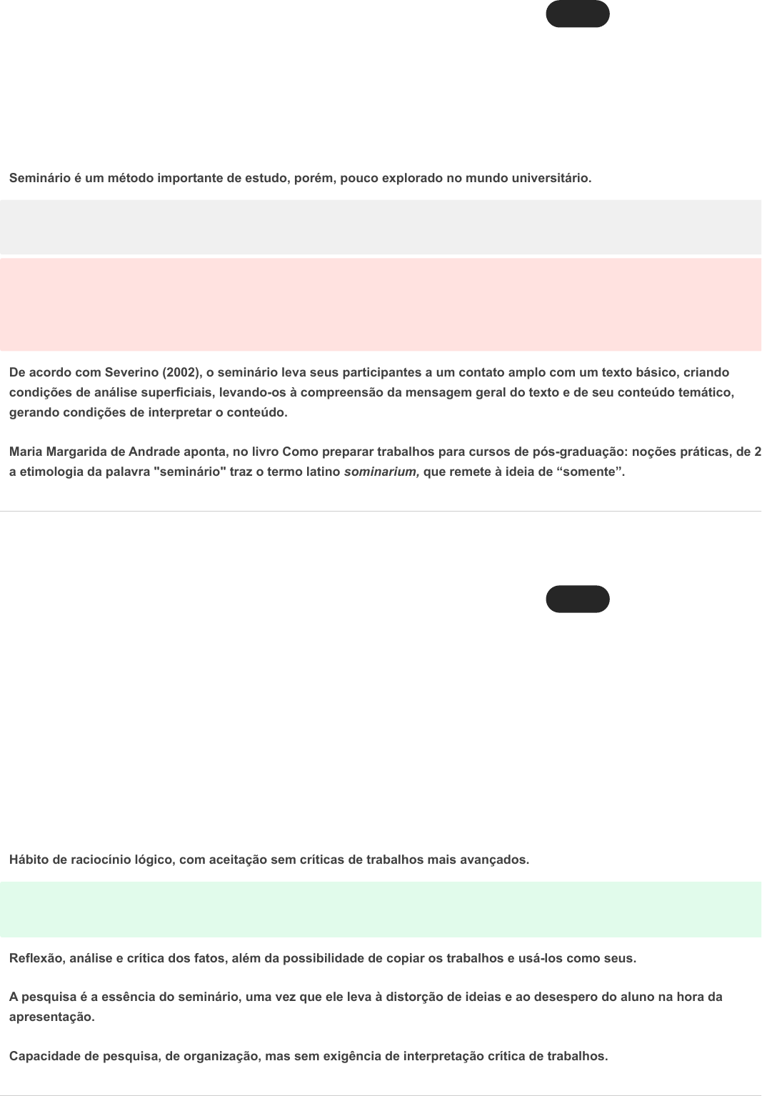 Ocultar opções de resposta Ocultar opções de resposta Pergunta 1 0 / 1 O professor Jonas afirmou o seguinte sobre seminários: “quem participa de um seminário espera que aquele que o expõe esteja quali e preparado não somente para expor suas ideias, mas para desfazer dúvidas posteriores e debater seus argumentos com outras pes Sobre os seminários, assinale a alternativa correta. Seminário é um método importante de estudo, porém, pouco explorado no mundo universitário. Resposta co É preciso ter em mente que a busca por reflexões mais profundas sobre uma determinada questão ou um problema é o alvo de um seminário científico. Incorreta: A pesquisa é a essência do seminário, uma vez que ele leva à discussão e ao debate. Para isso, é necessário que as habilidades que permitem a organização das ideias, a análise, a interpretação e a crítica sejam desenvolvidas, contribuindo apenas para a formação do apresentador. De acordo com Severino (2002), o seminário leva seus participantes a um contato amplo com um texto básico, criando condições de análise superficiais, levando-os à compreensão da mensagem geral do texto e de seu conteúdo temático, gerando condições de interpretar o conteúdo. Maria Margarida de Andrade aponta, no livro Como preparar trabalhos para cursos de pós-graduação: noções práticas, de 2 a etimologia da palavra "seminário" traz o termo latino sominarium, que remete à ideia de “somente”. Pergunta 2 1 / 1 O seminário acadêmico permite que o aluno tenha uma nova visão sobre determinado tema de seu interesse, identificando oportunidades e discutindo outras formas para solucionar um problema. Os encontros acadêmicos por meio dos seminários permitem, universitário, conhecer diversas pessoas que se interessam pelos mesmos temas que você tem afinidade ou quer saber mais a res Por isso, é essencial aproveitar a ocasião para se conectar com mais pessoas. Com base nisso, assinale a alternativa correta seminários. Hábito de raciocínio lógico, com aceitação sem críticas de trabalhos mais avançados. Resposta co Os seminários proporcionam capacidade de pesquisa e de organização, reflexão e análise sistemática de fatos. Reflexão, análise e crítica dos fatos, além da possibilidade de copiar os trabalhos e usá-los como seus. A pesquisa é a essência do seminário, uma vez que ele leva à distorção de ideias e ao desespero do aluno na hora da apresentação. Capacidade de pesquisa, de organização, mas sem exigência de interpretação crítica de trabalhos. Ocultar opções de resposta Ocultar opções de resposta Pergunta 3 1 / 1 (ADAPTADA – FGV – 2015) Para diversos autores, as referencias segundo a ABNT NBR 6023, 2002, são um conjunto de elem descritivos retirados de um documento que permite a sua identificação. Na ordenação de uma lista de referências, de acordo com com normativa: Resposta co a sequência deve ser alfabética, pela primeira palavra do sobrenome do autor ou pela primeira palavra relevante do título, se não houver autor; e, para entradas iguais, a sequência deve ser cronológica, pela data de publicação. o nome do autor de várias obras referenciadas sucessivamente pode ser substituído, nas referências seguintes à primei desde que estejam na mesma folha, por um traço sublinear, equivalente a seis espaços, seguido de ponto. o título de várias edições de um mesmo documento pode ser substituído por um traço sublinear nas referências seguint primeira, desde que estejam referidas em folhas sucessivas. a entrada para documentos de até três autores é indicada pelo último sobrenome de cada um, seguido dos prenomes; send primeiro e o segundo separados entre si por vírgula, e o último é precedido pelo sinal &. as entradas pelo sobrenome do autor ou pelo título, em toda a sua extensão, devem ser em letras maiúsculas, alinhada esquerda, de forma a facilitar a identificação de cada documento. Pergunta 4 0 / 1 (ADAPTADA – ESPCEX – 2020) “A pandemia de coronavírus agora apresenta um desafio extra: há muito mais artigos do que alguém jamais poderá ler. (...) Artigos com esses serão citados por gerações de cientistas que ainda nem nasceram. No entanto, a maioria dos artigos não será citada. Quando você lê um artigo científico, é importante manter um ceticismo saudável. (.. Muitos nunca vão fazer parte de um periódico acadêmico. (...) Mas alguns deles estão ganhando manchetes sensacionalistas antes de queimar na obscuridade.” (O Estado de S. Paulo, 8/6/2020, Especia O texto informativo acima, que apresenta ao público certos cuidados na leitura e compreensão de artigos científicos, contém conectivos, propositadamente destacados. Pode-se afirmar que: “quando” expressa ação condicionadora da oração principal subsequente. Ocultar opções de resposta “que” introduz ressalva sobre a quantidade crescente de artigos científicos. Incorreta: “mas” inicia contraposição com o período imediatamente anterior, a fim de explicar a diferença “muitos/alguns”. “no entanto” aponta concessão e constitui contrariedade com o parágrafo anterior. Resposta co“antes de” posiciona a oração seguinte como fato posterior com relação à oração principal precedente. Pergunta 5 0 / 1 Observe a imagem a seguir. Fonte: https://producaoacademicaonline.wordpress.com Sobre o plágio acadêmico, julgue os itens a seguir: I - O plágio acontece com a utilização de produções de outras pessoas em qualquer tipo de trabalho, sem citar o nome dos autores. II - O plágio acadêmico é classificado em integral, parcial, conceitual e autoplágio. III - Ao contrário do que muita gente pensa, não é errado utilizar a ideia de um outro autor em sua própria obra. Na verdade, as pesq científicas se baseiam em um compilado de ideias de outros autores somados aos seus pensamentos. IV - No entanto, um cuidado que todo pesquisador deve ter, princ