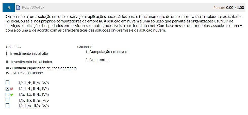 Associe a coluna A com a coluna B de acordo com as características das soluções on-premise e da solução nuvem. I - Investimento inicial alto II - Investimento inicial baixo III - Limitada capacidade de escalonamento IV - Alta escalabilidade a. II/b. III/b. IV/a b. I/a. II/b. III/a, IV/b c. III/a. IV/b. III/b. IV/b