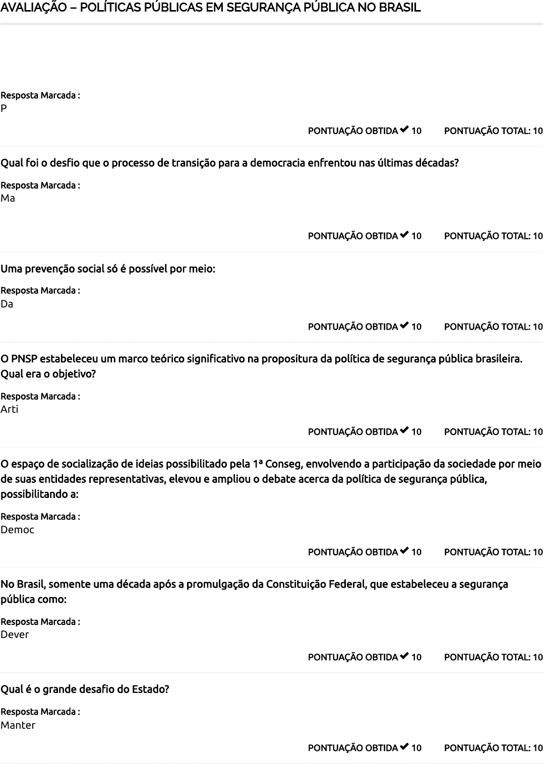 AVALIAÇÃO – POLÍTICAS PÚBLICAS EM SEGURANÇA PÚBLICA NO BRASIL AS QUESTÕES RELACIONADAS À SEGURANÇA PÚBLICA NÃO PODEM SER TRATADAS COMO POLÍTICA LIMITADA DE GOVERNO, MAS COMO UM PROCESSO AMPLO E COMPLEXO A SER ENFRENTADO TANTO: PONTUAÇÃO TOTAL: 10PONTUAÇÃO OBTIDA  10 Resposta Marcada : Pelo Estado quanto pela sociedade. PONTUAÇÃO TOTAL: 10PONTUAÇÃO OBTIDA  10 Qual foi o des�o que o processo de transição para a democracia enfrentou nas últimas décadas? Resposta Marcada : Manter a ordem pública em um contexto afetado pela insegurança urbana e a necessidade de mudança de atuação dos órgãos de segurança pública. PONTUAÇÃO TOTAL: 10PONTUAÇÃO OBTIDA  10 Uma prevenção social só é possível por meio: Resposta Marcada : Da participação comunitária. PONTUAÇÃO TOTAL: 10PONTUAÇÃO OBTIDA  10 O PNSP estabeleceu um marco teórico signi�cativo na propositura da política de segurança pública brasileira. Qual era o objetivo? Resposta Marcada : Articular ações de repressão e prevenção à criminalidade no país. PONTUAÇÃO TOTAL: 10PONTUAÇÃO OBTIDA  10 O espaço de socialização de ideias possibilitado pela 1ª Conseg, envolvendo a participação da sociedade por meio de suas entidades representativas, elevou e ampliou o debate acerca da política de segurança pública, possibilitando a: Resposta Marcada : Democratização da política. PONTUAÇÃO TOTAL: 10PONTUAÇÃO OBTIDA  10 No Brasil, somente uma década após a promulgação da Constituição Federal, que estabeleceu a segurança pública como: Resposta Marcada : Dever do Estado e responsabilidade de todos. PONTUAÇÃO TOTAL: 10PONTUAÇÃO OBTIDA  10 Qual é o grande desa�o do Estado? Resposta Marcada : Manter este estado antidelitual na sociedade por meio dos órgãos que compõe a segurança pública. 100 / 100 PONTUAÇÃO TOTAL: 10PONTUAÇÃO OBTIDA  10 Pronasci representa uma iniciativa inovadora no trato com a questão da segurança pública, do enfrentamento da violência e da criminalidade, já que busca desenvolver ações na área de segurança integrada com ações sociais, incluindo, acertadamente, o sistema prisional. Pronasci apresenta-se como uma política de segurança pública, baseada em princípios. Marque a alternativa que NÃO corresponde a um desses princípios. Resposta Marcada : Princípios judiciários. PONTUAÇÃO TOTAL: 10PONTUAÇÃO OBTIDA  10 Nas políticas sociais, a complexidade da política de segurança pública envolve diversas instâncias governamentais e os três poderes da república. Marque a alternativa que não corresponde a um desses poderes. Resposta Marcada : Poder Político. PONTUAÇÃO TOTAL: 10PONTUAÇÃO OBTIDA  10 Segurança e prevenção transcendem o papel do Estado em geral e o da Polícia Militar em particular, haja vista que segurança é questão de: Resposta Marcada : Inteligência e prevenção. Total