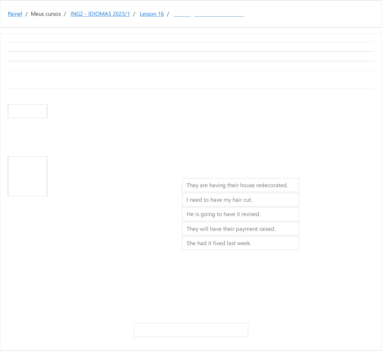 Painel / Meus cursos / ING2 - IDIOMAS 2023/1 / Lesson 16 / Relating causative sentences Informação Questão 1 Correto Atingiu 10,00 de 10,00 Iniciado em quarta, 21 jun 2023, 08:28 Estado Finalizada Concluída em quarta, 21 jun 2023, 08:29 Tempo empregado 1 minuto 2 segundos Avaliar 10,00 de um máximo de 10,00(100%) Match the ending to the beginning of the sentences according to what you studied about causative forms. My parents bought some vases and cushions. My hair is too long. He finished writing his thesis. They asked for a pay raise. Her television was broken. They are having their house redecorated. I need to have my hair cut. He is going to have it revised. They will have their payment raised. She had it fixed last week. Sua resposta está correta. A resposta correta é: My parents bought some vases and cushions. → They are having their house redecorated., My hair is too long. → I need to have my hair cut., He finished writing his thesis. → He is going to have it revised., They asked for a pay raise. → They will have their payment raised., Her television was broken. → She had it fixed last week.. ◄ Filled by object pronouns Seguir para... What do they mean? ► https://moodle.ifsul.edu.br/novohamburgo/my/ https://moodle.ifsul.edu.br/novohamburgo/course/view.php?id=337 https://moodle.ifsul.edu.br/novohamburgo/course/view.php?id=337#section-25 https://moodle.ifsul.edu.br/novohamburgo/mod/quiz/view.php?id=53802 https://moodle.ifsul.edu.br/novohamburgo/mod/quiz/view.php?id=53801&forceview=1 https://moodle.ifsul.edu.br/novohamburgo/mod/quiz/view.php?id=53803&forceview=1