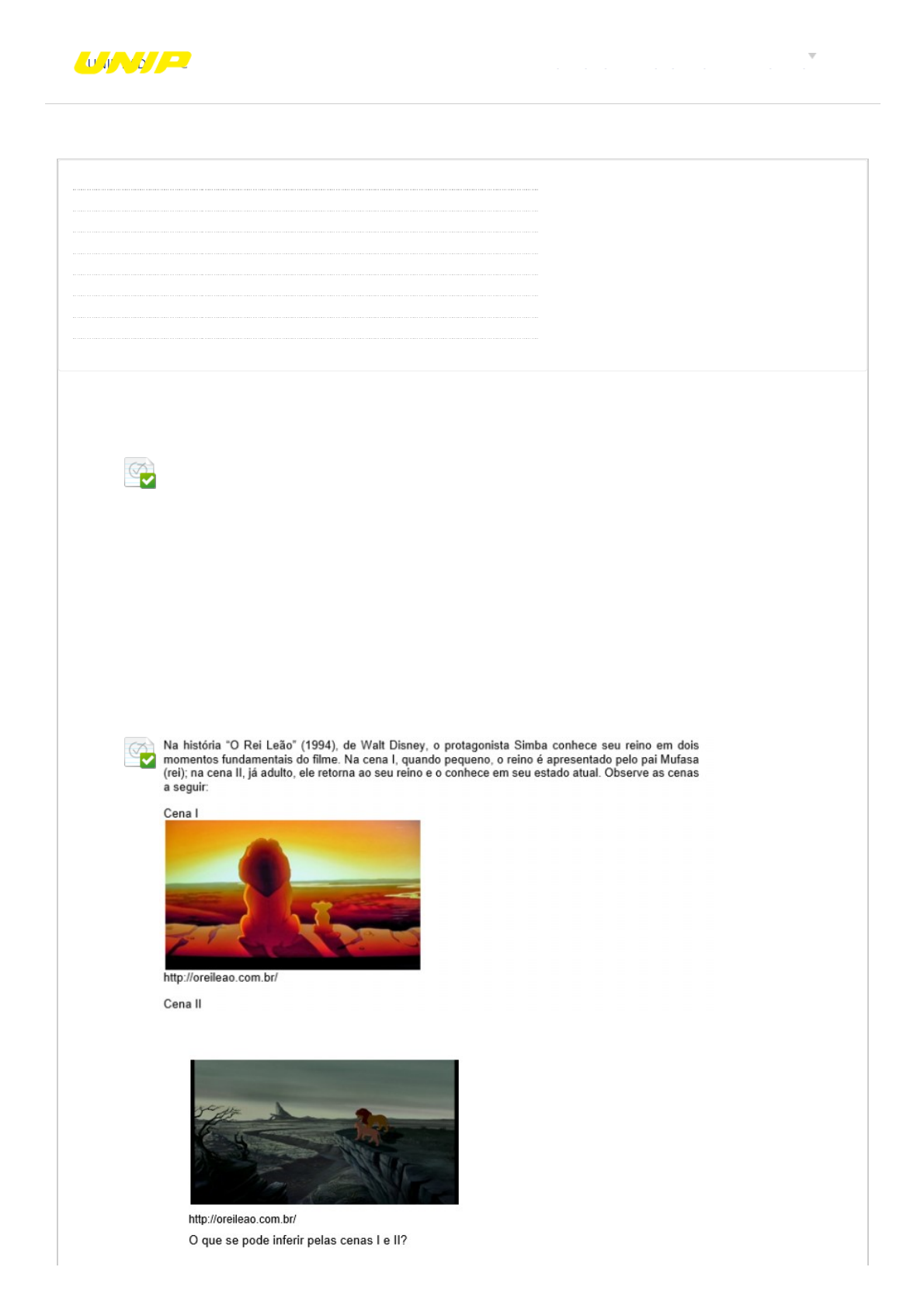08/09/2019 Revisar envio do teste: AVALIAÇÃO - TI I – 6717-20_... https://ava.ead.unip.br/webapps/assessment/review/review.jsp?attempt_id=_22439200_1&course_id=_47702_1&content_id=_744253_1&return_… 1/5 Revisar envio do teste: AVALIAÇÃO - TI IESTUDOS DISCIPLINARES IX 6717-20_SEI_PD_1017_R_20192 CONTEÚDO Usuário Curso Teste Iniciado Enviado Status ESTUDOS DISCIPLINARES IX AVALIAÇÃO - TI I 08/09/19 10:38 08/09/19 11:20 Completada Resultado da tentativa 10 em 10 pontos Tempo decorrido 41 minutos Resultados exibidos Respostas enviadas, Perguntas respondidas incorretamente Pergunta 1 Resposta Selecionada: a. Ao trabalhar �lme em sala de aula, pressupõe-se que o professor: I. Faça um planejamento prévio, por meio do qual tenha clareza quanto aos objetivos relativos à utilização do �lme. II. Decida se o �lme será utilizado na íntegra ou apenas em alguns trechos (e quais seriam, nesse caso, as sequências selecionadas). III. De�na qual a relação entre o �lme e os conteúdos que estão sendo trabalhados em sala de aula. Está(ão) correto(s): Todos os pressupostos são corretos. Pergunta 2 UNIP EAD BIBLIOTECAS MURAL DO ALUNO TUTORIAIS LABORATÓRIOSCONTEÚDOS ACADÊMICOS 1 em 1 pontos 1 em 1 pontos .edu.br https://ava.ead.unip.br/webapps/blackboard/execute/courseMain?course_id=_47702_1 https://ava.ead.unip.br/webapps/blackboard/content/listContent.jsp?course_id=_47702_1&content_id=_744247_1&mode=reset https://ava.ead.unip.br/webapps/portal/execute/tabs/tabAction?tab_tab_group_id=_10_1 https://ava.ead.unip.br/webapps/portal/execute/tabs/tabAction?tab_tab_group_id=_27_1 https://ava.ead.unip.br/webapps/portal/execute/tabs/tabAction?tab_tab_group_id=_47_1 https://ava.ead.unip.br/webapps/portal/execute/tabs/tabAction?tab_tab_group_id=_29_1 https://ava.ead.unip.br/webapps/portal/execute/tabs/tabAction?tab_tab_group_id=_64_1 https://ava.ead.unip.br/webapps/portal/execute/tabs/tabAction?tab_tab_group_id=_25_1 https://ava.ead.unip.br/webapps/login/?action=logout 08/09/2019 Revisar envio do teste: AVALIAÇÃO - TI I – 6717-20_... https://ava.ead.unip.br/webapps/assessment/review/review.jsp?attempt_id=_22439200_1&course_id=_47702_1&content_id=_744253_1&return_… 2/5 Resposta Selecionada: b. Houve alteração no reino, percebida pela mudança de cores, com cores quentes na cena I e cores sombrias e escuras na cena II. Pergunta 3 Resposta Selecionada: c. A construção da imagem cinematográ�ca vai além do visual, tendo como apoio a estrutura de cenas, o trabalho de câmera, o som, os diálogos, as locações, entre outras. Todo esse conjunto que compõe a imagem do �lme traz, além da narrativa propriamente dita, a intertextualidade construída por uma variedade de meios de representação. Assinale a alternativa em que se veri�ca que não há relação de intertextualidade entre as histórias. 101 dálmatas (�lme de Walt Disney) – Madagascar (�lme Eric Darnell e Tom McGrath). Pergunta 4 Resposta Selecionada: c. Veri�ca-se a relação entre cinema e atualidade pelas imagens tecnológicas de cada cena. Pergunta 5 1 em 1 pontos 1 em 1 pontos 1 em 1 pontos http://pt.wikipedia.org/wiki/Eric_Darnell http://pt.wikipedia.org/wiki/Tom_McGrath 08/09/2019 Revisar envio do teste: AVALIAÇÃO - TI I – 6717-20_... https://ava.ead.unip.br/webapps/assessment/review/review.jsp?attempt_id=_22439200_1&course_id=_47702_1&content_id=_744253_1&return_… 3/5 Resposta Selecionada: a. O cenário aqui é semelhante ao do ambiente da savana da qual faz parte o reinado de Mufasa. Pergunta 6 Resposta Selecionada: e. Quanto à metodologia para trabalhar com �lmes em sala de aula, a informação incorreta é: Deve-se manter a ideia original da história, sem relacioná-la com o ponto de vista atual do professor/aluno. Pergunta 7 Leia as a�rmações que podemos associar ao cinema na escola. I. Ver signi�ca essencialmente conhecer, perceber pela visão, alcançar com as vista os seres, as coisas e as formas do mundo ao redor. Ver é também um exercício de construção perceptiva em que os elementos selecionados e o percurso visual podem ser educados. II. Observar é olhar, pesquisar, detalhar, estar atento, de diferentes maneiras, às particularidades visuais, relacionando-as entre si. 1 em 1 pontos 1 em 1 pontos 08/09/2019 Revisar envio do teste: AVALIAÇÃO - TI I – 6717-20_... https://ava.ead.unip.br/webapps/assessment/review/review.jsp?attempt_id=_22439200_1&course_id=_47702_1&content_id=_744253_1&return_… 4/5 Resposta Selecionada: d. III. O saber ver e observar podem ser trabalhados de maneira que a pessoa possa analisar, re�etir, interferir e produzir visualmente por meio do entendimento da linguagem visual. Está(ao) correta(s) a(s) a�rmativa(s): I, II e III; Pergunta 8 Resposta Selecionada: e. Algumas cenas, no decorrer da história do cinema, tornaram-se extremamente famosas, sendo repetidas em muitos �lmes posteriores ou em situações fora do cinema. Tais cenas são copiadas, plagiadas, parodiadas, prestigiadas, sendo representadas em outros �lmes, festas, nas ruas etc. A este fenômeno chamamos intertextualidade. Dos pares de cenas a seguir, identi�que aquele que não tem relação intertextual entre as cenas. . Pergunta 9 Resposta Selecionada: c. Nos �lmes infantis, vemos a narrativa clássica, em que o papel feminino geralmente segue o padrão de comportamento e de beleza da época da história. Dos �lmes a seguir, qual personagem feminina segue um papel clássico? Pergunta 10 O �lme “Rio”, de 2011, é americano e dirigido por um brasileiro, Carlos Saldanha. A história é sobre a arara azul, em extinção, que é levada para o Rio de Janeiro para se acasalar. Destacam-se duas cenas e sobre elas podemos a�rmar: 1 em 1 pontos 1 em 1 pontos 1 em 1 pontos 08/09/2019 Revisar envio do teste: AVALIAÇÃO - TI I – 6717-20_... https://ava.ead.unip.br/webapps/assessment/review/review.jsp?attempt_id=_22439200_1&course_id=_47702_1&content_id=_744253_