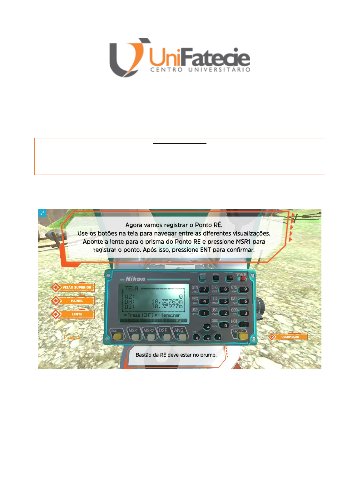 TECNÓLOGO EM GESTÃO AMBIENTAL – TOPOGRAFIA E GEORREFERENCIAMENTO Prezado aluno: Fernanda PROPOSTA DA ATIVIDADE 1) Apresente print do posicionamento do Ponto Ré; 2) Apresente print do posicionamento da Estação Total; 3) Copie e cole no seu relatório os dados do arquivo .txt gerado; 4) Determine a cota do terreno em cada ponto (do 1 ao 9) em relação ao nível 0,0 (ponto da Estação Total). Utilize as relações trigonométricas de seno, cosseno e tangente, a partir dos dados apresentados. 5) Desenhe o perfil topográfico entre os pontos 1,2 e 3. Escolha uma escala adequada. 1) Apresente print do posicionamento do Ponto Ré; https://www.eadunifatecie.com.br/course/view.php?id=15675 https://www.eadunifatecie.com.br/course/view.php?id=15675 2) Apresente print do posicionamento da Estação Total; 3) Copie e cole no seu relatório os dados do arquivo .txt gerado; Nome: FERNANDA ID: 0 Data: 15, 2023 Coordenadas: 0 0 0 ET: E1 CD: EST AI: 1.79 Ponto RE: E2 Ponto AP: 1.5 AZ: 0 PONTO E2 (RE) Distancia Horizontal: 10.35765 Distancia Inclinada: 10.35977 Angulo Vertical: 2.385925º Angulo Horizontal: 0º PONTO NUMERO 1: Codigo: TER Distancia Horizontal: 7.907577 Distancia Inclinada: 7.929179 Angulo Vertical: 4.070099º Angulo Horizontal: -105.4573º PONTO NUMERO 2: Codigo: TER Distancia Horizontal: 9.201822 Distancia Inclinada: 9.205851 Angulo Vertical: 2.526276º Angulo Horizontal: -46.89449º PONTO NUMERO 3: Codigo: TER Distancia Horizontal: 18.18275 Distancia Inclinada: 18.20963 Angulo Vertical: 4.140289º Angulo Horizontal: -16.04959º PONTO NUMERO 4: Codigo: TER Distancia Horizontal: 16.71146 Distancia Inclinada: 16.75639 Angulo Vertical: 5.122711º Angulo Horizontal: 16.2567º PONTO NUMERO 5: Codigo: TER Distancia Horizontal: 20.78558 Distancia Inclinada: 20.8945 Angulo Vertical: 6.456024º Angulo Horizontal: 44.539º PONTO NUMERO 6: Codigo: TER Distancia Horizontal: 11.80973 Distancia Inclinada: 11.86498 Angulo Vertical: 5.754272º Angulo Horizontal: 70.73761º PONTO NUMERO 7: Codigo: TER Distancia Horizontal: 7.944243 Distancia Inclinada: 8.028933 Angulo Vertical: 7.789337º Angulo Horizontal: 122.8508º PONTO NUMERO 8: Codigo: TER Distancia Horizontal: 4.171425 Distancia Inclinada: 4.204135 Angulo Vertical: 6.315674º Angulo Horizontal: 188.5841º PONTO NUMERO 9: Codigo: TER Distancia Horizontal: 5.391878 Distancia Inclinada: 5.398513 Angulo Vertical: 3.719238º Angulo Horizontal: 28.6357º 4) Determine a cota do terreno em cada ponto (do 1 ao 9) em relação ao nível 0,0 (ponto da Estação Total). Utilize as relações trigonométricas de seno, cosseno e tangente, a partir dos dados apresentados. PONTO 1: 0,8527885394 PONTO 2:0,6957713484 PONTO 3:1,604713484 PONTO 4:1,786163022 PONTO 5:2,639389872 PONTO 6:1,479609551 PONTO 7:1,378170824 PONTO 8:0,7524809906 PONTO 9:0,6401873466 5) Desenhe o perfil topográfico entre os pontos 1, 2 e 3. Escolha uma escala adequada. 0,85 0,69 1,6 0 0,2 0,4 0,6 0,8 1 1,2 1,4 1,6 1,8 PONTO 1 PONTO 2 PONTO 3 Perfil Topográfico 1-2-3