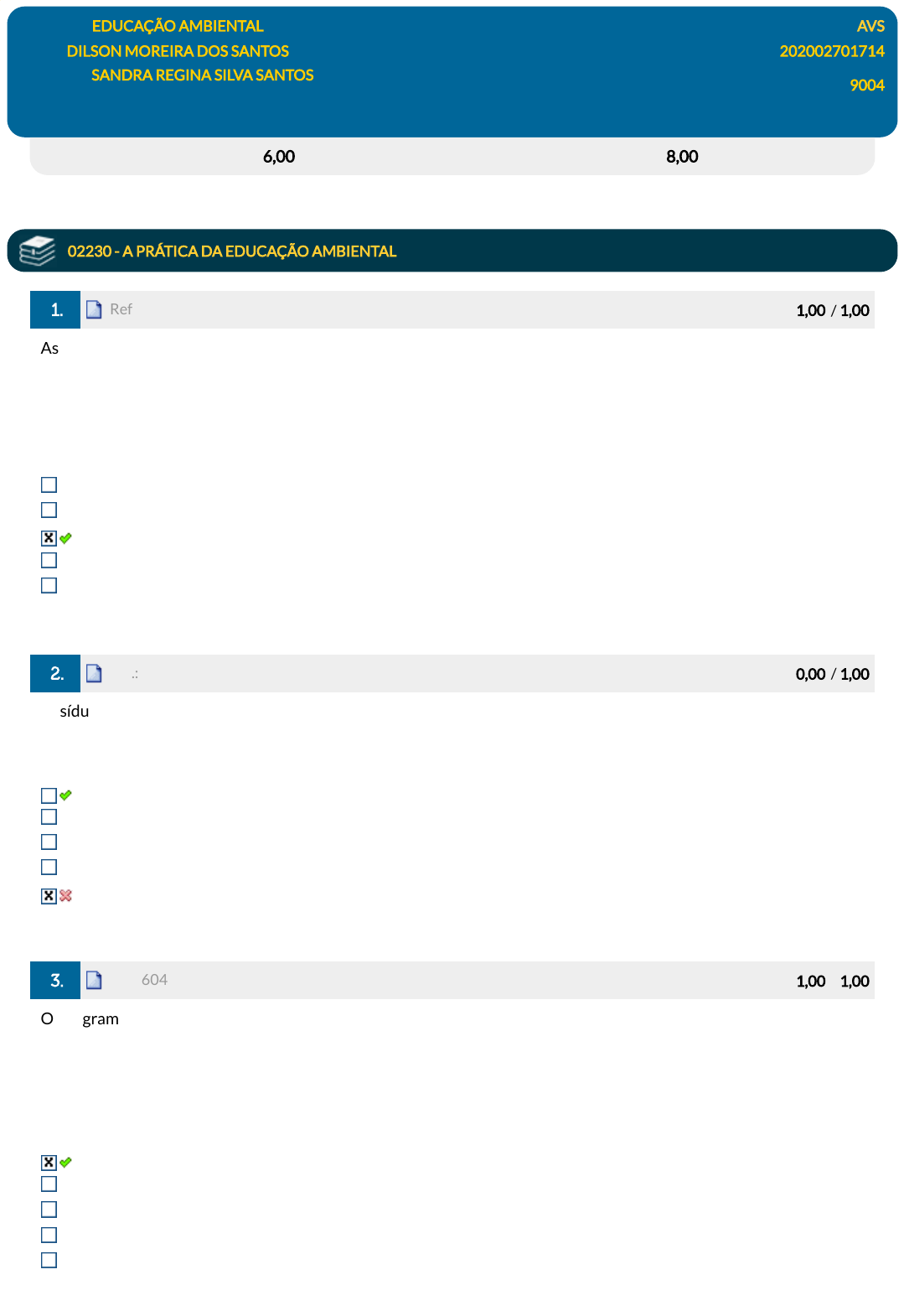 Disciplina: EDUCAÇÃO AMBIENTAL AVS Aluno: DILSON MOREIRA DOS SANTOS 202002701714 Professor: SANDRA REGINA SILVA SANTOS Turma: 9004 DGT0081_AVS_202002701714 (AG) 24/06/2023 19:53:29 (F) Avaliação: 6,00 pts Nota SIA: 8,00 pts 02230 - A PRÁTICA DA EDUCAÇÃO AMBIENTAL 1. Ref.: 6045884 Pontos: 1,00 / 1,00 As cidades são caracterizadas por terem grandes áreas construídas pelo homem. São elementos arquitetônicos comuns nas áreas urbanas prédios com mais de três andares, conjuntos de ruas e avenidas asfaltadas, com calçadas e iluminação pública, infraestrutura humana, como hospitais, centros culturais e educacionais, entre outros. Analisando as alternativas disponíveis, escolha a que se refere a outra marcante característica do ambiente urbano. Baixa densidade populacional. Áreas destinadas ao cultivo de vegetais orgânicos. Alta densidade populacional. Atividades econômicas do setor primário de produção. Recursos naturais preservados. 2. Ref.: 6045883 Pontos: 0,00 / 1,00 Resíduos líquidos são um dos principais impactos ambientais presentes nas regiões urbanas. Correlacione a problemática dos resíduos líquidos assinalando a alternativa que apresenta os impactos secundários do manejo inadequado dos resíduos líquidos. Poluição da água e proliferação de doenças. Competição de espécies exóticas com espécies naturais da região. Obstrução do trânsito de pessoas e veículos. Poluição visual ou luminosa. Queimadas e perda de áreas �orestadas. 3. Ref.: 6045990 Pontos: 1,00 / 1,00 O Programa de Educação Ambiental Marinha Albatroz na Escola (PAE) tem como objetivo sensibilizar alunos e educadores para a conservação de albatrozes e petréis e do ecossistema costeiro como um todo. O programa é realizado dentro do ambiente escolar e em outros espaços de ensino, promovendo atividades para os estudantes do Ensino Fundamental I e II, Ensino Médio e Educação para Jovens e Adultos (EJA) com o patrocínio da Petrobras por meio do Programa Petrobras Socioambiental. Considerando o que foi explicitado no texto acima, é correto a�rmar que: O programa é um modelo de educação ambiental formal. O programa tem apoio de órgãos governamentais. O programa é focado na conscientização sobre os resíduos urbanos. O programa promove a conscientização sobre problemas ambientais de zonas rurais. O programa é um modelo de educação ambiental informal. javascript:alert('C%C3%B3digo da quest%C3%A3o: 6045884.'); javascript:alert('C%C3%B3digo da quest%C3%A3o: 6045883.'); javascript:alert('C%C3%B3digo da quest%C3%A3o: 6045990.'); 02360 - CONSCIÊNCIA SOCIOAMBIENTAL E SUSTENTABILIDADE 4. Ref.: 6076745 Pontos: 1,00 / 1,00 A Política Nacional do Meio Ambiente (PNMA - 1981) foi um marco na legislação ambiental brasileira. Sobre este tema marque a alternativa correta. Visou o planejamento urbano contra a poluição e desmatamento. Visou a elaboração de uma política industrial sustentável. Visou o desenvolvimento socioeconômico, dignidade e segurança nacional, recuperando e preservando o meio ambiente. Visou a criação de órgãos de �scalização ambientais, agindo de forma rígida contra poluidores. Visou a recuperação de solos tendo em vista o desenvolvimento de tecnologias contra a deserti�cação. 5. Ref.: 6082195 Pontos: 1,00 / 1,00 É possível descentralizar o poder dos órgãos públicos e assegurar a participação da sociedade no desenvolvimento sustentável e na preservação do meio ambiente. Assinale a opção que melhor conceitue a importância das crianças e adolescentes na Gestão Comunitária do Meio Ambiente. A juventude deverá compreender seu papel na luta contra o desmatamento. A juventude deverá compreender ações erradas promovidas por seus ancestrais para o entendimento da crise ambiental. A juventude deverá compreender ações que in�uenciam na sua vida atual e o no seu futuro, individualmente e comunitariamente. A juventude deverá estudar novos métodos de desenvolvimento sustentável para a aplicação em suas comunidades. A juventude deverá compreender o contexto histórico que levou à crise ambiental. 02374 - DCNS PARA A EDUCAÇÃO AMBIENTAL 6. Ref.: 6077063 Pontos: 1,00 / 1,00 (FUNDEP/MG/2019 - adaptada) Ao longo das últimas décadas, a Educação Ambiental (EA) tem sido desenvolvida por diversos pro�ssionais e em diversos contextos, objetivando sensibilizar as pessoas para uma mudança em relação ao meio ambiente. Sobre a história da educação ambiental, analise as seguintes a�rmativas. I. No Brasil, a Educação Ambiental aparece para o grande público nos primeiros momentos, como uma prática monolítica, que reduziu as diferentes características pedagógicas, políticas, éticas e epistemológicas desse subcampo social de estudos. II. Uma das macrotendências da EA no Brasil é conhecida como Pragmática e está ligada aos movimentos para o desenvolvimento sustentável e o consumo sustentável, representando um ambientalismo de resultados. Seus adeptos propõem ações comportamentalistas e individuais, evitando misturar questões políticas com ecologia e não debatendo a desigualdade e as injustiças sociais. III. Outra macrotendência da EA brasileira é a Crítica, que se propõe a ser transformadora, emancipatória e popular. É considerada politizante, pois busca enfrentar politicamente as desigualdades e a injustiça socioambiental. Trabalha com conceitos-chave, tais como democracia, cidadania, justiça ambiental, entre outros. Assinale as alternativas que apresenta a(s) a�rmativa(s) correta(s). javascript:alert('C%C3%B3digo da quest%C3%A3o: 6076745.'); javascript:alert('C%C3%B3digo da quest%C3%A3o: 6082195.'); javascript:alert('C%C3%B3digo da quest%C3%A3o: 6077063.'); I e II, apenas. III, apenas. I e III, apenas. II e III, apenas. I, II e III. 7. Ref.: 6077066 Pontos: 0,00 / 1,00 Os riscos que grupos humanos causam no meio ambiente podem não ser passageiros e afetar a biodiversidade de 