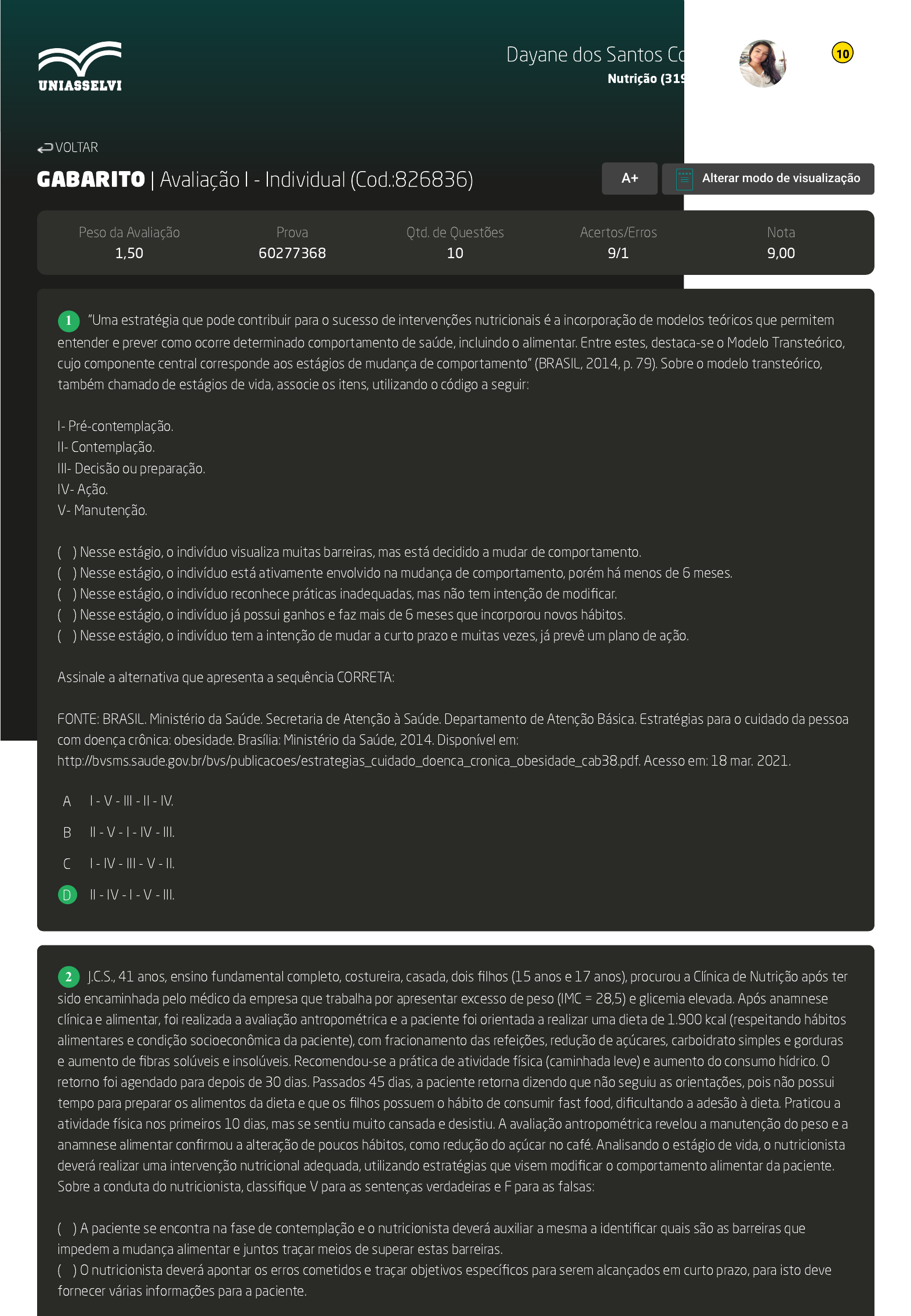 28/06/2023, 21:14 AVA https://ava2.uniasselvi.com.br/subject/grades-and-tests/answer-book/eyJ0ZXN0Ijp7InRlc3RDb2RlIjoiODI2ODM2IiwiZGVzY3JpcHRpb24iOiJBdmFsaWHDp8OjbyBJIC0gSW5kaXZpZHVhbCIsInBhcmFtZXRlciI6MTI5M… 1/4 GABARITO | Avaliação I - Individual (Cod.:826836) Peso da Avaliação 1,50 Prova 60277368 Qtd. de Questões 10 Acertos/Erros 9/1 Nota 9,00 "Uma estratégia que pode contribuir para o sucesso de intervenções nutricionais é a incorporação de modelos teóricos que permitem entender e prever como ocorre determinado comportamento de saúde, incluindo o alimentar. Entre estes, destaca-se o Modelo Transteórico, cujo componente central corresponde aos estágios de mudança de comportamento" (BRASIL, 2014, p. 79). Sobre o modelo transteórico, também chamado de estágios de vida, associe os itens, utilizando o código a seguir: I- Pré-contemplação. II- Contemplação. III- Decisão ou preparação. IV- Ação. V- Manutenção. ( ) Nesse estágio, o indivíduo visualiza muitas barreiras, mas está decidido a mudar de comportamento. ( ) Nesse estágio, o indivíduo está ativamente envolvido na mudança de comportamento, porém há menos de 6 meses. ( ) Nesse estágio, o indivíduo reconhece práticas inadequadas, mas não tem intenção de modificar. ( ) Nesse estágio, o indivíduo já possui ganhos e faz mais de 6 meses que incorporou novos hábitos. ( ) Nesse estágio, o indivíduo tem a intenção de mudar a curto prazo e muitas vezes, já prevê um plano de ação. Assinale a alternativa que apresenta a sequência CORRETA: FONTE: BRASIL. Ministério da Saúde. Secretaria de Atenção à Saúde. Departamento de Atenção Básica. Estratégias para o cuidado da pessoa com doença crônica: obesidade. Brasília: Ministério da Saúde, 2014. Disponível em: http://bvsms.saude.gov.br/bvs/publicacoes/estrategias_cuidado_doenca_cronica_obesidade_cab38.pdf. Acesso em: 18 mar. 2021. A I - V - III - II - IV. B II - V - I - IV - III. C I - IV - III - V - II. D II - IV - I - V - III. J.C.S., 41 anos, ensino fundamental completo, costureira, casada, dois filhos (15 anos e 17 anos), procurou a Clínica de Nutrição após ter sido encaminhada pelo médico da empresa que trabalha por apresentar excesso de peso (IMC = 28,5) e glicemia elevada. Após anamnese clínica e alimentar, foi realizada a avaliação antropométrica e a paciente foi orientada a realizar uma dieta de 1.900 kcal (respeitando hábitos alimentares e condição socioeconômica da paciente), com fracionamento das refeições, redução de açúcares, carboidrato simples e gorduras e aumento de fibras solúveis e insolúveis. Recomendou-se a prática de atividade física (caminhada leve) e aumento do consumo hídrico. O retorno foi agendado para depois de 30 dias. Passados 45 dias, a paciente retorna dizendo que não seguiu as orientações, pois não possui tempo para preparar os alimentos da dieta e que os filhos possuem o hábito de consumir fast food, dificultando a adesão à dieta. Praticou a atividade física nos primeiros 10 dias, mas se sentiu muito cansada e desistiu. A avaliação antropométrica revelou a manutenção do peso e a anamnese alimentar confirmou a alteração de poucos hábitos, como redução do açúcar no café. Analisando o estágio de vida, o nutricionista deverá realizar uma intervenção nutricional adequada, utilizando estratégias que visem modificar o comportamento alimentar da paciente. Sobre a conduta do nutricionista, classifique V para as sentenças verdadeiras e F para as falsas: ( ) A paciente se encontra na fase de contemplação e o nutricionista deverá auxiliar a mesma a identificar quais são as barreiras que impedem a mudança alimentar e juntos traçar meios de superar estas barreiras. ( ) O nutricionista deverá apontar os erros cometidos e traçar objetivos específicos para serem alcançados em curto prazo, para isto deve fornecer várias informações para a paciente. VOLTAR A+ Alterar modo de visualização 1 2 Dayane dos Santos Correia Nutrição (3194054) 10 28/06/2023, 21:14 AVA https://ava2.uniasselvi.com.br/subject/grades-and-tests/answer-book/eyJ0ZXN0Ijp7InRlc3RDb2RlIjoiODI2ODM2IiwiZGVzY3JpcHRpb24iOiJBdmFsaWHDp8OjbyBJIC0gSW5kaXZpZHVhbCIsInBhcmFtZXRlciI6MTI5M… 2/4 ( ) Durante a consulta, o nutricionista deve encorajar a paciente, mostrando a ela que é capaz de adotar as recomendações nutricionais e, para isso, precisa ter confiança em si mesma. ( ) Cada vez que a paciente apresentar uma barreira para adotar determinada mudança, o nutricionista deverá criticar duramente e impor estratégias. Assinale a alternativa que apresenta a sequência CORRETA: A F - F - V - V. B V - V - F - F. C V - F - V - F. D V - F - V - V. Ana Carolina em uma consulta de rotina descobriu que está com a pressão arterial elevada e excesso de peso. O médico a encaminhou para uma consulta com nutricionista com a recomendação de adoção de uma dieta hipossódica e perda de peso, com objetivo de controle da pressão arterial. Ana Carolina relata estar satisfeita com seu corpo, mas foi à consulta nutricional devido ao seu estado de saúde. Considerando o modelo transteórico ou de estágio de vida, assinale a alternativa CORRETA: A Ana Carolina está no estágio de pré-contemplação e o foco de intervenção a ser adotado pelo nutricionista é definir o plano de ação que será implementado nos próximos 30 dias, visando à perda de peso e redução no consumo de sódio. B Ana Carolina está no estágio de pré-contemplação e o foco de intervenção a ser adotado pelo nutricionista é o de aumentar o conhecimento de Ana Carolina sobre o saudável e a consciência sobre a sua prática alimentar. C Ana Carolina está no estágio de preparação e o foco de intervenção a ser adotado pelo nutricionista é de treinar as habilidades de Ana Carolina para alterar o seu comportamento por mais tempo. D Ana Carolina está no estágio de ação e o foco de intervenção a ser adotad