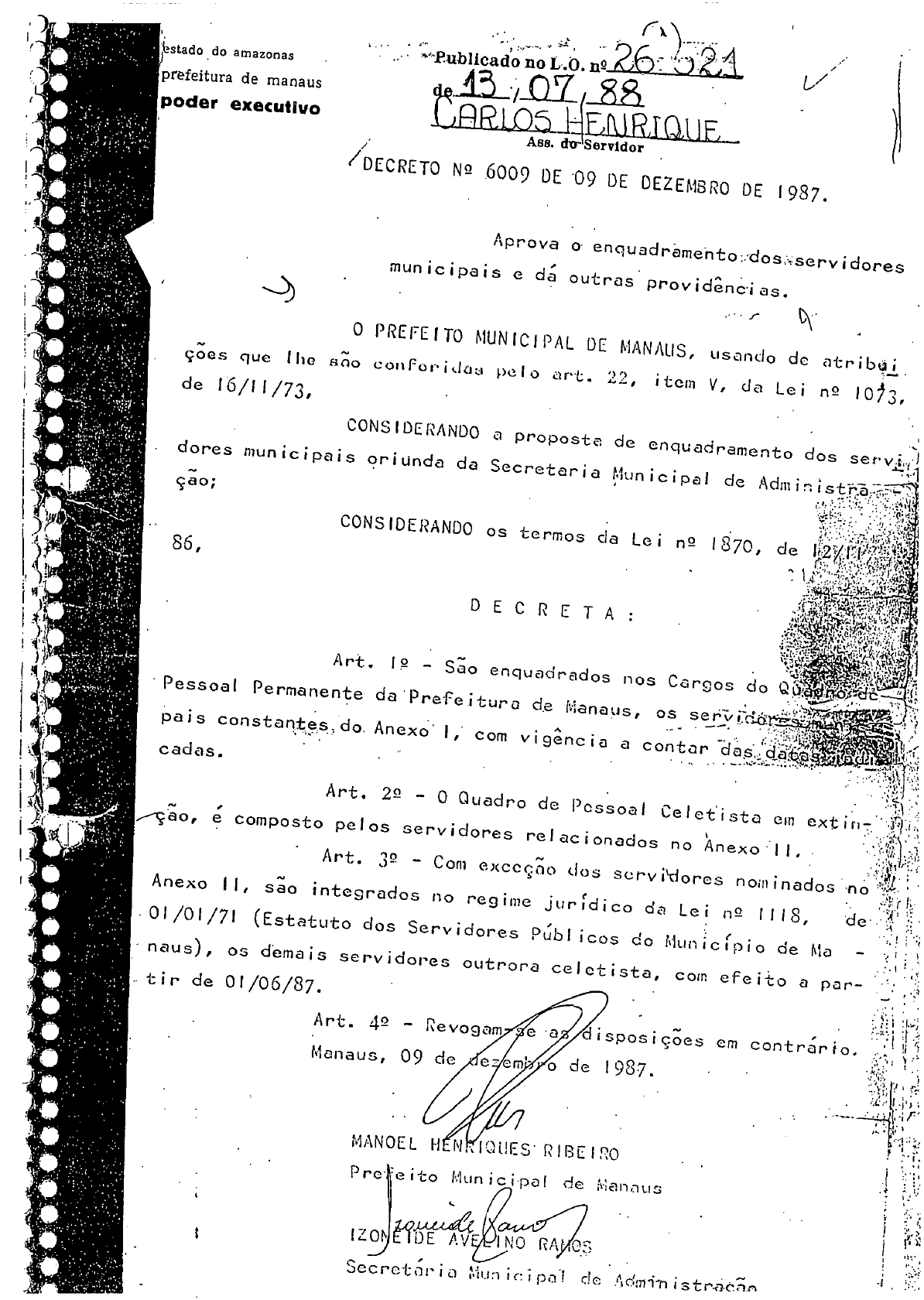 ,'. , ~, I~ ~.~ / L/ em 1987. R I BE 1:-:0 DECRETA 09 Aprova o'enqu adràme'nto ::dos:"oservidores municipais e d~ outras provid~n~ias. r ~. MANOEL prJ'cito 1','lunicip<:l! \!e ;\'é1l1tlllS <. #J .~~ Izm ffOE !'.V- I NO . " , " '1 I ""./.. " ~Secrct<1l' I i.) ~;I!.J:lI (: I Pi) c.e .'IComTl1 I s •..r.<J.C<"l.n / IDECRETO NQ 6009 DE D9 DE DEZEMBRO DE 1987. CONSIDERANDO os termos da Lei nQ /870, Art. f~ - S~o enquadrados nos CargoS Manaus, o PREFEITO ~lUNICIPAL DE MI\NALlS, llS.:lndo de éltrib~i çoes que lho sõo cOl\fo,..id{J~1 pelo ~lf.t. 22, itelll V, da Lei nO 1013, de 16/1 1/73, CONSIOERANDO a proposta de enquadramento dos dores municipais oriUnda da Secretaria ~unicipal de Çaoi 86, prefeitura de manaus eXecutivo cadas. 'Pessoal Permanente .:~.>.;:,;.;'.: './t: ,":: ...,) .'Art. 22 - O Quadro de Pessoal Celet'ista em exti;'17."lf/.;;: ' Composto pc Ios serv idores re J ac i onados no Anexo 11• ::::'}0l:!1 ":'~~) (Art. 3º - Com e)(cc(~ãodos serv j\dorcs nom inados 'no';,.., Anexo 11, sao integrados no reg ime j ur rd i co da Le i nQ I 118. de "'~.;rr OI/O J /71 (Estatuto dos Serv idores P~b I icos de Municf p io de "a i! ':: naus), os d~mais servidores outrora celctista, com .fei~o a par- :.) . til" de 01/06/87. Art. 40 I I ' : I j " } J;() , , i .i I ~ SEBASTIANA REIS DE SOUZA - NEOMESIA DE JESUS BELEM CELIA MARIA LOPES FREITAS - ELIZABETH SAMPAIO ELGALY FELICISSIMA MACEDO COSTA - MARIA SOLEDADE MATOS DA Cill-rnA - JANETH'ANDRADE CISNEROS - ESTEMIA FERREIRA CAMPOS - RIVALDO LIMA DE SOUZA - DOROTEIA BRASIL VALDEZ - MARIA DAS GRAÇAS M DA SILVA - MARIA DO CARMO P DA NATIVIDADE, - RAIMUNDA PASSOS BATISTA ~ MEIRE VIEIRA VERAS - MARIA Jost MELO DA COSTA - MARFIZA DA SILVA GRILLO - HORACIO ACACIOSEVALHO - MARIA LUIZA DE SENA NINA - MARIA JOSE GOMES FRAGOSO ~ MARIA DO P S VEIGA HORTA - CLENIR RIBEIRO FERREIRA - INES FERREIRA GONÇALVES - MARIAAGLAIDE S DE OLIVEIPA - GELCY SENAABRANTES, - MARCOS DE JESUS VILELA '- LBCIA CORDEIRO PEREIRA - DJANlRA GUALBERTO DA COSTA - IRISILDA CRISOSTOMO CARVALHO ,'- ALICE FABRICIO DA SILVA - MARIA MADALENA F DA SILVA - DELMA PArvA DOS SANTOS - MILSEN PERES DA COSTA - NELCY DA SILVA GorreS : - ANA PIMENTEL PINTO ~ NQR~' CRISTINA C DO C~MOV" )')t:~~~,estado do amazonas . 11~. prefeitura de manaus ) )' " : ,pOder executivo )- ]" l' ') ") '\ ) ) ) ) ) ) ) ) ) )' ) ) ) ) ) ) .l, ) ) ) , , ) l ) . ') ) ) ) ) ) 'I ) "") ) ) 'j' / '--'--':"._-~.-!"'~~~'-' ;...:...:;::'-~, .. , prefeitura de manaus POder executivo ELIZlI.AFONsO I,ASHAR - INANEIDJilCUNHA MARQUES - ALFREDO PEREIRA DO NASCIMENTO - LUIZ RENATO C VASCONCELOS - ROCICLEIOE DA C P SOLEDADE ~ADECY GOMES F VA~ENTE - WALDEMARINA BARBARA DE MORAES - ANA ALICIOIA MORAESCRISPIM - LUZILDA PIMENTEL DA SILVA - YOLANDA COSTA DA SILVA - SOLANGE OLIVEIRA DO NASCIMENTO - MARIA ALAIDE DE O T DUK - ANA CONCEIÇÃO ABECASSIS ALTINO - MARLY FATIMA MACEDO BARBOSA ...:.MARIA DO P S DA SILVA CAVALCAN'I'I - MIRIM-I Sn,VA RAFAEL - SANDRA NARIA NACHl\.DODE ASSIS ANACLETO CASSIO DE SOUZA, ~ MARIA TEREZilfliACOSTA ROCHA - ANADEFATlMAM PRIMO ...:.DARLENI!:NASCIMENTO ANDRADE - LUCIA COLLARES IPIRANGA ~ CLAUDETY DE S E S DE M TAVARES - TAPICIENE DA 1~CARNAÇÃO - DALVA DA COSTA CALDAS - JUDITH GUlMARAES VIEIRA... - ALDIR CAVALCANTE ANTUNES ~ DONATILLA DE CARVALHO CUADAL ...:.ANA LUIZA MOTA DE MMARTINHO ...:.MARIA JOSE B~OSA -ZItMA SILVA DE SOUZA - MARGARIDA MARIA L.MONTEIRO - JANE REGINA DAMIAM - JERSEY NAZARENO F DA TRINDÀDE ~ REGINA LUCIA AZEVEDO DE MELO - EURIDICE MOURA SARAIVA - WILMA TAVARES BARRETO COLASS~" ) •))'Y. , ) ) ) ) ) '\ ) ) ) ') ) ) ') ) I) ) ) ) } ) ) ) ) ) ') ) ) ) ) ) ) ) ) ) '--'--",/. '-fP~'. ) ) 6 '1.;'11 ' r }'I f ,) I "'j',I I r il ! fi estado do amazonas prefeitura .de manaus poder executivo JUNHO TtCNICO EN CI1~NCIAS HUNANAS B ANS-21 - INES MARIA PEREIRA DE CASTRO - JOSE HAMILTON S DOS SANTOS - ANTELMO JOSE M DOS SANTOS - CIECE MARIA ALVES BATISTA SETEMBRO JULHO - MARSYL DE OLIVEIRA MARQOES - MARIA DE NAZARE L DOS SANTOS - SUELI HOLANDA DOS R, TEIXEIRA - JOSE MARIA NOGUEIPA - ETELVINA SAMPAIO - AUREA CARVALHO PINHEIRO - ANA INES MARQUES DA SILVA - IVETE IVO DE BARROS - MARIA A11ELIA DE ARAUJO C COVAS - IMARITATAVARES DE ARAUJO - ABRAHIN NASSER NETO - MARIA GRACIENE A DE OLIVEIRA - ANA MARIA FERRAZ AFONSO - VALDENICE ANDRADE L DE FREITAS - NORA MARIA DE NORAES SARAIVA - MARIA FILONENA PE;,REI~A,t<VALLE '" "-\.."- ALICE REIKO NIívA' \ ;, - GlLINDA GUIMARAES DE AZEVEDO - MARIA SONIA MEGALDI BARROSO ' , '-."- ERCILIA ALHEIDA VIEIRA ~ LIGISMAR SAMPAIO HAVIGNIER . "..' . ,'"('.- MARIA DOlW'rEIA DOS S PIRE'.\l,\ ' '\.:. - ALINE SANTOS NONTEIRO -~A NARIA NOGUElrRA MARINHC1J..// J, , \- ) '-- ' )'- ) ) \ - ./ ,I " ') . ) ) 1 ) ) ) ) ) ) ) ) ) ) ) ) ) ) ) ) ) ) ":,t ) ) ) ) ) ) ) ) ) ) estado do amazonas prefeitura de manaus POder executivo - VEM LUCIA DA SILVA MAGALHAES ...:.GERALDO CARVALHO DA SILVA - AMADEU DE ABREU }mLO - JORGE DE OLIVEIRA RIBEIRO JACKSON JOSE DE J'FERREIRA ANTONIO DA SILVA BREVES -;..;.TEREZIN:HA DE JEsus A DA SILVA ;\ - VERONICA MARIA M PATRICIO ELDA DE NAZAREAVELINO - ORLANDO FERREIRA CRUZ - MARCO ANTONIO' P CARNEIRO MUNIZ - MARIA DAS GRAÇAS A DE OLrvEIR~ - SENIR DE CASTRO SILVA - HELENA DE OLIVEIRA SANTOS - NIZIA MOREIRA DE F LIBERATO - ROSA ~~IADE SOUZA MAR - VALDIR LIMA DA SILVA - RUTH VASCONCELOS CAVALCANTE - MARIA DAS GRAÇAS C DE MORAES - SELMA XAVIER - WADED MAGALY AMED DA COSTA ERNESTO DE SOUZA LIMA FILHO LUIZ ROUGLES FONSECA - JOSE BARBOSA FEITOSA T~CNICO EM CI~NCIAS Hill'ffiNASC ANS-22 JUNHO - ELOISA MARIA F DÁ SILVA - ARMANDO BARBUDA THURY P BRAS IL .-SONIA MARIA DE SOUZA PEREIRA ~ NILDENEVEs DOS SANTOS - MARIA PERPETUO S C DA SILVA - 11ARIA DAS GRAÇAS F GONÇALVES~' : , l '.:( j I I~ f i~:I'!I .. .1 . L I I l I '. -estado do .amazonas _pref~itura de manaus poder executivo - DIRCE FARES CAVALCANTE - MARGARIDA MARIA A DOS SANTOS;' - CARLETE DE SOUZA MACIEL - MAYARA DA SILVA DIEFENBACH - THETIS AGLArA A DE A DE SOUZA - MARIA AUXILIADORA C MACIEL ~ ANTONIO RIC4RDO PEIXOTO