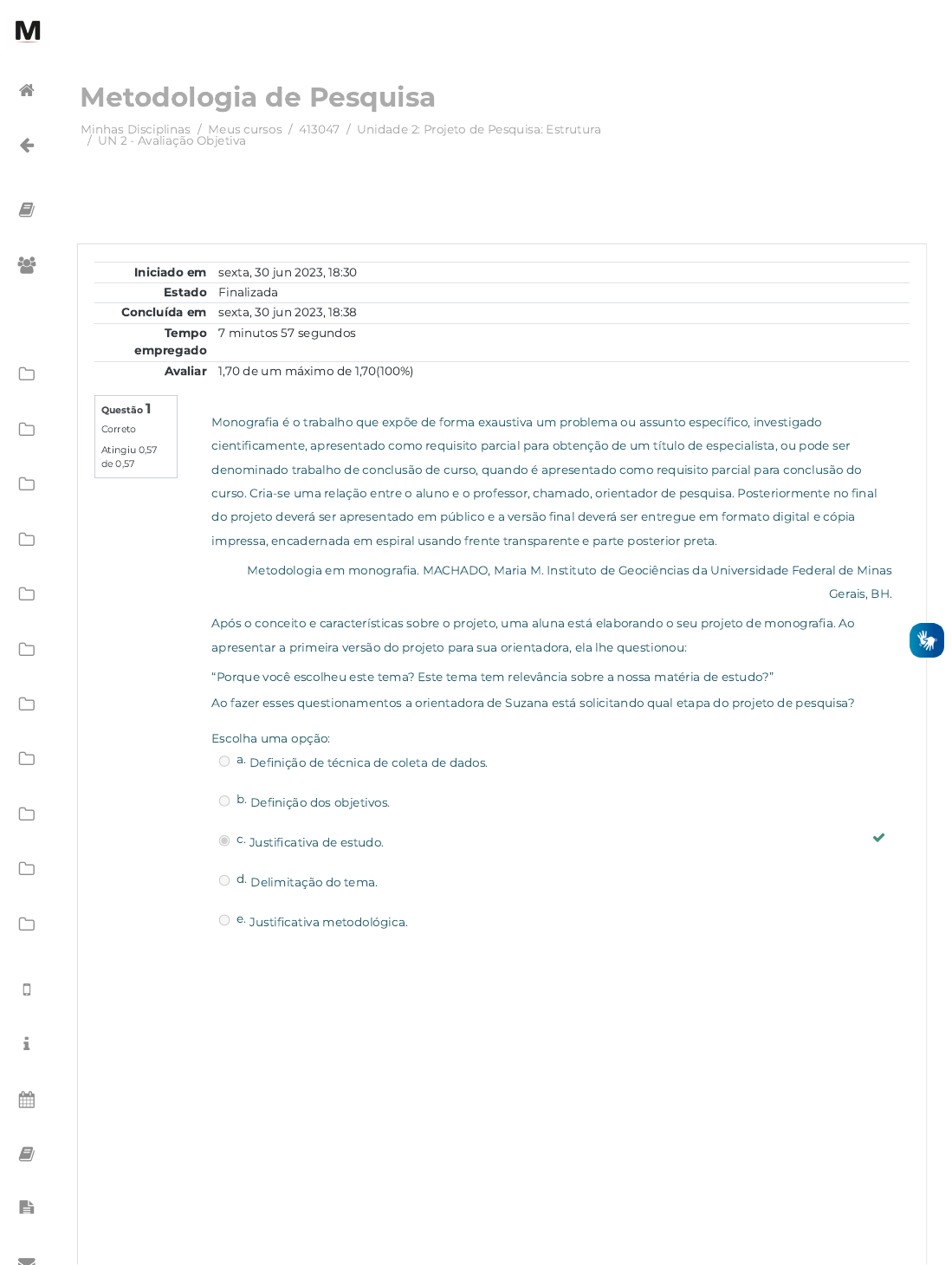 30/06/2023, 18:39 UN 2 - Avaliação Objetiva: Revisão da tentativa https://avap.multivix.edu.br/mod/quiz/review.php?attempt=3435805&cmid=1310470 1/3 Minhas Disciplinas / Meus cursos / 413047 / Unidade 2: Projeto de Pesquisa: Estrutura / UN 2 - Avaliação Objetiva Metodologia de Pesquisa Questão 1 Correto Atingiu 0,57 de 0,57 Iniciado em sexta, 30 jun 2023, 18:30 Estado Finalizada Concluída em sexta, 30 jun 2023, 18:38 Tempo empregado 7 minutos 57 segundos Avaliar 1,70 de um máximo de 1,70(100%) Monogra�a é o trabalho que expõe de forma exaustiva um problema ou assunto especí�co, investigado cienti�camente, apresentado como requisito parcial para obtenção de um título de especialista, ou pode ser denominado trabalho de conclusão de curso, quando é apresentado como requisito parcial para conclusão do curso. Cria-se uma relação entre o aluno e o professor, chamado, orientador de pesquisa. Posteriormente no �nal do projeto deverá ser apresentado em público e a versão �nal deverá ser entregue em formato digital e cópia impressa, encadernada em espiral usando frente transparente e parte posterior preta. Metodologia em monogra�a. MACHADO, Maria M. Instituto de Geociências da Universidade Federal de Minas Gerais, BH. Após o conceito e características sobre o projeto, uma aluna está elaborando o seu projeto de monogra�a. Ao apresentar a primeira versão do projeto para sua orientadora, ela lhe questionou: “Porque você escolheu este tema? Este tema tem relevância sobre a nossa matéria de estudo?” Ao fazer esses questionamentos a orientadora de Suzana está solicitando qual etapa do projeto de pesquisa? Escolha uma opção: a. De�nição de técnica de coleta de dados. b. De�nição dos objetivos. c. Justi�cativa de estudo. d. Delimitação do tema. e. Justi�cativa metodológica. https://avap.multivix.edu.br/my/ https://avap.multivix.edu.br/course/view.php?id=20052 https://avap.multivix.edu.br/course/view.php?id=20052§ion=3 https://avap.multivix.edu.br/mod/quiz/view.php?id=1310470 https://avap.multivix.edu.br/my/ https://avap.multivix.edu.br/course/view.php?id=20052 https://avap.multivix.edu.br/user/index.php?id=20052 https://avap.multivix.edu.br/course/view.php?id=20052§ion=1 https://avap.multivix.edu.br/course/view.php?id=20052§ion=2 https://avap.multivix.edu.br/course/view.php?id=20052§ion=3 https://avap.multivix.edu.br/course/view.php?id=20052§ion=4 https://avap.multivix.edu.br/course/view.php?id=20052§ion=5 https://avap.multivix.edu.br/course/view.php?id=20052§ion=6 https://avap.multivix.edu.br/course/view.php?id=20052§ion=7 https://avap.multivix.edu.br/course/view.php?id=20052§ion=8 https://avap.multivix.edu.br/course/view.php?id=20052§ion=9 https://avap.multivix.edu.br/course/view.php?id=20052§ion=10 https://avap.multivix.edu.br/course/view.php?id=20052§ion=11 https://avap.multivix.edu.br/hooks/portal/ https://avap.multivix.edu.br/mod/page/view.php?id=1252%2F%22%20target%3D%22_blank https://avap.multivix.edu.br/calendar/view.php/ https://avap.multivix.edu.br/local/staticpage/view.php?page=biblioteca https://portalweb.multivix.edu.br/gabaritos/login.aspx https://multivix.edu.br/office-365/ https://avap.multivix.edu.br/ 30/06/2023, 18:39 UN 2 - Avaliação Objetiva: Revisão da tentativa https://avap.multivix.edu.br/mod/quiz/review.php?attempt=3435805&cmid=1310470 2/3 Questão 2 Correto Atingiu 0,57 de 0,57 O projeto de pesquisa é o documento que servirá como guia para a pesquisa do Trabalho de Conclusão de Curso (TCC) ou Monogra�a. Ele tem por �nalidades antever e metodizar as etapas de um trabalho de pesquisa, sendo, portanto, o primeiro documento gerado em qualquer processo de investigação cientí�ca. Devem ser seguidas as mesmas Regras Gerais de Apresentação de descritas no Manual para elaboração de trabalhos acadêmicos, respeitando a ABNT – Associação Brasileira de Normas Técnicas. O trabalho deve ser organizado de acordo com a seguinte estrutura (tópico): capa, folha de rosto, lista de �guras, tabelas de abreviação e siglas, resumo, sumário, introdução, justi�cativa, problema, hipóteses, objetivos gerais e especí�cos, fundamentos na teoria, metodologia, cronograma, referências, apêndice e anexos (caso necessário). ASSOCIAÇÃO BRASILEIRA DE NORMAS TÉCNICAS. NBR 15287: informação e documentação: projeto de pesquisa: apresentação. Rio de Janeiro, ABNT, 2005. Sobre os objetivos do projeto, analise as a�rmações abaixo: I. O objetivo geral é o produto �nal, a meta, onde você pretende chegar. II. Deve-se elaborar um e apenas um objetivo especi�co. III. No objetivo geral deverá ser indicado claramente o que se deseja fazer, o que pretende alcançar e as etapas necessárias para se alcançar o objetivo �nal. IV. Nos objetivos especí�cos as frases devem ser curtas, claras e precisas, ou seja, bem objetivas. Assinale a alternativa com as a�rmativas corretas: Escolha uma opção: a. Apenas as alternativas I, II e IV. b. Apenas as alternativas II, III e IV. c. Todas as alternativas estão corretas. d. Apenas as alternativas I e IV estão corretas. e. Apenas as alternativas II e III estão corretas. https://avap.multivix.edu.br/my/ https://avap.multivix.edu.br/course/view.php?id=20052 https://avap.multivix.edu.br/user/index.php?id=20052 https://avap.multivix.edu.br/course/view.php?id=20052§ion=1 https://avap.multivix.edu.br/course/view.php?id=20052§ion=2 https://avap.multivix.edu.br/course/view.php?id=20052§ion=3 https://avap.multivix.edu.br/course/view.php?id=20052§ion=4 https://avap.multivix.edu.br/course/view.php?id=20052§ion=5 https://avap.multivix.edu.br/course/view.php?id=20052§ion=6 https://avap.multivix.edu.br/course/view.php?id=20052§ion=7 https://avap.multivix.edu.br/course/view.php?id=20052§ion=8 https://avap.multivix.edu.br/course/view.php?id=20052§ion=9 https://avap.multivix.edu.br/course/view.php?id=20052§ion=10 https://avap.multivix.edu.br/course/v