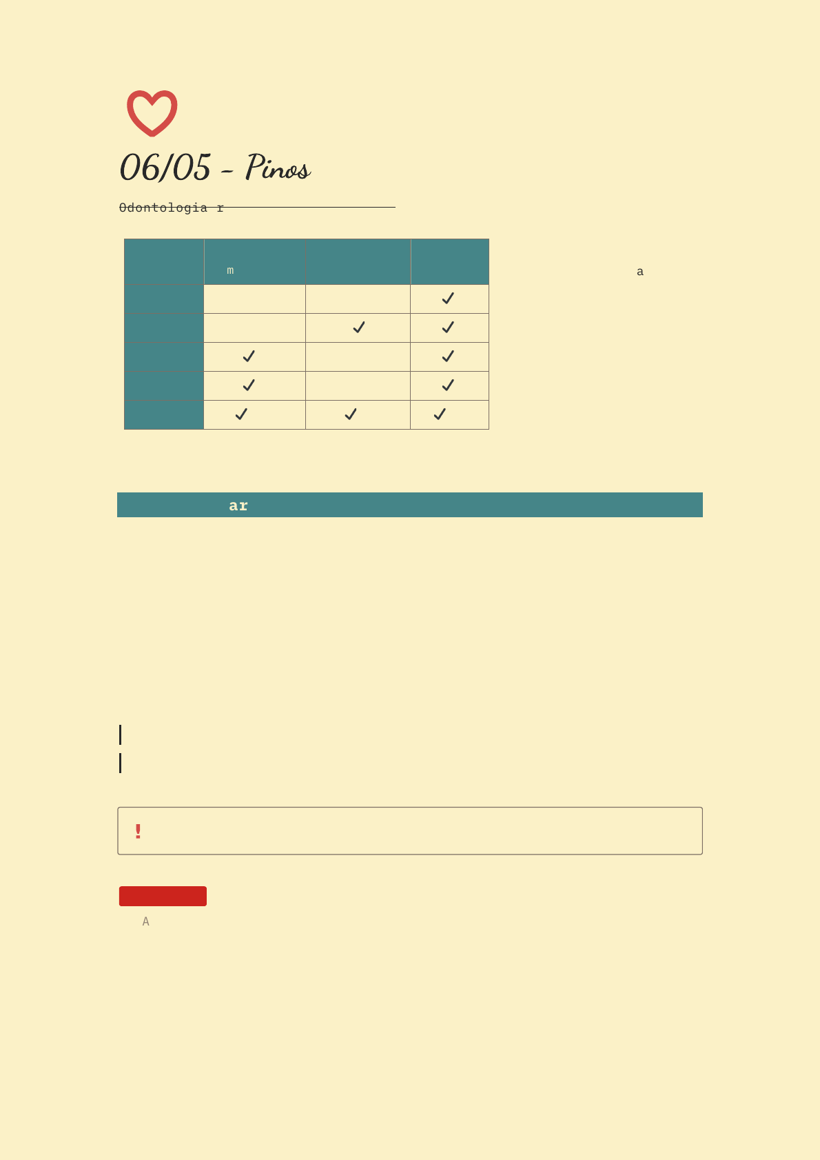 06/05 - Pinos Odontologia restauradora bachielle Metálicos cimentáveis Metálicos rosquevaeis Fibra de vidro Estética 🗙 🗙 Retenção 🗙 Stress 🗙 Custo 🗙 Técnica 🗙 🗙 🗙 Pino de fibra de vidro é o melhor sendo biocompatível com a dentina e vem junto a broca padronizada para ajuste correto na dentina com um stop para a facilidade de por no conduto Intradentinario Realizado em dente vitalizado Sistema adesivo - possui limitações e se restauração quebrar é indicado usar intradentinario com forma de retenção adicional em restaurações complexa, podendo ser cimentados e rosqueados Pinos cimentavel - profundidade intradentinaria para ter retenção e de 4mm 2mm para fora Rosqueavel - rosqueamento na dentina com profundidade de 1,3mm a 2mm, mas tem tensão lateral e apical quando inserido tendo também 2mm para fora Anteriores - 1 pino para cada ângulo inciso proximal perdidos Posteriores - 1 pino para cada cúspide perdida Perfuração deve estar 0,5 mm da junção dentina esmalte Ao pôr pinos seguir o paralelismo do dente Como fazer 1. Ataque ácido na região do preparo 2. Cimento resinado autoadesivos (perfuração pequena, não usar adesivo pois preenche o buraco) colocar cm sonda exploradora no furo 3. Inserir pino (Silano sobre o pino, sendo um agente de união, deve ser usado em pino de vidro) 4. Ácido sobre a cama de esmalte 5. Sistema adesivo 6. Mascarando do pino 7. Reabilitação Cuidados!!!! • Perfuração da câmara pulpar (cair em vazio ou sangramento) proteção pulpar com pasta de hidróxido de cálcio • Perfuração da superfície externa do dente - com perfuração do espaço biológico deve ser cortado o pino rente a superficie dental, remoção do pino extensão do preparo e restauração e deve ter conhecimento em periodontia, pois é possível fazer uma cirurgia periodontal • Orifício inadequado para inserção do pino - orifício sempre deve ser menor que o diâmetro do pino • Pino fraturado- não deve ser removido • Fratura da estrutura dental - fratura se for colocado em limite amelodentinario Intrarradiculares Usado somente pino de vidro em dentes com obturação no canal usando o conduto radicular como meio de retenção • Realize exame radiográfico para observar o remanescente coronário, a qualidade do tratamento endodôntico, o comprimento, a forma da raiz e a inclinação mesio-distal. Por que utilizar um retentor intraradicular? → Cavidades MOD, possuem 50% de redução da resistência pelo aumento da flexão cuspidea. → Remoção do teto da câmara pulpar com eliminação das cristas marginais, promove uma redução de 90% da resistência. → Eliminação da Polpa, promove uma desidratação da dentina, o que reduz em 14% de suas resistência Como fazer realizar a desobturação de 2/3 da raiz, sendo que 1/3 da raiz continua obturado com largo ou Gates sempre com água 1. Colocar broca 2. testar pino 3. Ataque ácido por 15 segundos e adesivo 4. Lavar abundantemente e secar com papel absorvente para tirar excesso 5. Colocar Silano no pino (adesivo no pino) 6. Cimento resinoso no conduto (não colocar no pino) 7. Colocar pino lentamente 8. Fotopolimerizar 9. Corte do pino com broca 10.Moldagem acido e adesivo e cimentar provisório 11. Em cerâmica colocar ácido e adesivo 12. Cimento resinoso no dente Sem título https://www.notion.so/49e7d0d9c20548d1aba2a13c8c2896fe?pvs=25