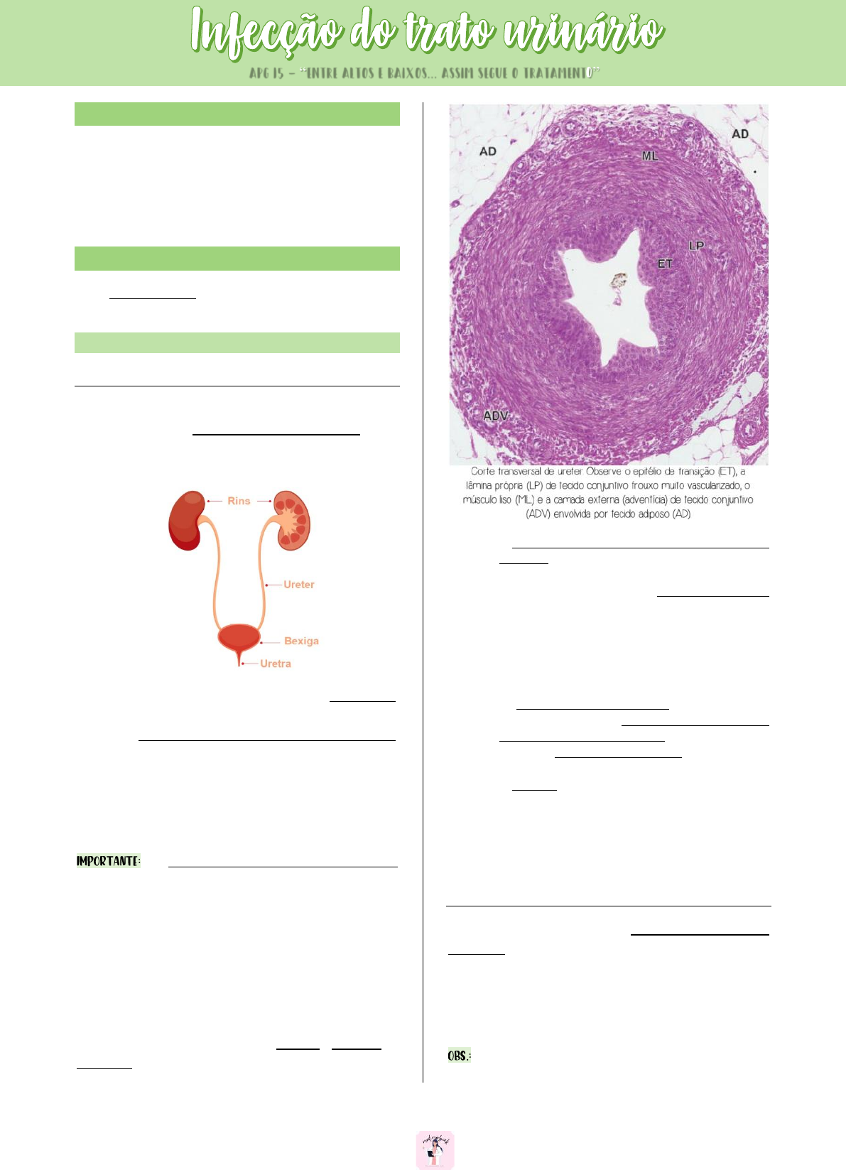 1 Júlia Morbeck – @med.morbeck Objetivos 1- Rever a morfofisiologia das vias urinárias; 2- Estudar a epidemiologia, etiologia, fatores de risco, fatores protetores, fisiopatologia, manifestações clínicas, diagnóstico e tratamento da infecção urinária. Vias urinárias ↠ O sistema urinário consiste em dois rins, dois ureteres, uma bexiga urinária e uma uretra (TORTORA, 14ª ed.). ANATOMIA E HISTOLOGIA URETERES ↠ Os ureteres são tubos delgados, com aproximadamente 25 cm de comprimento, que transportam a urina dos rins para a bexiga (MARIEB, 3ª ed.). ↠ Cada ureter começa superiormente, no nível de L II, como uma continuação da pelve renal. A partir daí, ele desce na posição retroperitoneal através do abdome, entra na pelve verdadeira ao cruzar a cavidade pélvica na junção sacroilíaca, entra no ângulo posterolateral da bexiga e depois segue medialmente dentro da parede posterior da bexiga antes de se abrir para o interior da bexiga (MARIEB, 3ª ed.). Essa entrada oblíqua na bexiga evita o refluxo de urina da bexiga para os ureteres, pois qualquer aumento de pressão dentro da bexiga comprime a parede desse órgão, fechando assim as extremidades distais dos ureteres (VÁLVULA FISIOLÓGICA) (MARIEB, 3ª ed.). Quando esta válvula fisiológica não está funcionando corretamente, é possível que microrganismos passem da bexiga urinária para os ureteres, infectando um ou ambos os rins (TORTORA, 14ª ed.). ↠ A estrutura histológica dos ureteres tubulares é a mesma dos cálices renais e da pelve renal; as paredes possuem três camadas básicas: mucosa, muscular e adventícia (MARIEB, 3ª ed.). • A mucosa de revestimento é composta por um epitélio transicional, que estica quando os ureteres se enchem de urina, e uma lâmina própria, composta por um tecido conjuntivo fibroelástico contendo placas de tecido linfático (MARIEB, 3ª ed.). O muco secretado pelas células caliciformes da túnica mucosa impede que as células entrem em contato com a urina, cuja concentração de soluto e cujo pH podem diferir drasticamente do citosol das células que formam a parede dos ureteres (TORTORA, 14ª ed.). • A camada muscular intermediária consiste em duas camadas de músculo liso: uma camada longitudinal interna e uma camada circular externa. Uma terceira camada muscular, a camada longitudinal externa, aparece no terço inferior do ureter (MARIEB, 3ªed.). • A adventícia (externa) da parede do ureter é um tecido conjuntivo típico (MARIEB, 3ª ed.). Contém vasos sanguíneos, vasos linfáticos e nervos que suprem a túnica muscular e a túnica mucosa. A túnica adventícia mescla-se a áreas de tecido conjuntivo e mantém os ureteres em posição (TORTORA, 14ª ed.). BEXIGA ↠ A bexiga urinária é um órgão muscular oco e distensível situado na cavidade pélvica posteriormente à sínfise púbica. Nos homens, é diretamente anterior ao reto; nas mulheres, é anterior à vagina e inferior ao útero. Pregas do peritônio mantêm a bexiga em sua posição (TORTORA, 14ª ed.). Quando ligeiramente distendida em decorrência do acúmulo de urina, a bexiga urinária é esférica. Quando está vazia, ela se achata. APG 15 – “ENTRE ALTOS E BAIXOS... ASSIM SEGUE O TRATAMENTO” 2 Júlia Morbeck – @med.morbeck Conforme o volume de urina aumenta, torna-se piriforme e ascende para a cavidade abdominal (TORTORA, 14ª ed.). ↠ A capacidade média da bexiga urinária é de 700 a 800 ml. Ela é menor nas mulheres, porque o útero ocupa o espaço imediatamente superior à bexiga urinária (TORTORA, 14ª ed.). ↠ A bexiga vazia tem a forma de uma pirâmide de cabeça para baixo com quatro superfícies triangulares e quatro cantos, ou ângulos. Os dois ângulos posterolaterais recebem os ureteres. No ângulo anterior da bexiga (ou ápice) há uma faixa fibrosa chamada úraco (“canal urinário do feto”), o remanescente fechado de um tubo embrionário chamado alantoide. O ângulo inferior (colo) converge para a uretra (MARIEB, 3ª ed.). Nos homens, a próstata, uma glândula do sistema genital, situa- se diretamente inferior à bexiga, onde circunda a uretra (MARIEB, 3ª ed.). ↠ No assoalho da bexiga urinária encontra-se uma pequena área triangular chamada trígono da bexiga. Os dois cantos posteriores do trígono da bexiga contêm os dois óstios dos ureteres; a abertura para a uretra, o óstio interno da uretra, encontra-se no canto anterior (TORTORA, 14ª ed.). O trígono tem uma importância clínica especial porque as infecções tendem a persistir nessa região (MARIEB, 3ª ed.). VASOS E NERVOS: As artérias que irrigam a bexiga são ramos das artérias ilíacas internas, principalmente as artérias vesicais superiores e inferiores. As veias que drenam a bexiga formam um plexo nas superfícies inferior e posterior desse órgão cujo sangue drena nas veias ilíacas internas. Os nervos que vão do plexo hipogástrico até a bexiga consistem em fibras parassimpáticas provenientes dos nervos esplâncnicos pélvicos, algumas fibras simpáticas oriundas dos nervos esplâncnicos torácicos inferiores e lombares superiores e fibras sensitivas viscerais (MARIEB, 3ª ed.). ↠ Três camadas formam a parede da bexiga urinária: (MARIEB, 3ª ed.). • Uma mucosa, com um epitélio transicional distensível e uma lâmina própria, forma o revestimento interno da bexiga. O revestimento mucoso contém pregas, ou rugas, que se achatam quando a bexiga enche (MARIEB, 3ª ed.). As células mais superficiais do epitélio de transição são responsáveis pela barreira osmótica entre a urina e os fluidos teciduais. Quando a bexiga se esvazia, a membrana se dobra nas regiões delgadas, e as placas espessas se invaginam e se enrolam, formando vesículas fusiformes intracitoplasmáticas, que permanecem próximo à superfície celular. Quando a bexiga se enche novamente, sua parede se distende, e ocorre um processo inverso, com transformação das vesículas citoplasmáticas fu