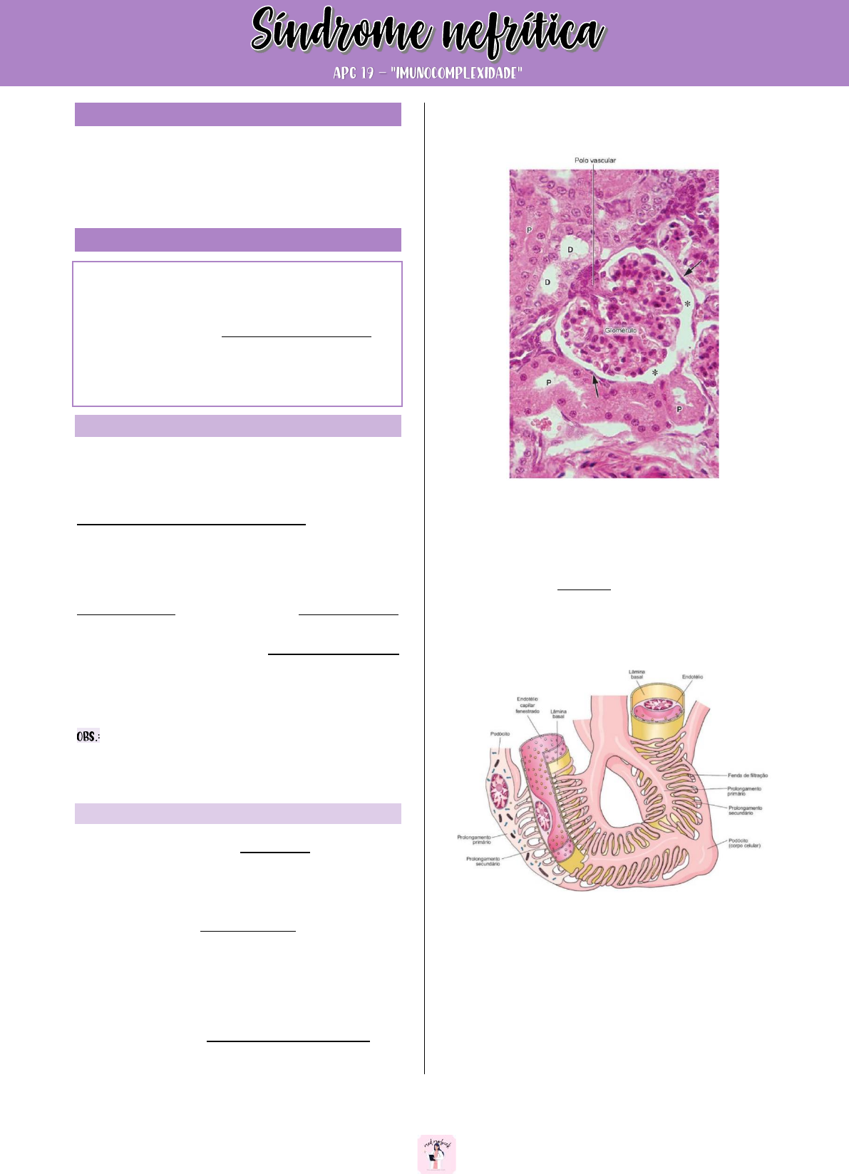 1 Júlia Morbeck – @med.morbeck Objetivos 1- Rever a morfofisiologia do glomérulo; 2- Estudar a epidemiologia, fatores de risco, etiologia, fisiopatologia, manifestações clínicas e diagnóstico da síndrome nefrítica. Glomérulo A principal unidade estrutural e funcional do rim é o néfron. Mais de um milhão desses túbulos apinham-se (unem-se estreitamente) em cada rim (MARIEB, 7ª ed.). Cada néfron é composto de corpúsculo renal e túbulo renal; este último é dividido em porções: túbulo contorcido proximal, alça do néfron (de Henle), túbulo contorcido distal e túbulo coletor. Em todo o seu comprimento, o néfron é revestido por um epitélio simples que é adaptado a vários aspectos da produção de urina (MARIEB, 7ª ed.). CORPÚSCULO RENAL ↠ A primeira parte do néfron, onde ocorre a filtração, é o corpúsculo renal esférico. Os corpúsculos renais ocorrem estritamente no córtex. Eles consistem em um novelo de capilares chamado glomérulo (“novelo de lã”) circundado por uma cápsula do glomérulo oca em forma de cálice (cápsula de Bowman) (MARIEB, 7ª ed.). ↠ Esse novelo de capilares é abastecido por uma arteríola aferente e drenado por uma arteríola eferente. O endotélio do glomérulo é fenestrado (possui poros) e, portanto, esses capilares são altamente permeáveis permitindo que grandes quantidades de fluido e de pequenas moléculas passem do sangue do capilar para o interior oco da cápsula, o espaço capsular. (MARIEB, 7ªed.). Esse fluido é o filtrado que, no fim das contas, é processado para se transformar em urina. Aproximadamente apenas 20% do fluido sai do glomérulo e entra no espaço capsular; 80% permanece no sangue dentro desse capilar (MARIEB, 7ª ed.). HISTOLOGIA E FISIOLOGIA ↠ A cápsula é formada por dois folhetos, um interno, ou visceral, disposto em torno dos capilares glomerulares, e outro externo, ou parietal, que reveste internamente o corpúsculo renal. Entre os dois folhetos da cápsula de Bowman, existe o espaço capsular (ou espaço de Bowman), que recebe o líquido filtrado através da parede dos capilares e do folheto visceral da cápsula de Bowman (JUNQUEIRA, 13ª ed.). ↠ O folheto externo ou parietal da cápsula de Bowman é constituído por um epitélio simples pavimentoso, que se apoia na lâmina basal e em uma fina camada de fibras reticulares. O conjunto constitui uma membrana basal bem visível ao microscópio de luz (JUNQUEIRA, 13ª ed.). ↠ Enquanto o folheto externo mantém sua morfologia epitelial, as células do folheto interno ou visceral modificam-se durante o desenvolvimento embrionário, adquirindo características muito peculiares. Essas células são chamadas de podócitos e formadas por um corpo celular, de onde partem diversos prolongamentos primários que dão origem aos prolongamentos secundários (JUNQUEIRA, 13ª ed.). ↠ Os podócitos contêm actina, apresentam mobilidade e se apoiam sobre a lâmina basal dos capilares glomerulares. Seus prolongamentos envolvem completamente o capilar, e o contato com a lâmina basal é feito pelos prolongamentos secundários. Os podócitos estabelecem contato com a membrana basal por meio de várias proteínas, dentre as quais se destacam as integrinas (JUNQUEIRA, 13ª ed.). – 2 Júlia Morbeck – @med.morbeck ↠ Entre os prolongamentos secundários dos podócitos existem espaços denominados fendas de filtração. Essas fendas são fechadas por uma membrana muito delgada, com cerca de 6 nm de espessura, constituída por um conjunto de proteínas (p. ex., a nefrina) que se liga, através da membrana plasmática, com os filamentos intracitoplasmáticos de actina dos podócitos (JUNQUEIRA, 13ª ed.). ↠ Os capilares glomerulares são do tipo fenestrado, sem diafragmas nos poros das células endoteliais. Há uma lâmina basal entre as células endoteliais e os podócitos. Essa lâmina basal é espessa pela fusão das membranas basais do endotélio e dos podócitos (JUNQUEIRA, 13ª ed.). ↠ Além das células endoteliais e dos podócitos, os glomérulos contêm as células mesangiais internas, mergulhadas em matriz mesangial. Há locais do glomérulo em que a lâmina basal não envolve toda a circunferência de um só capilar, constituindo uma membrana comum a duas ou mais alças capilares. É principalmente nesse espaço entre os capilares que se localizam as células mesangiais, as quais podem também ser encontradas na parede dos capilares glomerulares, entre as células endoteliais e a lâmina basal (JUNQUEIRA, 13ª ed.). ↠ Juntos, os capilares glomerulares e os podócitos, que circundam completamente os capilares, formam uma barreira permeável conhecida como membrana de filtração. Esta configuração em sanduíche possibilita a filtração de água e pequenos solutos, mas impede a filtração da maior parte das proteínas plasmáticas, células sanguíneas e plaquetas (TORTORA, 14ª ed.). ↠ As substâncias filtradas do sangue atravessam três barreiras de filtração – a célula endotelial glomerular, a lâmina basal e uma fenda de filtração formada por um podócito (TORTORA, 14ª ed.). Os glomérulos capilares apresentam uma grande área de superfície para a filtração, porque são longos e extensos. As células mesangiais regulam a quantidade de área de superfície disponível. Quando as células mesangiais estão relaxadas, a área de superfície é máxima, e a filtração glomerular é muito alta. A contração das células mesangiais reduz a área de superfície disponível, e a filtração glomerular diminui (TORTORA, 14ª ed.). Glomerulonefrites ou glomerulopatias ↠ As glomerulonefrites são a terceira principal causa de doença renal crônica (DRC) no mundo, responsabilizando- se por cerca de 13 a 15% de todos os casos de DRC terminal, atrás apenas da nefropatia diabética e das lesões renais associadas à hipertensão arterial (RIELLA, 2018). ↠ Quando se consideram as glomerulopatias como um todo, incluindo a 