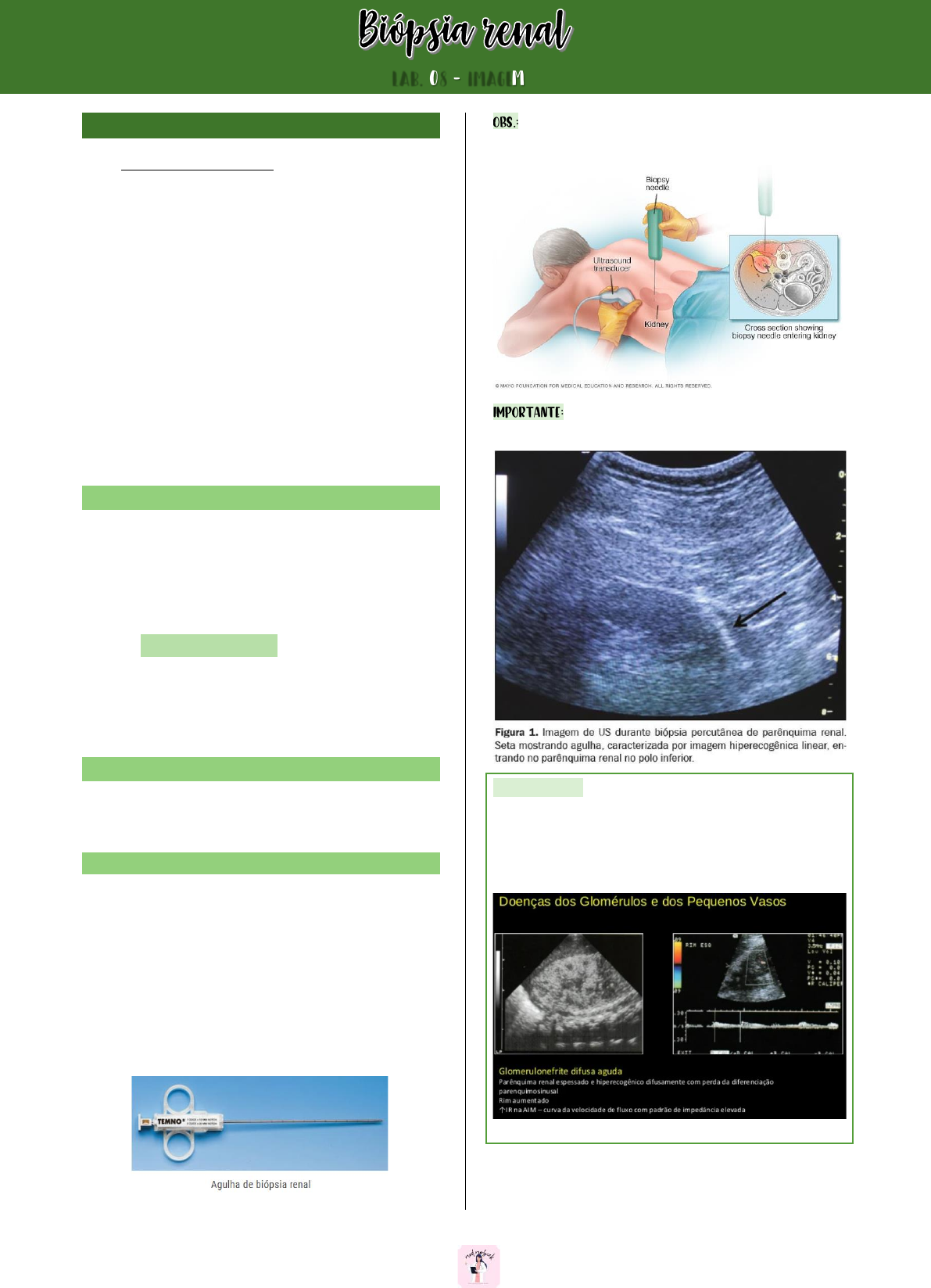 1 Júlia Morbeck – @med.morbeck Biópsia renal ↠ A biópsia renal percutânea, ou biópsia renal, consiste num procedimento utilizado para obter pequenos fragmentos do rim de forma a poderem ser examinados ao microscópio. É importante para determinar a causa, a gravidade, o prognóstico e/ou orientar o tratamento da sua doença renal. ↠ A biópsia renal percutânea permite um método preciso e confiável de aquisição de tecido renal para a avaliação histopatológica ↠ A biópsia pode ser de um rim nativo ou transplantado. Dividido em 2 tipos: • Não focal ou não direcionado. • Focal ou direcionado (doenças focais – tumores). INDICAÇÕES • Lesão focal não caracterizada no diagnóstico por imagem; • Insuficiência renal com causa desconhecida; • Deteriorização de função renal em um paciente transplantado; • PARA LESÕES FOCAIS: malignidade extra-renal conhecida; suspeita de linfoma renal; antes da terapia de ablação; massas renais múltiplas ou bilaterais; dilema diagnóstico ou infecção/massa maligna. CONTRAINDICAÇÕES • Paciente não cooperativo; • Diátese hemorrágica incorrigível; PROCEDIMENTO • Anestesia local • Não precisa ir para o centro cirúrgico, faz na própria enfermaria. • Atualmente, para o procedimento, é preconizado o uso de agulhas 16-gauge. O calibre da agulha tem influência direta na quantidade de glomérulos obtidos, bem como nas taxas de complicações. Evita a área central dos rins – sempre feita no córtex. Em decúbito ventral. Biópsia renal - para pesquisa de glomerupatias - biópsia direcionadas para a região cortical, geralmente guiada por ultrassom. GLOMERULOPATIAS: exames de imagem geralmente são inespecíficos. Na US pode ser observado: sinais de nefropatia (aumento da ecogenicidade cortical (branco). Em casos avançados, sinais de cronicidade (diminuição das dimensões renais, afilamento cortical, perda da diferenciação córtico-medular). LAB. 08 - IMAGEM 2 Júlia Morbeck – @med.morbeck DOENÇA CRÔNICA: parênquima menor e redução volumétrica. BIÓPSIA DE LESÃO FOCAL (NÓDULO RENAL) • Guiada por TC ou por US, dependendo da localização, tamanho do nódulo. • Análise histopatológico para pesquisa de neoplasia. CUIDADOS PÓS-PROCEDIMENTO • Repouso no leito; • Observação do paciente por no mínimo 1 hora; • Questionamento sobre dor ou hematúria; COMPLICAÇÕES ↠ Biopsia renal percutânea continua sendo um procedimento seguro, mas o risco de complicações é maior em pacientes com insuficiência renal avançada. • Hematoma periférico (retroperitoneal) ou intra- renal. • Hematúria. • Fistula arteriovenosa ou pseudoaneurisma. • Lesão colônica e pneumotórax (muitos raros com orientação por imagem). .