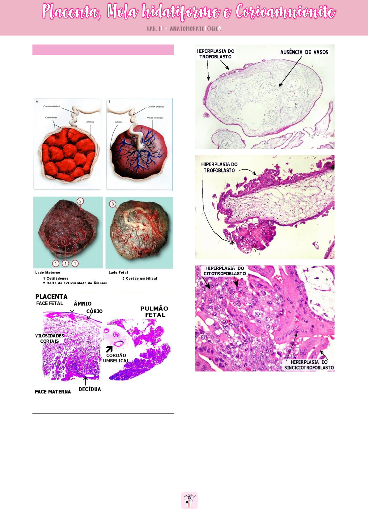 1 Júlia Morbeck – @med.morbeck Placenta FUNÇÕES DA PLACENTA • Troca de produtos metabólicos e gasosos. • Produção de hormônio. MOLA HIDATIFORME • Maioria dos blastocistos anormais, não provoca nenhum sinal de gravidez. • Molas secretam altos níveis de hCG • Cito e sinciciotroflobastos mostram hiperplasia e atipias celulares em graus variáveis – NÃO HÁ FORMAÇÃO DE EMBRIÃO. ↠ Ocorre em uma a cada 1000 ou 2000 gravidezes e caracteriza-se por grande aumento de volume das vilosidades, que se tornam visíveis macroscopicamente e císticas. Microscopicamente, há degeneração hidrópica do tecido conjuntivo da vilosidade, com ausência dos vasos fetais. Tanto o cito- como o sinciciotrofoblasto mostram hiperplasia e atipias celulares em graus variáveis. Não há formação de embrião. Clinicamente, a manifestação mais frequente é no 4º ou 5º mês com sangramento vaginal, aumento excessivo do volume uterino e ausência de batimentos fetais. O tratamento é por curetagem LAB. 10 - ANATOMOPATOLÓGICO 2 Júlia Morbeck – @med.morbeck uterina. A complicação mais séria das molas é a transformação em coriocarcinoma (2% dos casos). O aspecto histológico não permite prever o prognóstico. Assim, as pacientes devem ser acompanhadas periodicamente com dosagem de gonadotrofina coriônica humana no plasma (b-HCG); aumento dos níveis sugere que um remanescente de mola se tenha transformado em coriocarcinoma. CORIOAMNIONITE ↠ Infecção mais comum da placenta. ↠ Ruptura precoce da bolsa amniótica, que contém o feto → entrada de bactérias. • O âmnio mostra espessa camada de exsudato fibrino-purulento e o epitélio amniótico normal praticamente desapareceu. A corioamnionite é a infecção mais comum da placenta e decorre da ruptura precoce da bolsa amniótica, que contém o feto. A ruptura leva à perda do líquido amniótico (relatada pela paciente) e permite a entrada de bactérias na cavidade amniótica, provenientes da vagina. Isto causa uma infecção aguda do âmnio (membrana fina revestida por epitélio cúbico) e do cório (tecido conjuntivo vascularizado), ambos de origem fetal, resultando em exsudato purulento que recobre a face fetal da placenta e o cordão umbilical. ↠ O restante desta placenta tem aspecto normal e compatível com o segundo trimestre da gestação. A superfície materna da placenta é chamada de placa basal (enquanto que a superfície fetal chama-se placa coriônica). ↠ VILOSIDADES CORIONAIS: As vilosidades coriais são formadas por uma haste central conjuntiva, onde estão os vasos fetais, e que é recoberta por cito e sincíciotrofoblasto. O sangue fetal que passa pelos vasos das vilosidades faz trocas com o sangue materno que circula no espaço interviloso e banha as vilosidades. À 3 Júlia Morbeck – @med.morbeck medida que a gravidez avança, o número de vasos nas vilosidades aumenta e diminui o tecido mesenquimal, facilitando as trocas.