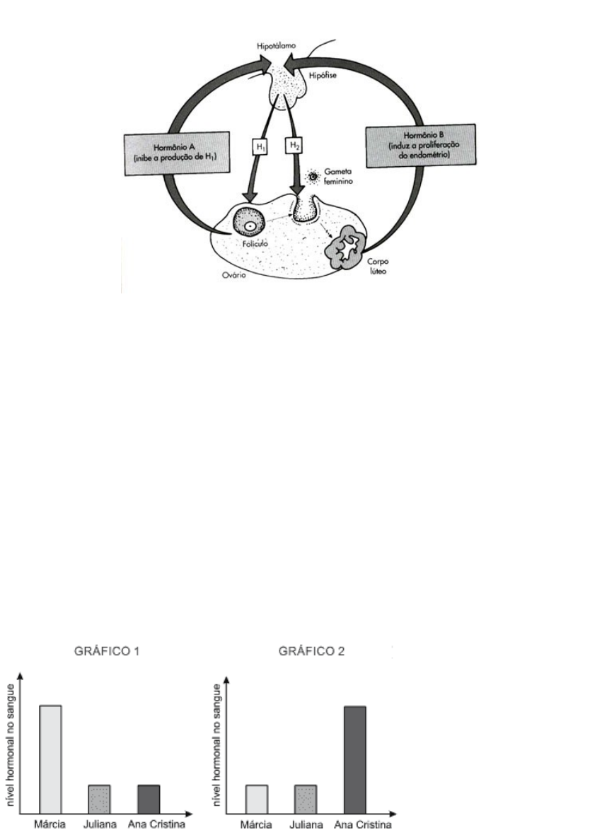 Prova de Fisiologia dos Animais Domésticos – Veterinária A Nome:___________________________________________________ Data:___/___/___ 1) Observe o esquema e responda aos itens. a) Tendo por base as informações contidas no esquema, identifique os hormônios denominados H1, H2, A e B. b) Qual a função do hormônio H1? c) Quais os efeitos do hormônio H2? d) Além de inibir a produção de H1, que outros efeitos o hormônio A tem sobre o organismo feminino? e) Qual o efeito do aumento da taxa do hormônio B sobre a produção hormonal da hipófise? 2) Em relação à reprodução, é correto afirmar que: a) FSH e LH são hormônios ovarianos responsáveis pelo amadurecimento e pela liberação dos folículos. b) estrógenos produzidos nas gônadas são responsáveis, dentre outras funções, pela determinação de características sexuais secundárias. c) as pílulas anticoncepcionais agem, principalmente, impedindo a menstruação e, consequentemente, a fecundação. d) o corpo amarelo a uma estrutura formada no útero e a sua presença é indicativa de fecundação. 3) Márcia, Juliana e Ana Cristina são três amigas. Uma delas está amamentando, outra está entrando em seu período fértil e a terceira está no final de seu ciclo menstrual. Os gráficos 1 e 2 apresentam os níveis dos hormônios luteinizante (LH) e ocitocina no sangue dessas mulheres. Se o gráfico 1 referir-se aos níveis de a. LH e o gráfico 2 aos níveis de ocitocina, Ana Cristina está entrando em período fértil, Márcia está no final de seu ciclo menstrual e Juliana está amamentando. b. LH e o gráfico 2 aos níveis de ocitocina, Juliana está entrando em período fértil, Ana Cristina está no final de seu ciclo menstrual e Márcia está amamentando. c. ocitocina e o gráfico 2 aos níveis de LH, Ana Cristina está entrando em período fértil, Márcia está no final de seu ciclo menstrual e Juliana está amamentando. d. ocitocina e o gráfico 2 aos níveis de LH, Márcia está entrando em período fértil, Juliana está no final de seu ciclo menstrual e Ana Cristina está amamentando. e. LH e o gráfico 2 aos níveis de ocitocina, Márcia está entrando em período fértil, Juliana está no final de seu ciclo menstrual e Ana Cristina está amamentando. 4) Qual a sequência do primeiro ciclo estral da vaca após o parto? a. Anestro, diestro, estro, metaestro, proestro b. Proestro, metaestro anestro, estro, diestro, c. Anestro, metaestro, diestro, estro, proestro d. Proestro, diestro, estro, proestro, anestro. e. Anestro, proestro, estro, metestro, diestro 5)Que tipo celular é a fonte primária de produção de testosterona nos homens, promovendo a espermatogênese nos túbulos seminíferos? a.Células de Sertoli b.Espermatogônia c.Células de Leydig d.Espermatócito primário e.Espermatozoide 6) A caxumba é uma doença viral que acomete as glândulas salivares parótidas, mas, em alguns homens, a infecção alcança os testículos e epidídimo, promovendo distúrbios na função destas estruturas, podendo resultar na esterilidade. Os elementos em destaque no enunciado são responsáveis, respectivamente, pelas seguintes funções: a. produção de hormônio folículo estimulante e ereção peniana. b.produção de espermatozoides e armazenamento dos espermatozoides. c.produção de hormônio luteinizante e produção do liquido seminal. d.espermiogênese e produção do liquido prostático. e.ejaculação e produção do hormônio luteinizante. 7) Observe o gráfico a seguir. Esse gráfico representa as variações das taxas dos hormônios hipoflsários (FSH e LH) e hormônios sexuais (estrógeno e progesterona) presentes no sangue durante o ciclo menstrual. A respeito do gráfico, considere as seguintes afirmações: I. A ação do hormônio FSH e o pico de LH estimulam a ovulação, promovendo a liberação do óvulo. II. As curvas dos hormônios podem comprovar que houve fecundação. III. A queda das taxas hormonais no fim do ciclo indica que ocorrerá menstruação A(s) afirmativa(s) correta(s) é(são): a.I e II b.I e III c.II e III d.somente II e.somente III 8) Observe o desenho abaixo, que representa um espermatozoide humano. Em seguida, analise as proposições e coloque V para as Verdadeiras e F para as Falsas. ( ) A estrutura 1 é o acrossomo, estrutura formada pela fusão de vesículas do complexo de golgi e que contém enzimas que irão digerir os envoltórios do ovócito na fecundação. ( ) A estrutura 2 é a peça intermediária e apresenta muitas mitocôndrias, responsáveis pela liberação da energia necessária a movimentação do espermatozoide. ( ) A estrutura 3 é a cauda, originada a partir do centríolo. ( ) A estrutura 4 é o núcleo, que traz em seu interior os cromossomos pareados. ( ) 5 representa a cabeça do espermatozoide, onde encontramos o capuz acrossômico e o núcleo. A alternativa que apresenta a sequência correta é: a.V - F - F - F - V b.V - V - V - V - V c.F - F - V - V - V d.V - V - V - F - V e.V - V - V - F - F 9) Suponha a existência de dois tipos de uma mesma espécie de verme: um, que se reproduz assexuadamente, por brotamento, e outro, que é sexuado. Ambos vivem em um mesmo lago, também habitado por uma bactéria que provoca uma doença nesses vermes. A espécie assexuada é mais frequentemente atacada por essa bactéria. Após um período de seca, no qual a população desse verme foi drasticamente reduzida, observou-se que os indivíduos sexuados passaram a ser mais atacados pelas bactérias do que os assexuados. Considere as afirmações a seguir. I. A reprodução sexuada, devido à variabilidade genética que ela proporciona, garantia uma maior resistência à infecção pela bactéria; II. A diminuição da população de vermes no lago, em consequência da seca, resultou na diminuição dessa variabilidade genética, tornando a população mais vulnerável à infecção pelas bactérias; III. Com a seca, os indivíduos assexuados se tornaram 