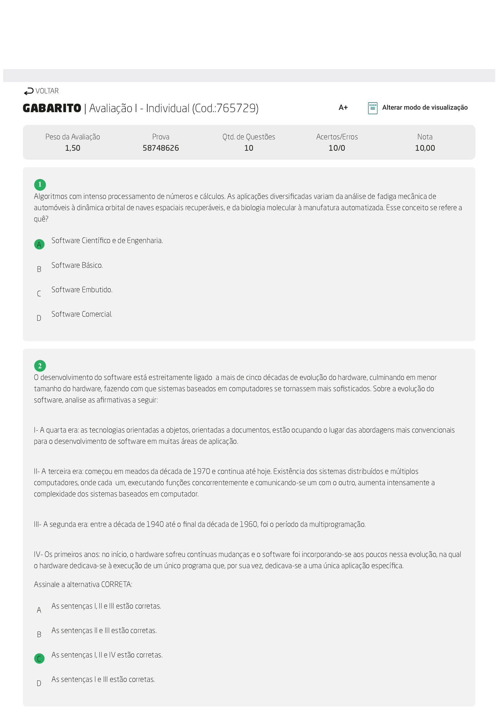 03/07/23, 11:05 AVA https://ava2.uniasselvi.com.br/subject/grades-and-tests/answer-book/eyJ0ZXN0Ijp7InRlc3RDb2RlIjoiNzY1NzI5IiwiZGVzY3JpcHRpb24iOiJBdmFsaWHDp8OjbyBJIC0gSW5kaXZpZHVhbCIsInBhcmFtZXRlciI6MTI5Mj… 1/5 GABARITO | Avaliação I - Individual (Cod.:765729) Peso da Avaliação 1,50 Prova 58748626 Qtd. de Questões 10 Acertos/Erros 10/0 Nota 10,00 Algoritmos com intenso processamento de números e cálculos. As aplicações diversificadas variam da análise de fadiga mecânica de automóveis à dinâmica orbital de naves espaciais recuperáveis, e da biologia molecular à manufatura automatizada. Esse conceito se refere a quê? A Software Científico e de Engenharia. B Software Básico. C Software Embutido. D Software Comercial. O desenvolvimento do software está estreitamente ligado a mais de cinco décadas de evolução do hardware, culminando em menor tamanho do hardware, fazendo com que sistemas baseados em computadores se tornassem mais sofisticados. Sobre a evolução do software, analise as afirmativas a seguir: I- A quarta era: as tecnologias orientadas a objetos, orientadas a documentos, estão ocupando o lugar das abordagens mais convencionais para o desenvolvimento de software em muitas áreas de aplicação. II- A terceira era: começou em meados da década de 1970 e continua até hoje. Existência dos sistemas distribuídos e múltiplos computadores, onde cada um, executando funções concorrentemente e comunicando-se um com o outro, aumenta intensamente a complexidade dos sistemas baseados em computador. III- A segunda era: entre a década de 1940 até o final da década de 1960, foi o período da multiprogramação. IV- Os primeiros anos: no início, o hardware sofreu contínuas mudanças e o software foi incorporando-se aos poucos nessa evolução, na qual o hardware dedicava-se à execução de um único programa que, por sua vez, dedicava-se a uma única aplicação específica. Assinale a alternativa CORRETA: A As sentenças I, II e III estão corretas. B As sentenças II e III estão corretas. C As sentenças I, II e IV estão corretas. D As sentenças I e III estão corretas. VOLTAR A+ Alterar modo de visualização 1 2 Jean Marcel Belizario Análise e Desenvolvimento de Sistemas (4945774) 0 03/07/23, 11:05 AVA https://ava2.uniasselvi.com.br/subject/grades-and-tests/answer-book/eyJ0ZXN0Ijp7InRlc3RDb2RlIjoiNzY1NzI5IiwiZGVzY3JpcHRpb24iOiJBdmFsaWHDp8OjbyBJIC0gSW5kaXZpZHVhbCIsInBhcmFtZXRlciI6MTI5Mj… 2/5 A Engenharia de Software é dividida em dez áreas de conhecimento, segundo o SWEBOK. Uma delas é uma área que envolve definição da arquitetura, componentes, interfaces e outras características de um componente ou sistema. Analisando como um processo, esta é uma etapa do ciclo de vida da ES, onde é processada a análise dos requisitos com o objetivo de produzir uma descrição da arquitetura do software, ou seja, de forma interativa, os requisitos são traduzidos em um documento para construção do software. De que área estamos falando? A Design de Software. B Teste de Software. C Construção de Software. D Manutenção de Software. Observe o gráfico a seguir: O que o gráfico aponta? A Curva de falhas do software (idealizada). B Curvas de falhas para o hardware. C Curva de falhas real para o software. D Curva de falhas real para o software e o hardware. A aplicação da Engenharia de Software segue uma abordagem bem completa, onde são recomendados caminhos como referência para sua correta e benéfica utilização. Em diversos livros são apresentados como introdução à Engenharia de Software alguns princípios gerais aplicados durante toda a fase de desenvolvimento de software, da importância de algumas propriedades gerais dos processos e produtos. Existem 12 princípios da Engenharia de Software. Separar a solução em componentes bem definidos funcionais e lógicos, com interfaces bem definidas que não compartilham estados e se comunicam por troca de mensagens contendo dados é um desses princípios. A qual princípio essa descrição pertence? A Rastreabilidade. B Arquiteturas baseadas em componentes. C Desenvolvimento iterativo. 3 4 5 Jean Marcel Belizario Análise e Desenvolvimento de Sistemas (4945774) 0 03/07/23, 11:05 AVA https://ava2.uniasselvi.com.br/subject/grades-and-tests/answer-book/eyJ0ZXN0Ijp7InRlc3RDb2RlIjoiNzY1NzI5IiwiZGVzY3JpcHRpb24iOiJBdmFsaWHDp8OjbyBJIC0gSW5kaXZpZHVhbCIsInBhcmFtZXRlciI6MTI5Mj… 3/5 D Gerenciamento de requisitos. O processo de Engenharia de Software se divide em quatro fases que indicam a ênfase que é dada no projeto em um dado instante. Com relação às quatro fases, associe os itens, utilizando o código a seguir: I- Fase de Iniciação. II- Fase de Elaboração. III- Fase de Construção. IV- Fase de Transição. ( ) Essa fase tem como objetivo principal o planejamento do projeto. ( ) Essa fase tem como objetivo principal a realização da análise do projeto. ( ) Essa fase tem como objetivo principal a materialização da análise. ( ) Essa fase tem como objetivo principal realizar a entrega do projeto. Assinale a alternativa que apresenta a sequência CORRETA: A I - II - III - IV. B II - III - I - IV. C IV - III - II - I. D IV - II - III - I. A evolução do software perpassou por diversas aplicações. Sobre elas, associe os itens, utilizando o código a seguir: I- Os primeiros anos (1950 até 1960). II- A segunda era (1960 até 1970). III- A terceira era (1970 até hoje). IV- A quarta era (apenas começando). ( ) O hardware dedicava-se à execução de um único programa que, por sua vez, dedicava-se a uma única aplicação específica e usava uma orientação batch (em lote) para a maioria dos sistemas. ( ) Sistemas multiusuários ofereceram sofisticação de software e hardware, melhorando a interação homem-máquina, foi o período da multiprogramação. 6 7 Jean Marcel Belizario Análise e Desenvolvimento de Sistemas (4945774) 0 03/07/23, 11:05 AVA https://ava2.uniasselvi.com.br/subject/grad