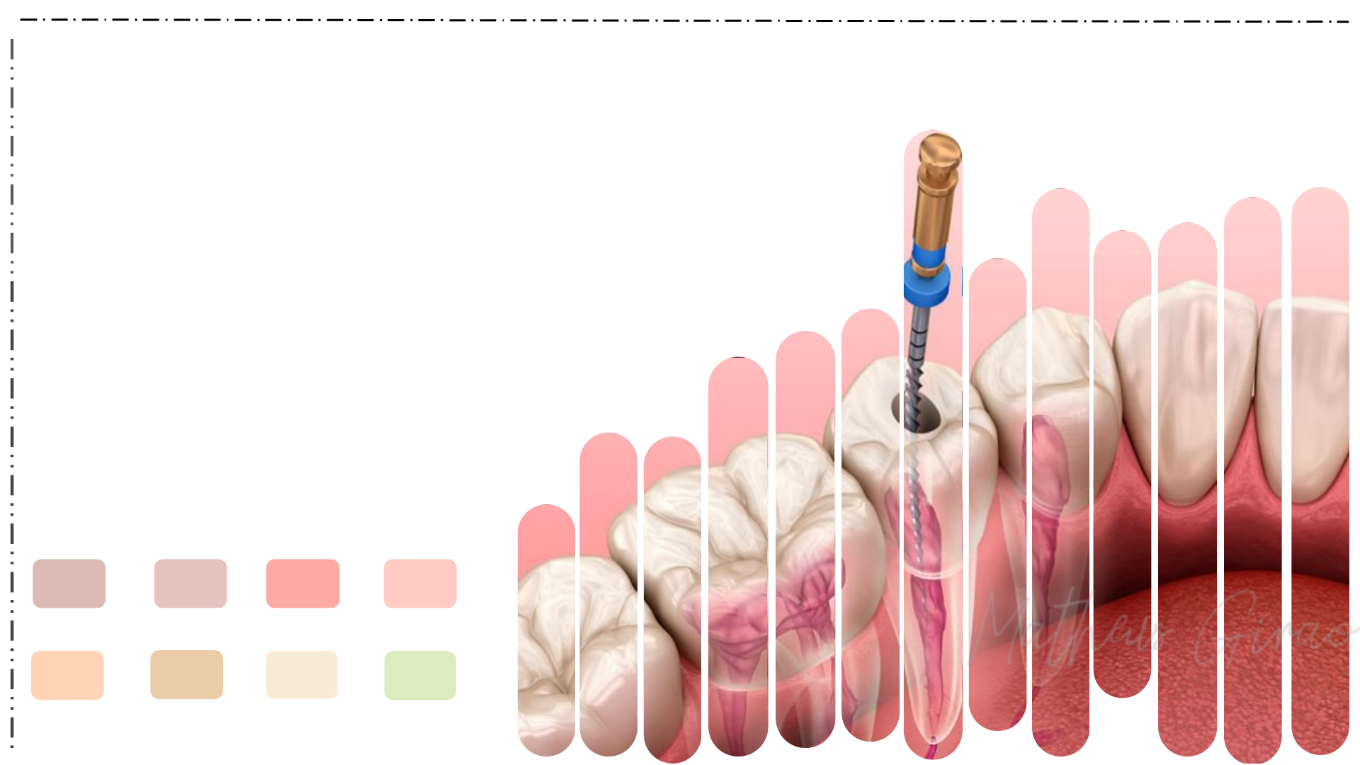 Matheus Girao Preparo quImico- cirurgico na endondontia PRE-CLÍNICA III Matheus Girao SUMÁRIO MONITORIA PRÉ-CLÍNICA III PENETRAÇÃO DESINFECTANTE PREPARO CERVICAL ODONTOMETRIA DETERMINACÃO DO D.A. PATÊNCIA FORAMINAL PREPARO APICAL RECUOS PROGRAMADOS INTRODUÇÃO Matheus Girao MONITORIA PRÉ-CLÍNICA III Preparo de forma cônico-afunilado em sentido apical Preparo no interior do canal dentinário Manter a forma original do canal Manter a posição foraminal Canal tem que estar limpo, seco e modelado Matheus Girao MONITORIA PRÉ-CLÍNICA III Matheus Girao MONITORIA PRÉ-CLÍNICA III Presença de bactérias anaeróbias. Biofilme mais comum: Placa bacteriana. Causas mais comum são dor, exsudato, edema, fístula. Remover cirurgicamente ou quimicamente. Istmo: Achatamento entre dois canais. Matheus Girao MONITORIA PRÉ-CLÍNICA III Visa a obtenção de um canal radicular de formato cônico contínuo, com o menor diâmetro apical e o maior em nível coronário. Facilitar a obturação. Matheus Girao MONITORIA PRÉ-CLÍNICA III { { { – Matheus Girao MONITORIA PRÉ-CLÍNICA III REMOÇÃO CATETERISMO LIMAGEM ALARGAMENTO PARCIAL Remover a polpa Limpeza inicial Instrumentação cervical de canais achatados Canais retor e/ou curvos Dentritos livres no interior do canal Odontometria Instrumentação anti- curvatura IAI Bolinhas de algodão e cones de papel Definição do D.A do CRT Uso em canais atresiados no início da instrumentação Avanço do instrumento em direção apical de canais atresiados (cateterismo) Remoção de material obturador nos retratamentos Verificar presença de corpos estranhos, desvios, perfurações... Matheus Girao MONITORIA PRÉ-CLÍNICA III CAD – Comprimento Aparente do Dente. CRD – Comprimento Real do Dente. CRT – Comprimento Real de Trabalho. DA – Diâmetro Anatômico. IAI – Instrumentação Apical Inicial. LAI – Lima Apical Inicial. IM – Instrumento Memória. GG – Gates Glidden. CRD = CRT + 1mm CRT = CRD - 1mm Matheus Girao MONITORIA PRÉ-CLÍNICA III Polpa Morta x Polpa Viva. É utilizado limas finas: K#08; K#10; K#15. Movimentos de cateterismo/remoção. Penetrar até 2/3 do CAD. É importante verificar a direção do canal, possíveis calcificações e neutralizar conteúdo infectado do canal. Matheus Girao MONITORIA PRÉ-CLÍNICA III É utilizado as brocas Gates-Glidden até 2/3 do CAD. Realizar movimentos de bicada (máximo 3 segundos). Remover interferências cervicais e concrescências dentinárias. Neutralizar o conteúdo injetado no canal. DENTES AMPLOS G. 5-4-3 DENTES MÉDIOS G. 4-3-2 DENTES ESTREITOS G. 3-2-1 Matheus Girao MONITORIA PRÉ-CLÍNICA III É utilizado limas finas: K#08; K#10; K#15. Movimento de Cateterismo. Verificar CRT. Verificar possíveis calcificações apicais. Neutralizar conteúdo infectado do canal. Matheus Girao MONITORIA PRÉ-CLÍNICA III Limas sequenciais de acordo com a curvatura da raiz. Movimentos de cateterismo. Penetrar no CRT. Identificar o diâmetro anatômico da costrição apical. Neutralizar o conteúdo infectado do canal. D.A CORRESPONDE AO PRIMEIRO INSTRUMENTO QUE ALCANÇA O CRT DE FORMA AJUSTADA, APRESENTANDO RESISTÊNCIA A SUA ROTAÇÃO. Matheus Girao MONITORIA PRÉ-CLÍNICA III Ultilizar uma lima fina K#08; K#10; K#15. Movimentos de Cateterismo até o CRD. Desobstruir o forame apical. Impedir o efeito Vapor Look. Neutralizar o conteúdo do canal infectado. A patência é utilizada a cada instrumento com o intuito de deixar o canal livre. Matheus Girao MONITORIA PRÉ-CLÍNICA III Utilizar 3 limas sequenciais após o D.A. Realizar movimentos de alargamento parcial, penetrando no CRT. Tem como objetivo neutralizar o conteúdo infectado do canal e confeccionar o batente apical. Ex: D.A + 3 Limas 30 – 35 – 40 – 45. Matheus Girao MONITORIA PRÉ-CLÍNICA III Ultilizar 3 limas sequências após o I.M. Realizar movimentos de alargamento parcial e limagem. Penetrar no CRT -1mm; CRT -2mm; CRT -3mm. Neutralizar conteúdo infectado do canal. Conferir conicidade ao canal cirúrgico. Ex: D.A + 3 Limas I. M + 3 Limas 30 – 35 – 40 – 45 I.M 45 – 50 – 55 – 60 (CRT) (-1mm) (-2mm) (-3mm) O IM ESTÁ INTIMAMENTE RELACIONADO COM A ETAPA DE ESCOLHA DO CONE DE GUTA-PERCHA DUARANTE A OBTURAÇÃO. Matheus Girao MONITORIA PRÉ-CLÍNICA III Paciente G.H.L. , sexo masculino, 25 anos. Chegou ao consultório do Dr. Victor para uma consulta de rotina, no exame clínico foi observado uma grande lesão cariosa no dente 13. Ao teste do frio apresentou resposta negativa ao estímulo. O CRD era de 25 mm e o IM era de 55. Matheus Girao MONITORIA PRÉ-CLÍNICA III Qual o diagnóstico pulpar? Qual o CRT? Qual GG irei usar? Qual o DA? Quais limas irei utilizar no Preparo Apical? Quais limas irei utilizar nos Recuos Programados? Matheus Girao referencias MONITORIA PRÉ-CLÍNICA III Horário de Atendimento: Terça-Feira 14:00 às 15:00 (85) 99730-8480 Matheus Girao MONITORIA PRÉ-CLÍNICA III