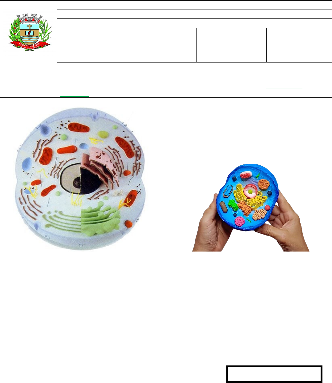©PROFESSOR WILLIAM DE ASSIS REDE MUNICIPAL DE ENSINO DE CESÁRIO LANGE E.M.E.F. “NATAN PIRES DA SILVA” AVALIAÇÃO BIMESTRAL* – 2º BIMESTRE PROFESSOR(ª): WILLIAM DE ASSIS DISCIPLINA: CIÊNCIAS DATA: ___/06/2023 ALUNO: Nº: ANO/TURMA: 6ºB “ESTUDAR ABRE PORTAS QUE ULTRAPASSAM O CONHECIMENTO E TRAZEM RESULTADOS QUE PODEMOS VER E SEGURAR COM AS NOSSAS MÃOS!” MARIANNA MORENO DURANTE AS NOSSAS AULAS DE CIÊNCIAS, NO 2º BIMESTRE, FALAMOS SOBRE A CÉLULA. AS CÉLULAS SÃO OS TIJOLINHOS QUE FORMAM OS SERES VIVOS, OU SEJA, AQUELES QUE RESPIRAM, QUE ANDAM, QUE CORREM, QUE FALAM, QUE NADAM, QUE VOAM, QUE SE DESENVOLVEM (AS PLANTINHAS), ENTRE OUTROS, DIFERENTE DOS SERES QUE NÃO TEM VIDA E QUE NÃO SÃO FORMADOS POR CÉLULAS. 1-EM GRUPO, NÓS MONTAMOS UM MODELINHO DE CÉLULA, PINTAMOS E ENCAIXAMOS AS ORGANELAS (OS ÓRGÃOZINHOS DA CÉLULA E QUE FAZEM COM QUE ELA FUNCIONE). MARQUE UM “X” NOS MATERIAIS QUE VOCÊ SE LEMBRA QUE NÓS UTILIZAMOS NO TRABALHO:MARQUE O “X” AQUI TINTA GUACHE MASSINHA TESOURA GARRAFAS PET COLA QUENTE 2-DAS IMAGENS ABAIXO, PINTE AQUELA QUE REPRESENTA UMA CÉLULA: 3-OBSERVE AS IMAGENS A SEGUIR E PINTE OS SERES VIVOS (OS QUE SÃO FORMADOS POR CÉLULAS) E CIRCULE O SER QUE NÃO TEM VIDA (QUE NÃO SÃO FORMADOS POR CÉLULAS): 4-EM NOSSO AMBIENTE, TEMOS: 1 SERES VIVOS, OS QUE TÊM VIDA E SÃO FORMADOS POR CÉLULAS; 2 SERES SEM VIDA, OS QUE NÃO TÊM VIDA E NÃO SÃO FORMADOS POR CÉLULAS. OBSERVE AS FIGURAS ABAIXO E COLOQUE O NÚMERO CORRESPONDENTE NO RETÂNGULO AO LADO DE CADA UMA DELAS: 5-LIGUE AO CENTRO SOMENTE AQUELES QUE SÃO SERES VIVOS: BOA PROVA, TURMINHA ! ! ! PROVA ADAPTADA* 2