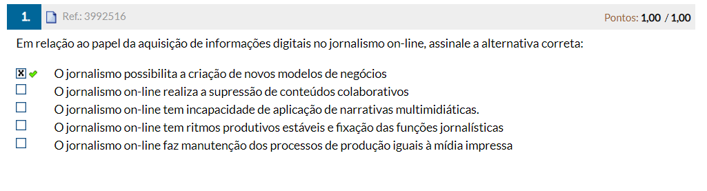 a) jornalismo possibilita a criação de novos modelos de negócios b) jornalismo on-line realiza a supressão de conteúdos colaborativos c) jornalismo on-line tem incapacidade de aplicação de narrativas multimidiáticas. d) jornalismo on-line tem ritmos produtivos estáveis e fixação das funções jornalísticas e) jornalismo on-line faz manutenção dos processos de produção iguais à mídia impressa