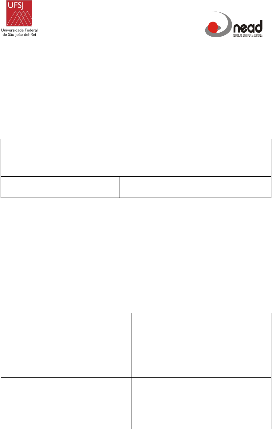 UNIVERSIDADE FEDERAL DE SÃO JOÃO DEL-REI – UFSJ NÚCLEO DE EDUCAÇÃO À DISTÂNCIA GRADUAÇÃO EM FILOSOFIA TAREFA 1 DATA: 29/03/2020 NOME DO ALUNO: Heberton Camilo de Freitas POLO: Patos de Minas DISCIPLINA: Didática Geral TUTOR: Horacio Rosa Elabore uma tabela comparativa em que, em uma coluna, você coloque as características de uma aula bem tradicional e na outra coluna as características de uma aula alternativa tendo como base o texto da disciplina. Considere como parâmetro, entre outras, as seguintes características: a postura do professor; a postura do aluno; atividades trabalhadas; disposição de carteiras; tarefas para casa; relação professor-aluno; relação escola e pais etc. QUADRO COMPARATIVO Aula tradicional Aula alternativa Um distanciamento entre alunos e professores devido o cargo que o professor exerce, tornando-o autoridade incontestável. Professor e alunos têm proximidade e trocam conhecimentos entre si, fazendo com que a aula seja mais rentável na busca de conhecimento. Provas e avaliações que não deixam o aluno criar conteúdo e que já vem com respostas prontas, inibindo assim a criatividade do aluno Buscar metodologias de avaliação, que levem em conta a criatividade e a participação em sala de aula, que despertem o interesse pela busca do conhecimento no aluno e instigue o professor. Professor e alunos têm papéis delimitados e rígidos. os alunos estão na escola apenas para aprender e o professores apenas para ensinar, Todos estão para aprender coisas novas e aperfeiçoar o conhecimento em uma troca mútua que conduzam ao desenvolvimento. Ficar preso ao conhecimento pronto e já formado com os seus métodos de respostas prontas, fazendo com que o ensino seja metodicamente fechado. Incentivar os alunos a criar e buscar novas formas de obter conhecimentos, despertando a curiosidade e o interesse por novas coisas. Aulas pensadas apenas no coletivo, sem levar em consideração a individualidade e necessidades específica de cada aluno. Aulas planejadas de forma individual levando em consideração as dificuldades de cada aluno, conforme sua necessidade de aprendizagem.